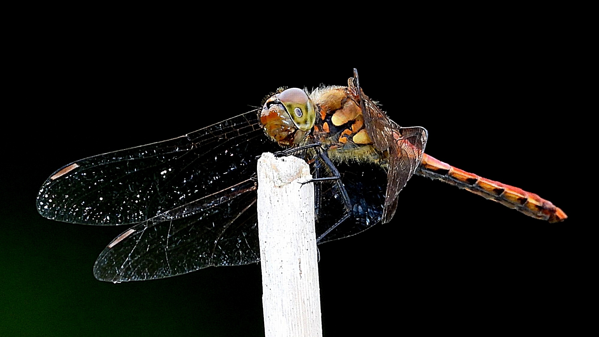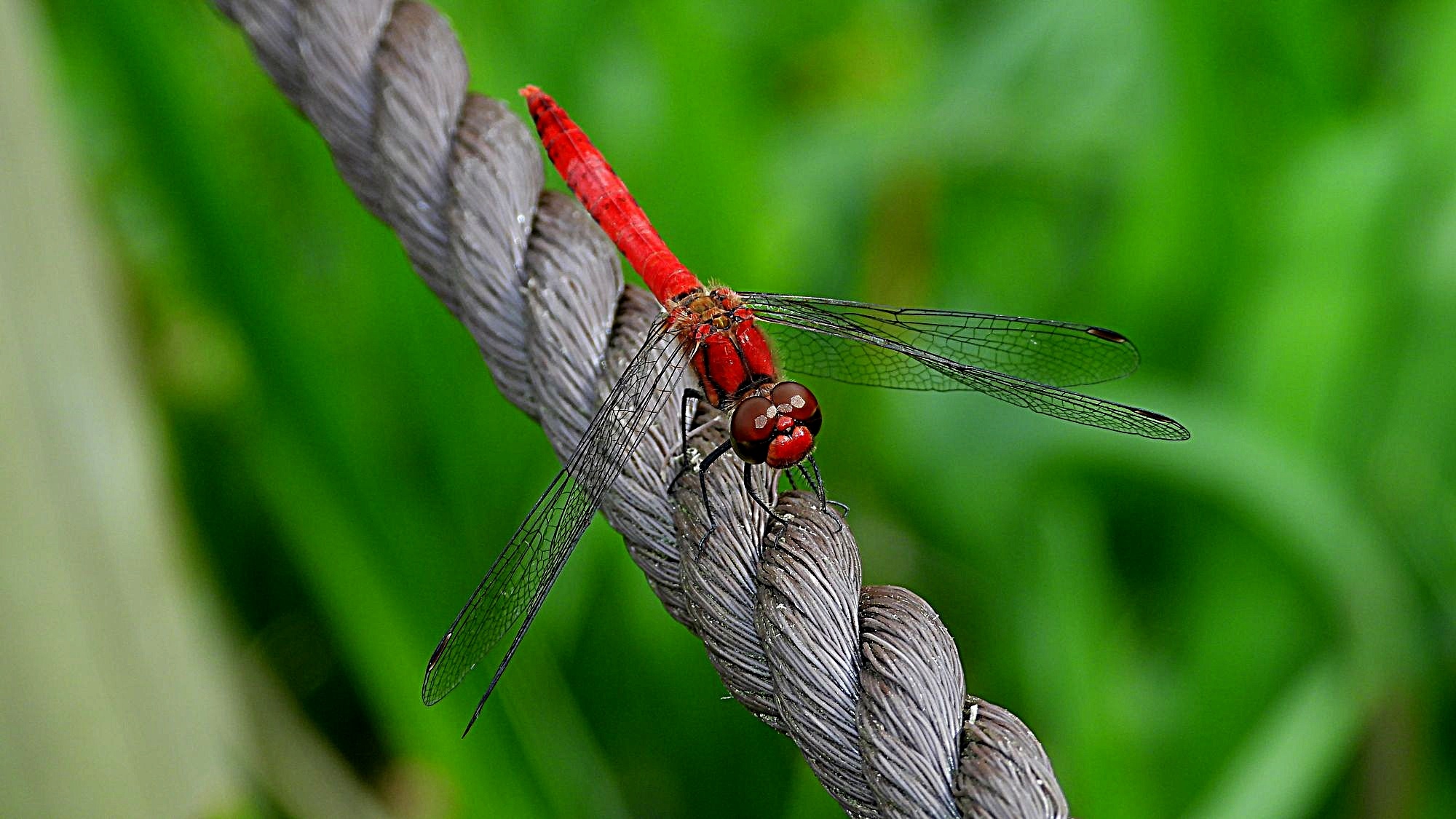 アキアカネ作品は、斜め上からロープに止まった所を捉え、トンボの頭上にも目がるように見え、とても頭部を鮮明に撮られお見事です。