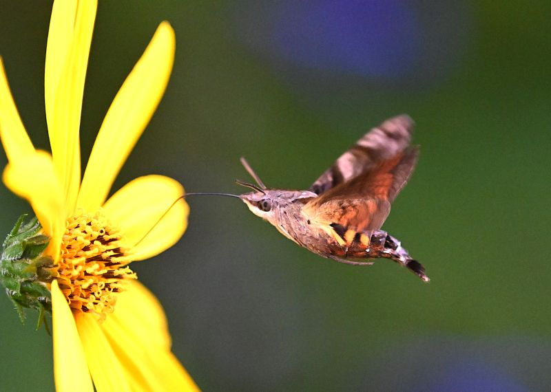 ホシホウジャク3作品は、ホバーリングしながら鮮やかな黄色と青の花の蜜を吸う所を捉えて見応えがあります。