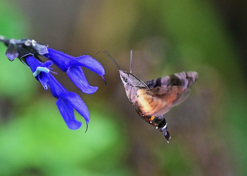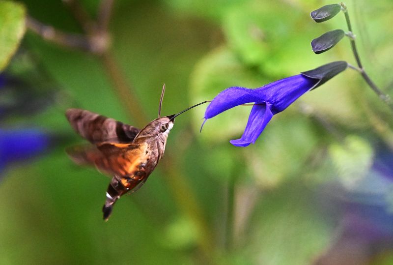 オオスカシバ作品は、カリガネソウの花の蜜を吸おうと飛来した所のホバーリングを見事に撮られ、バックが抜けて一層引き立っています。