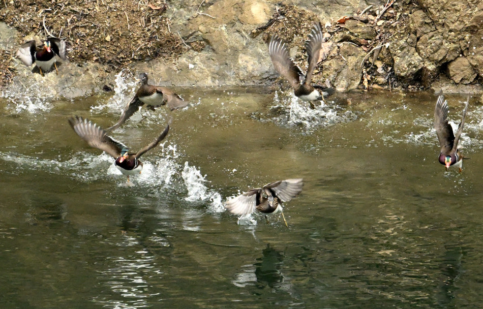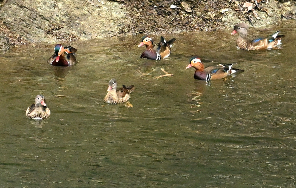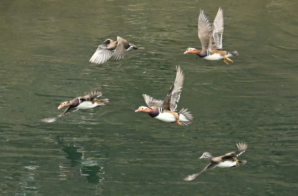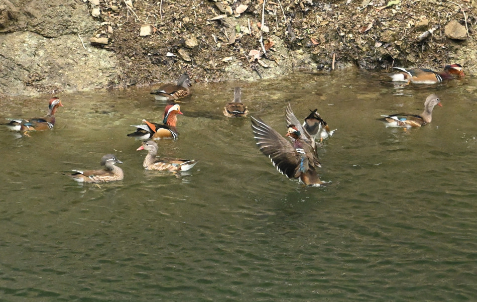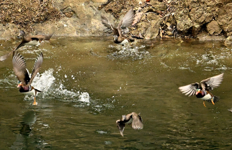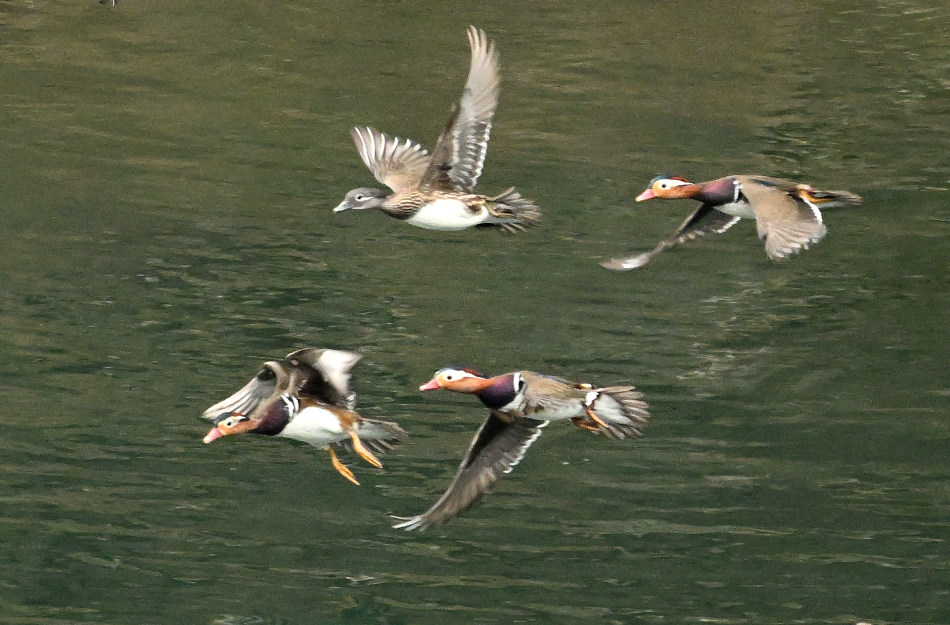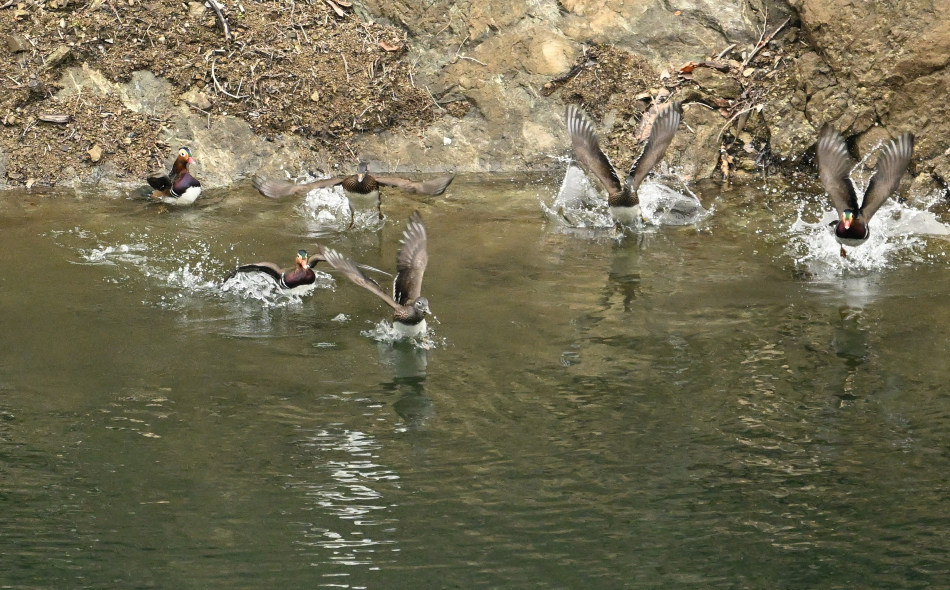 上3作品は、谷底の湖水に浮いたオシドリ雄雌を捉え、賑やかな光景で発色が綺麗です。