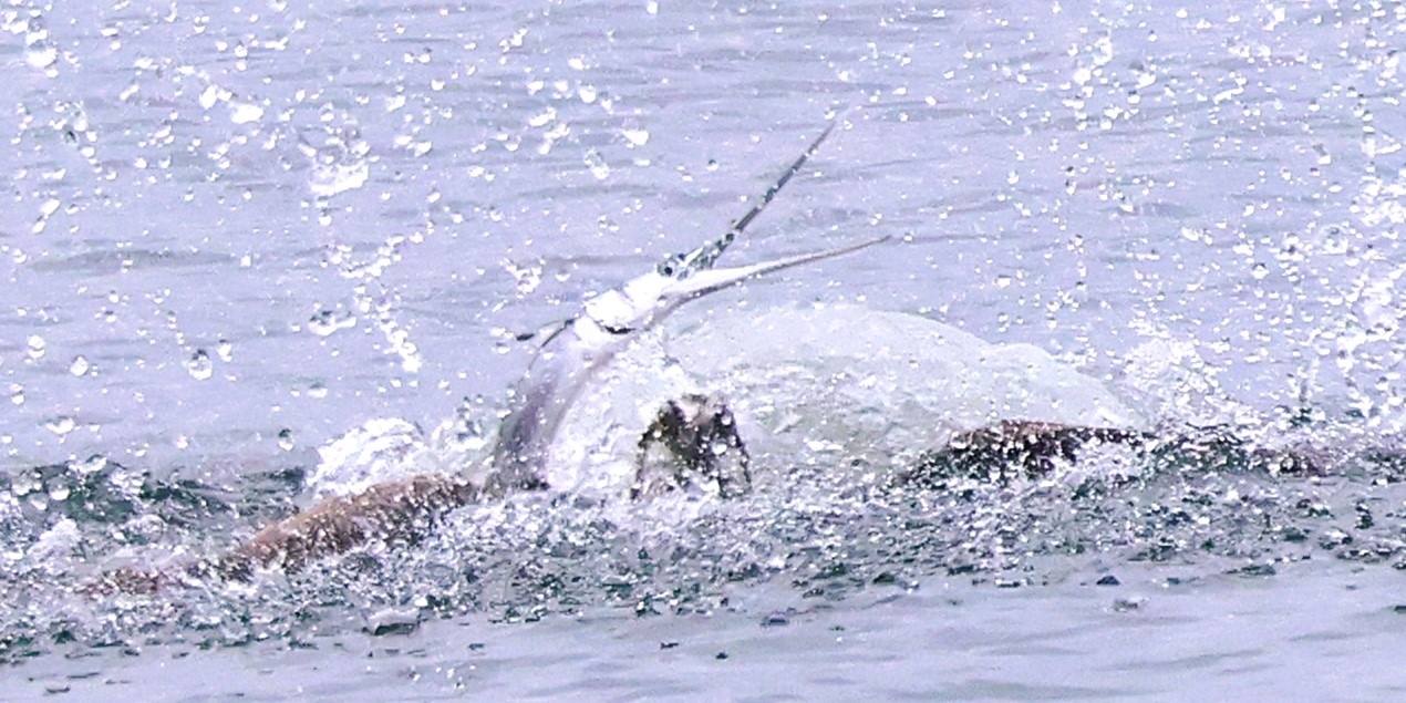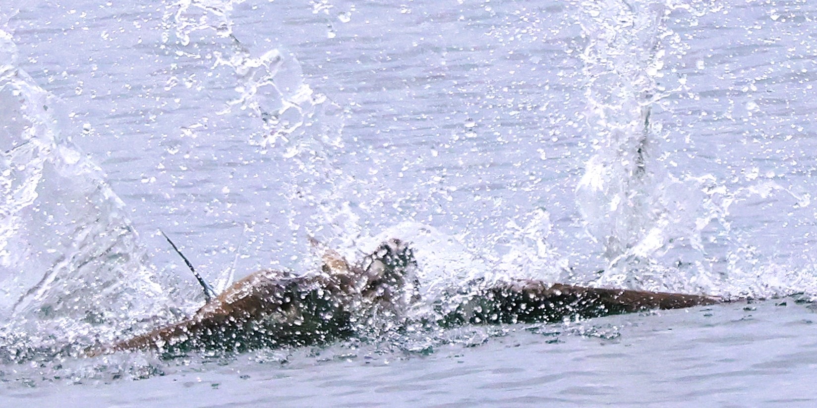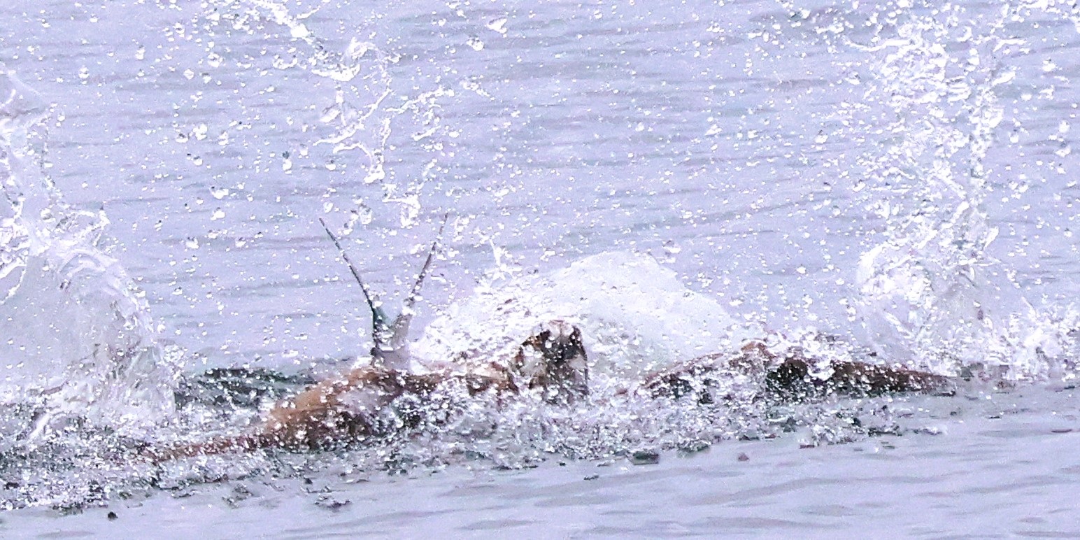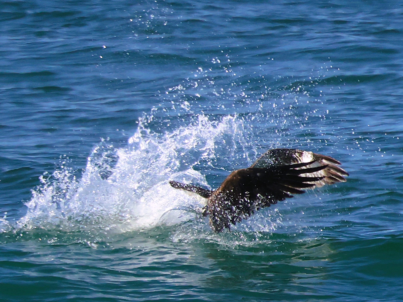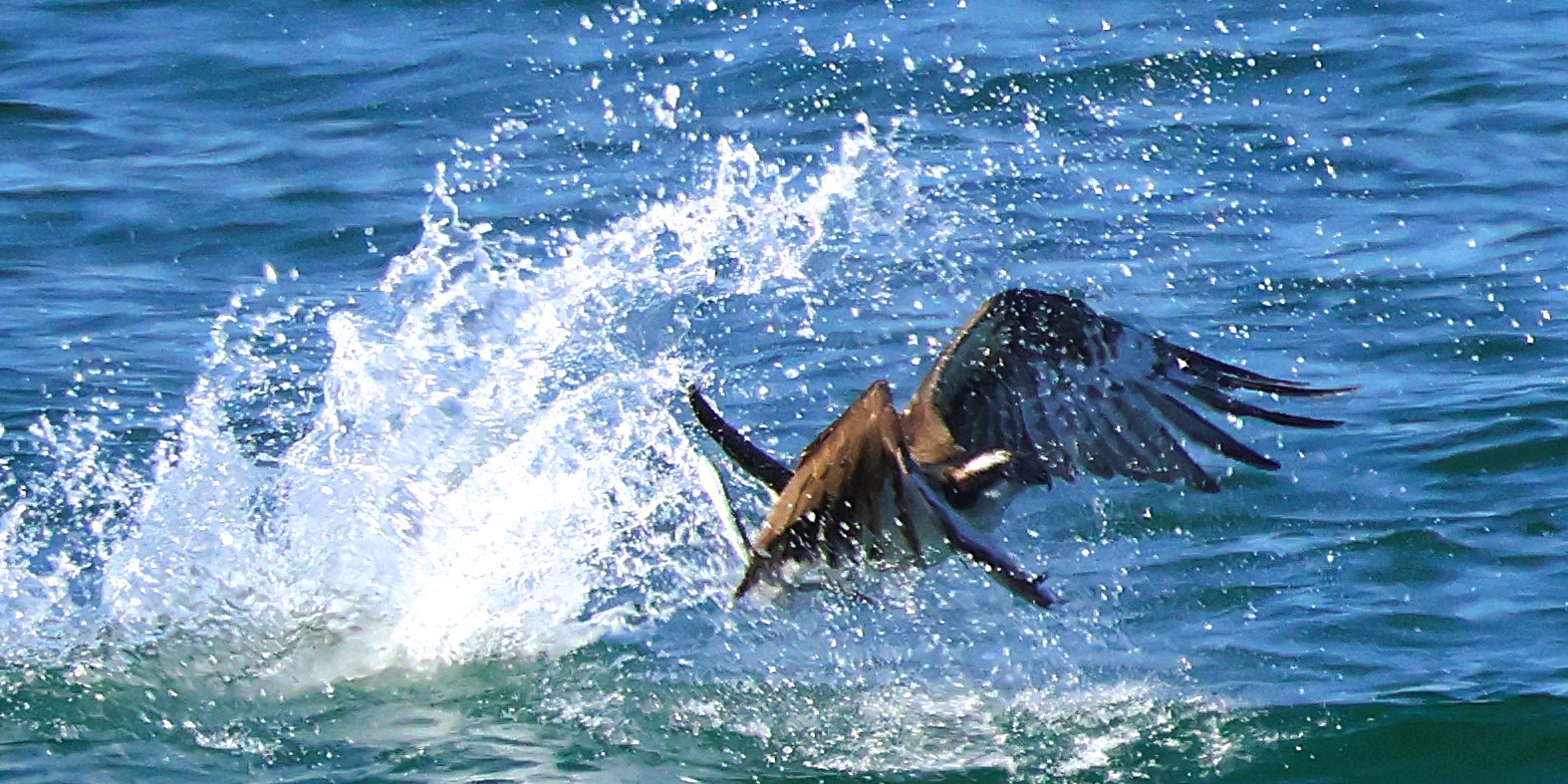 海面に飛び込んでダツを捕まえる場面を連続撮影され、豪快な水しぶきが上がって迫力満点です。