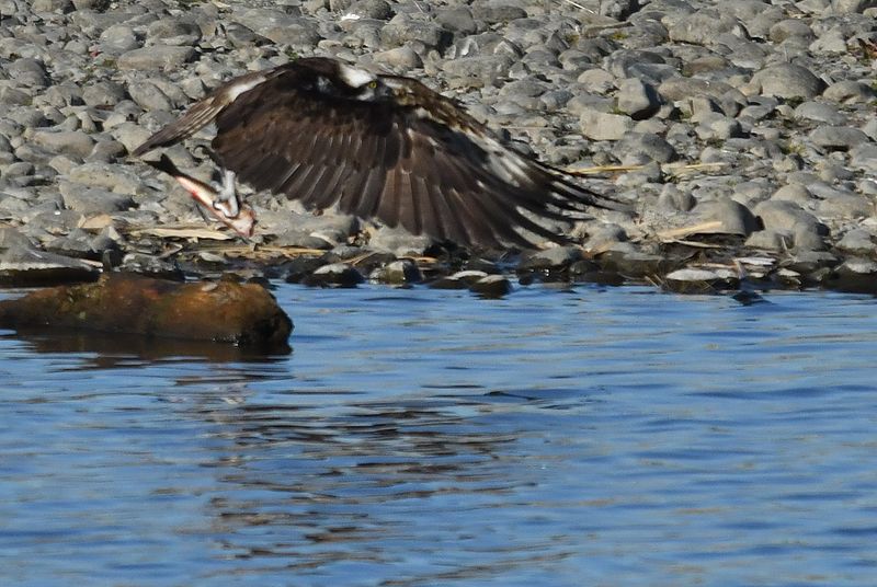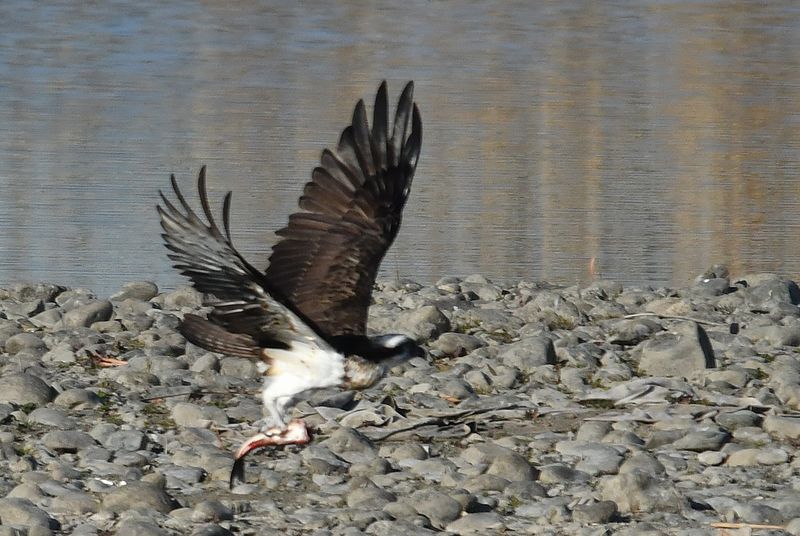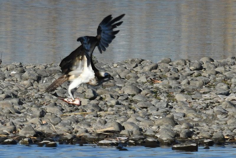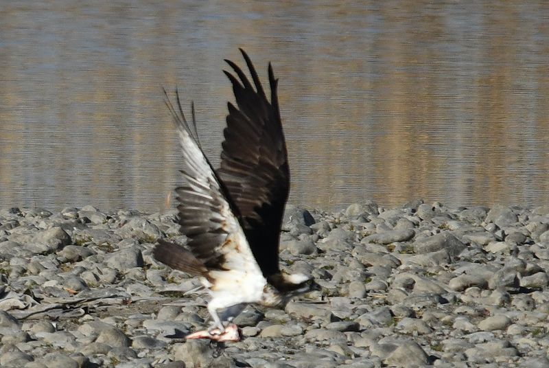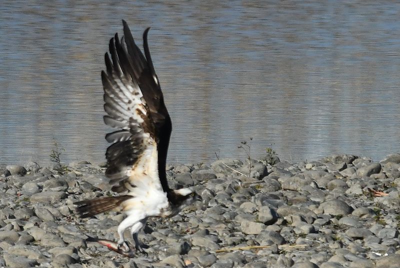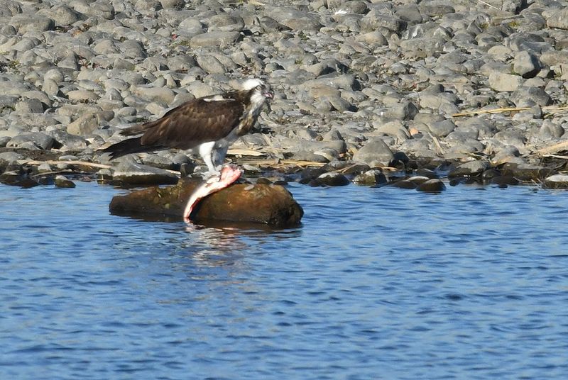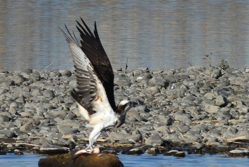 朝、土手をママチャリで走行し始めたら中州の岩で、ミサゴ雌が大きな鯉を捕まえて食べ始めていました。