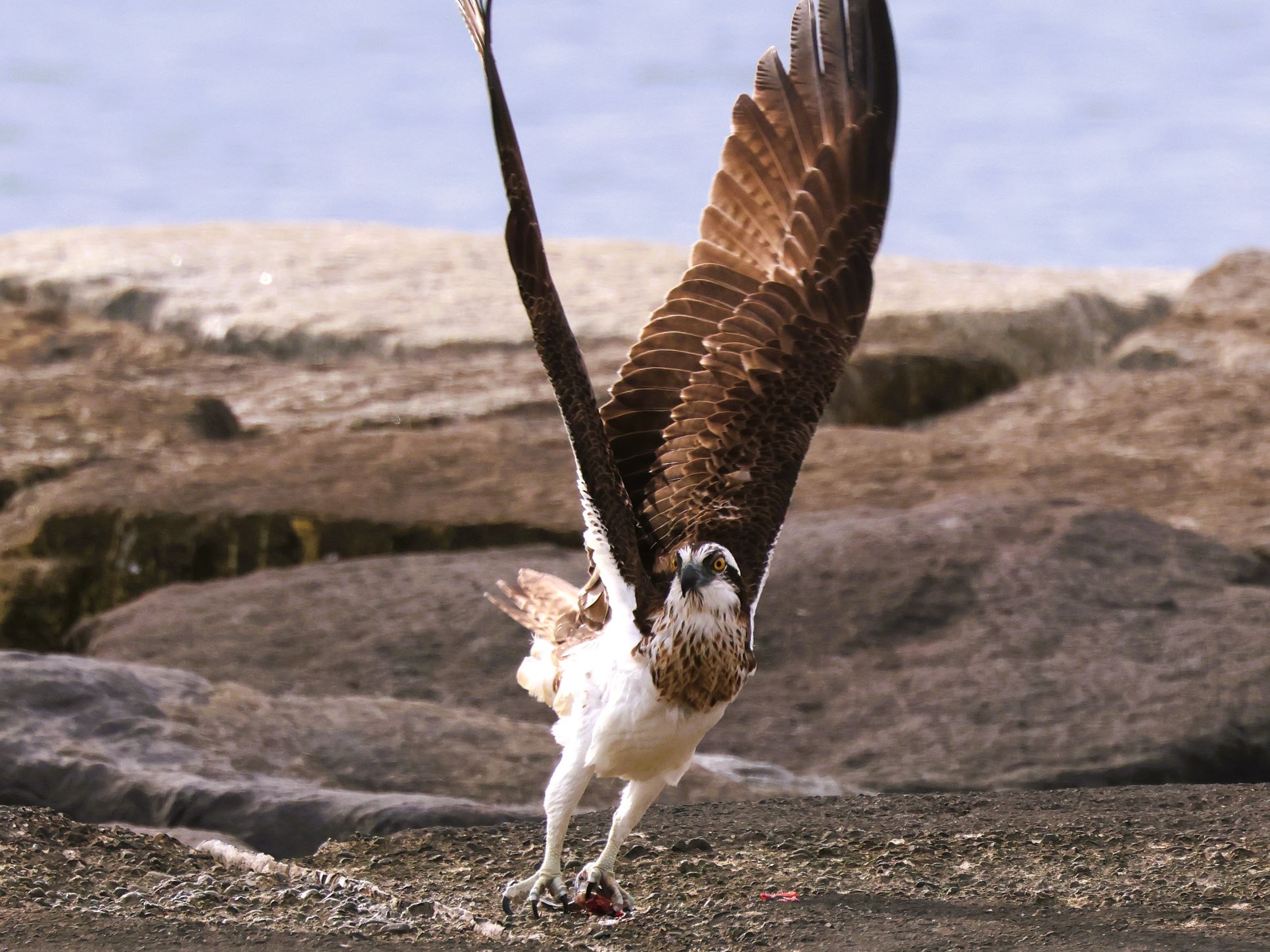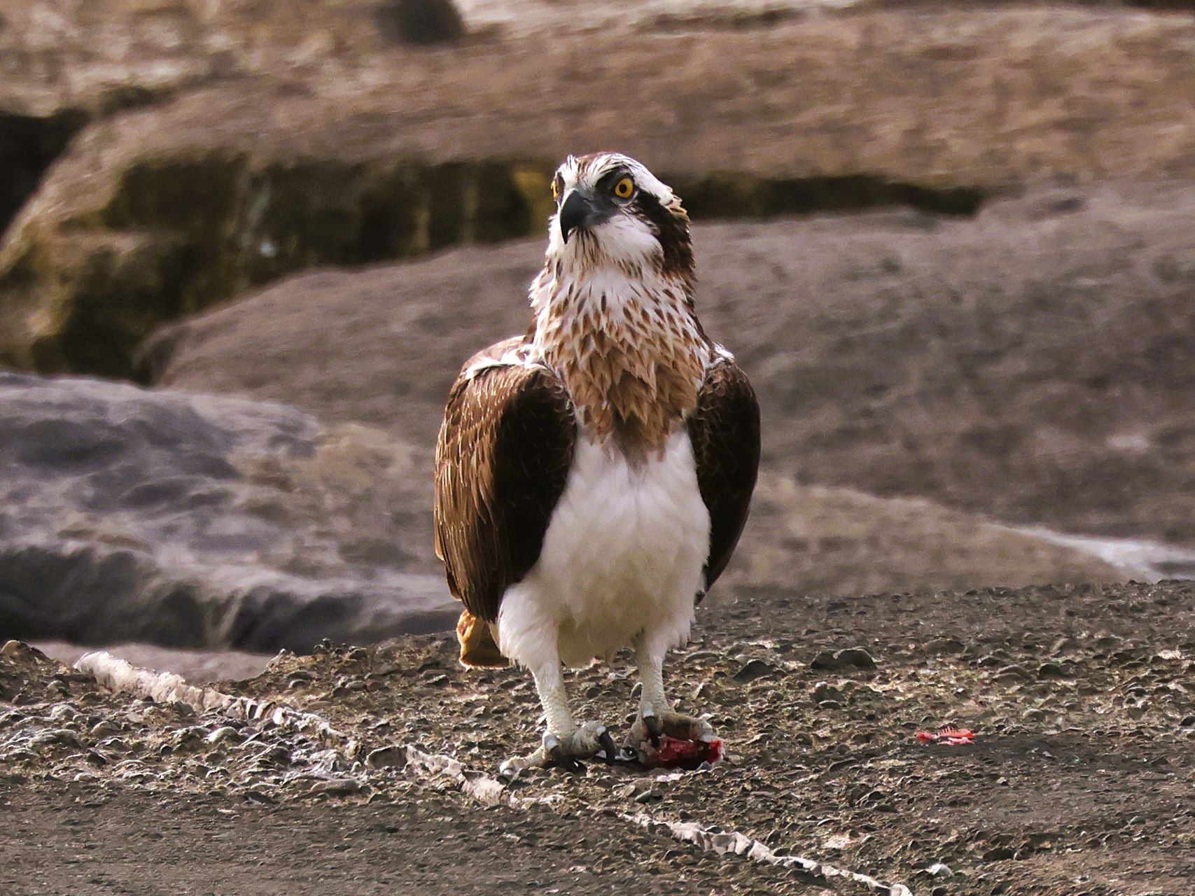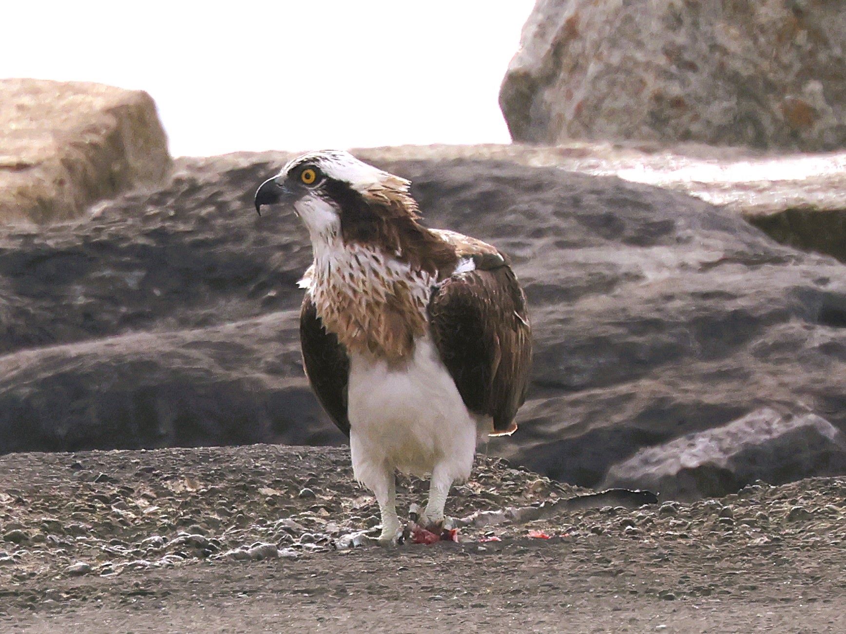 朝、土手をママチャリで走行し始めたら中州の岩で、ミサゴ雌が大きな鯉を捕まえて食べ始めていました。