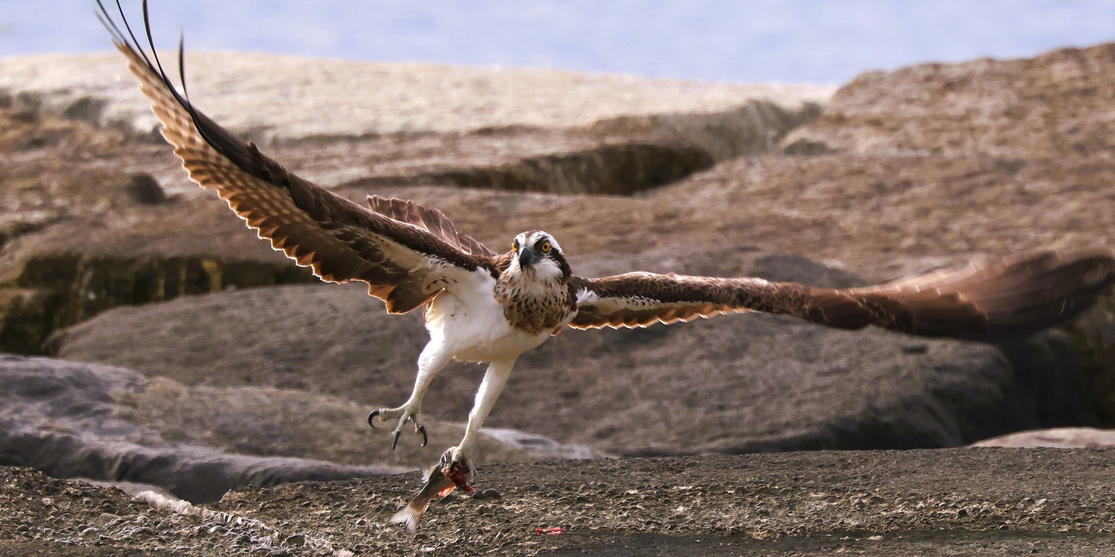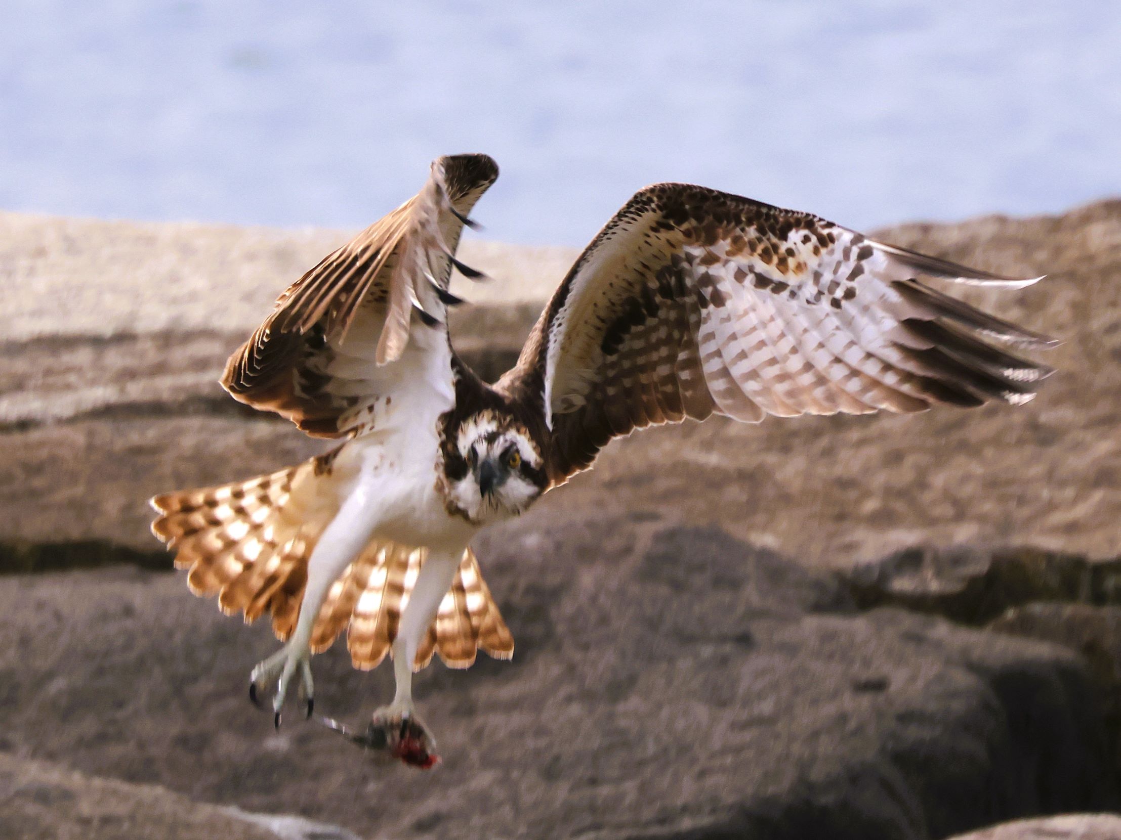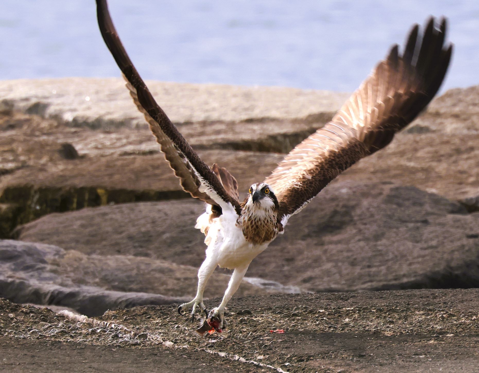 近くの岩場で撮られたのでしょうか、特に精悍な黄色い目や胸あたりの描写と飛翔場面がお見事です。