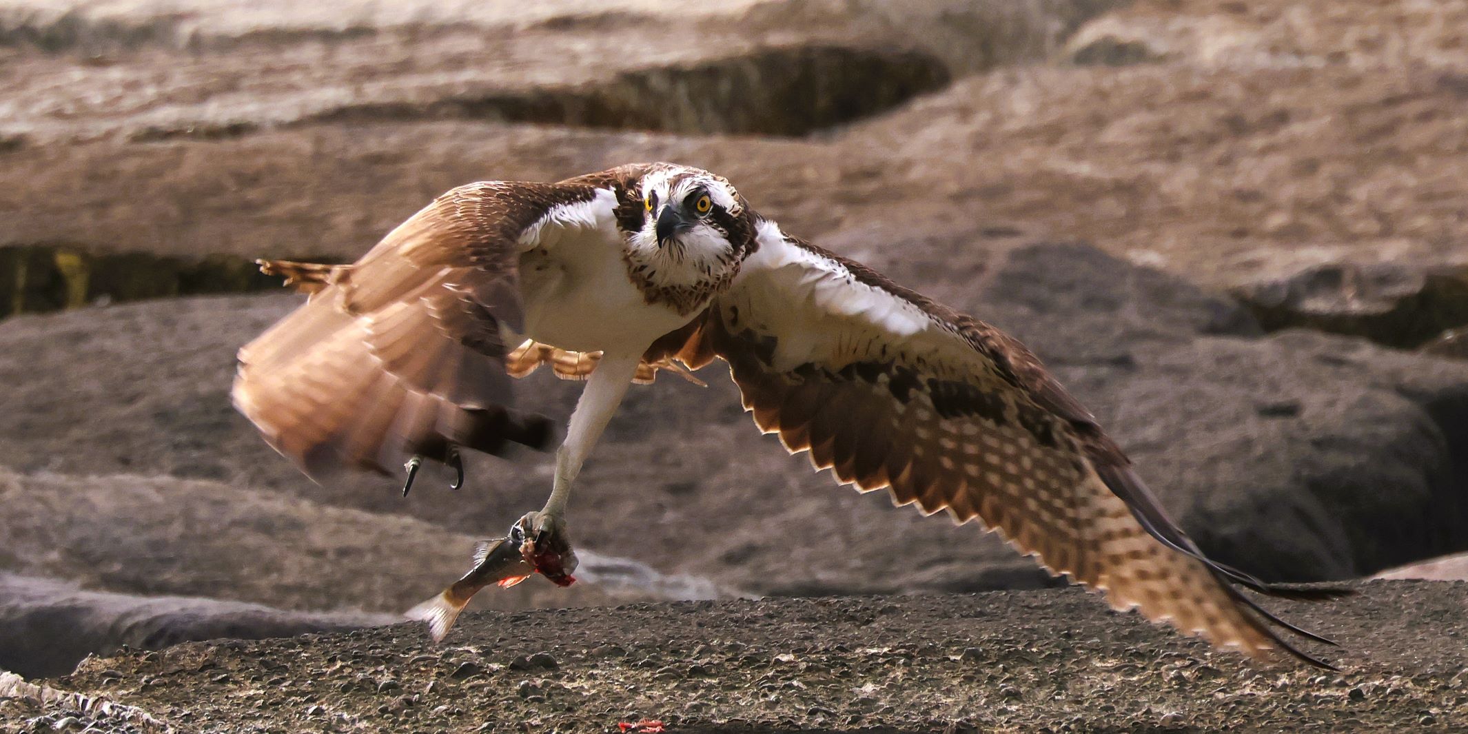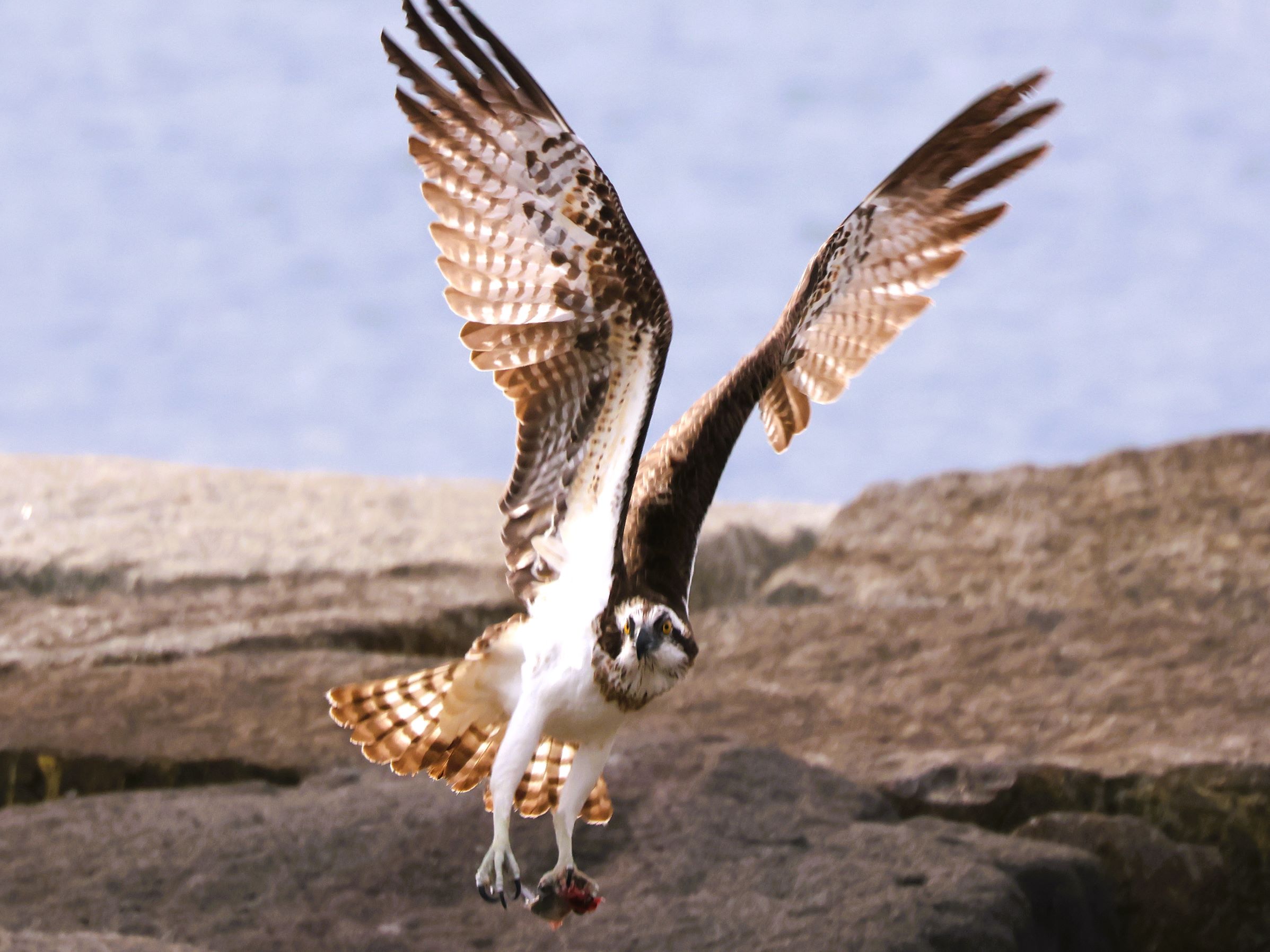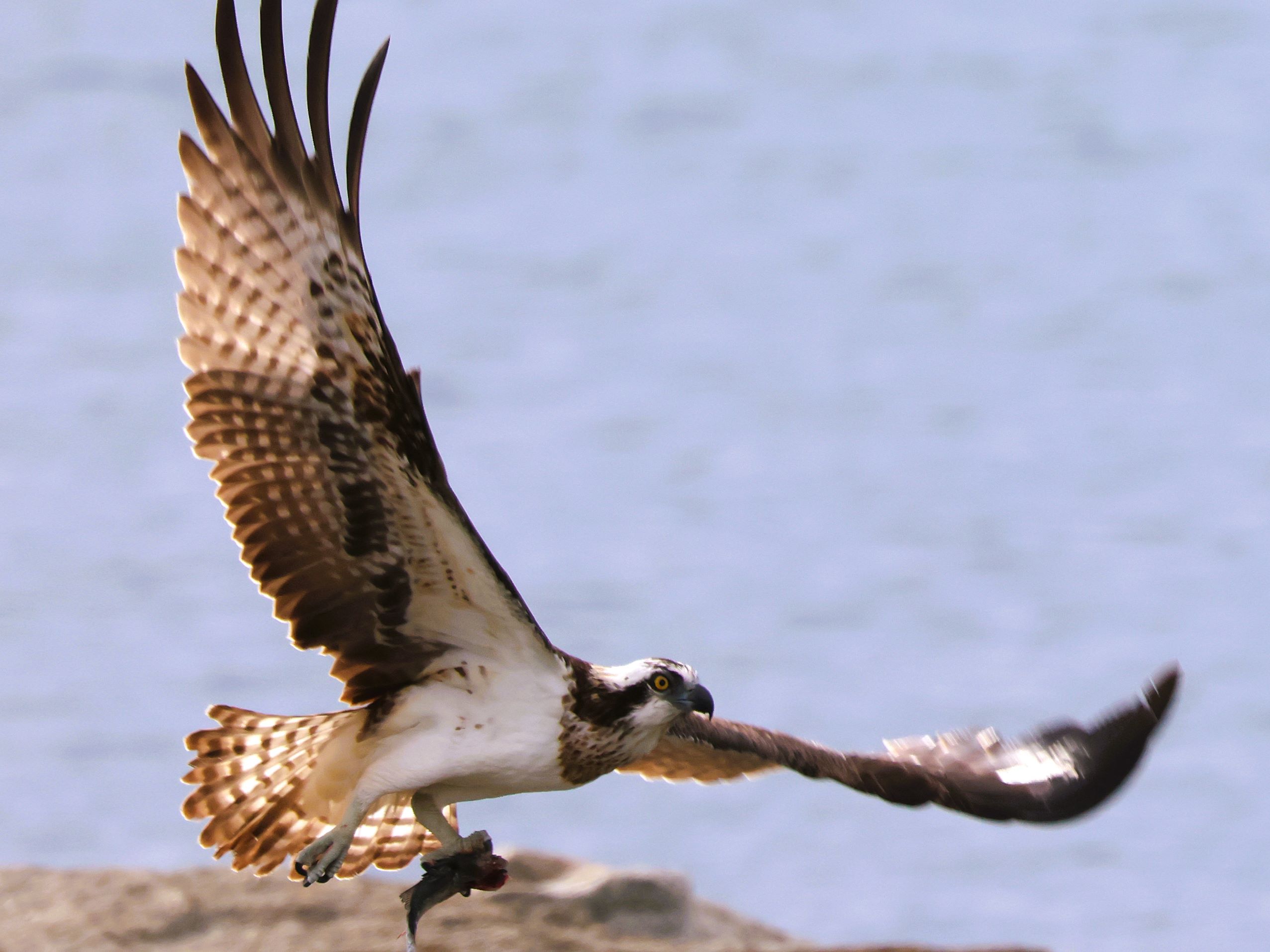 近くの岩場で撮られたのでしょうか、特に精悍な黄色い目や胸あたりの描写と飛翔場面がお見事です。