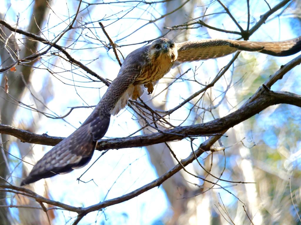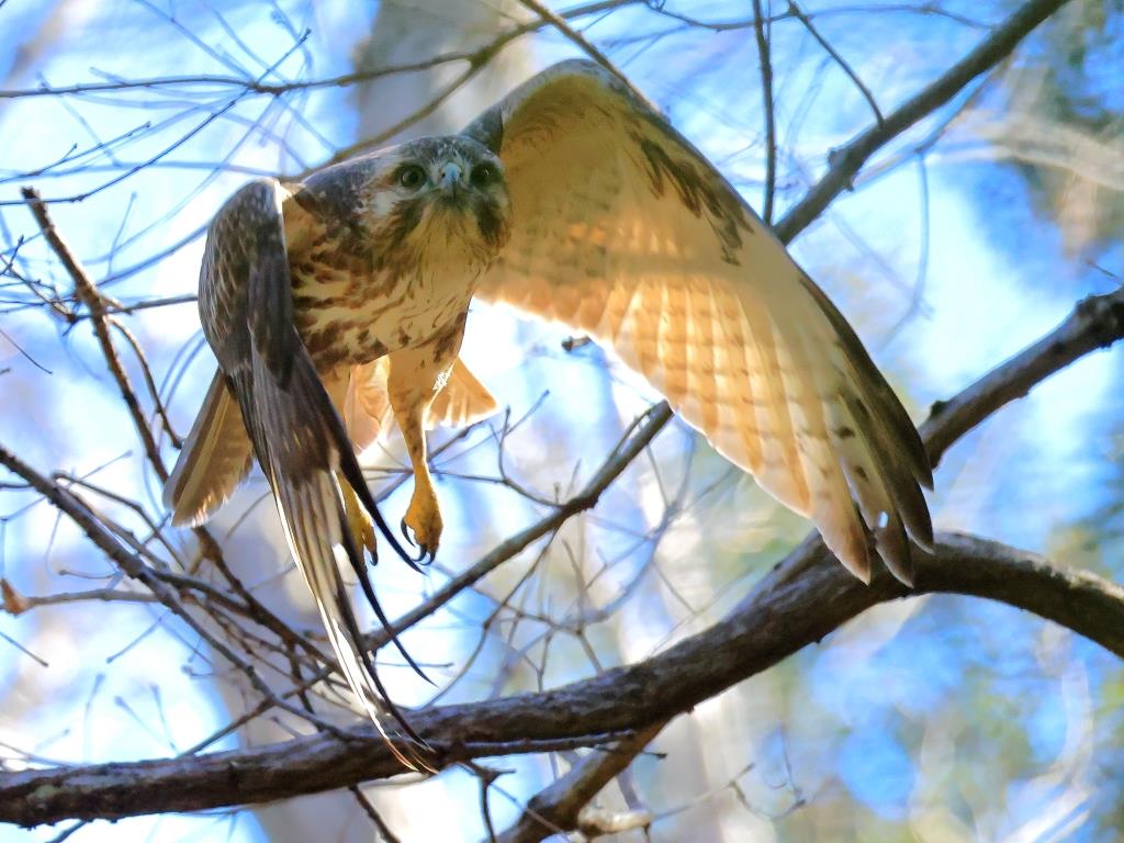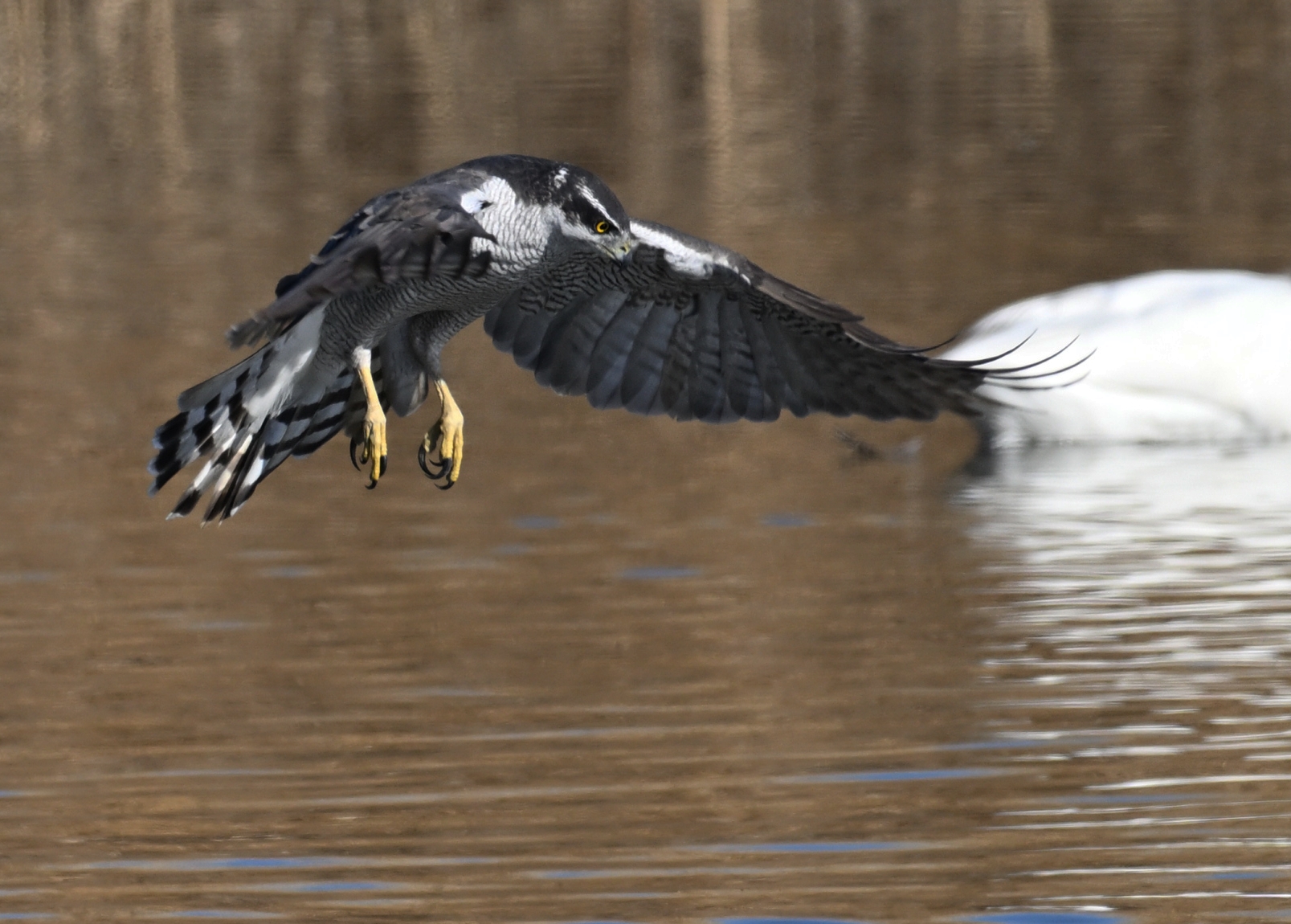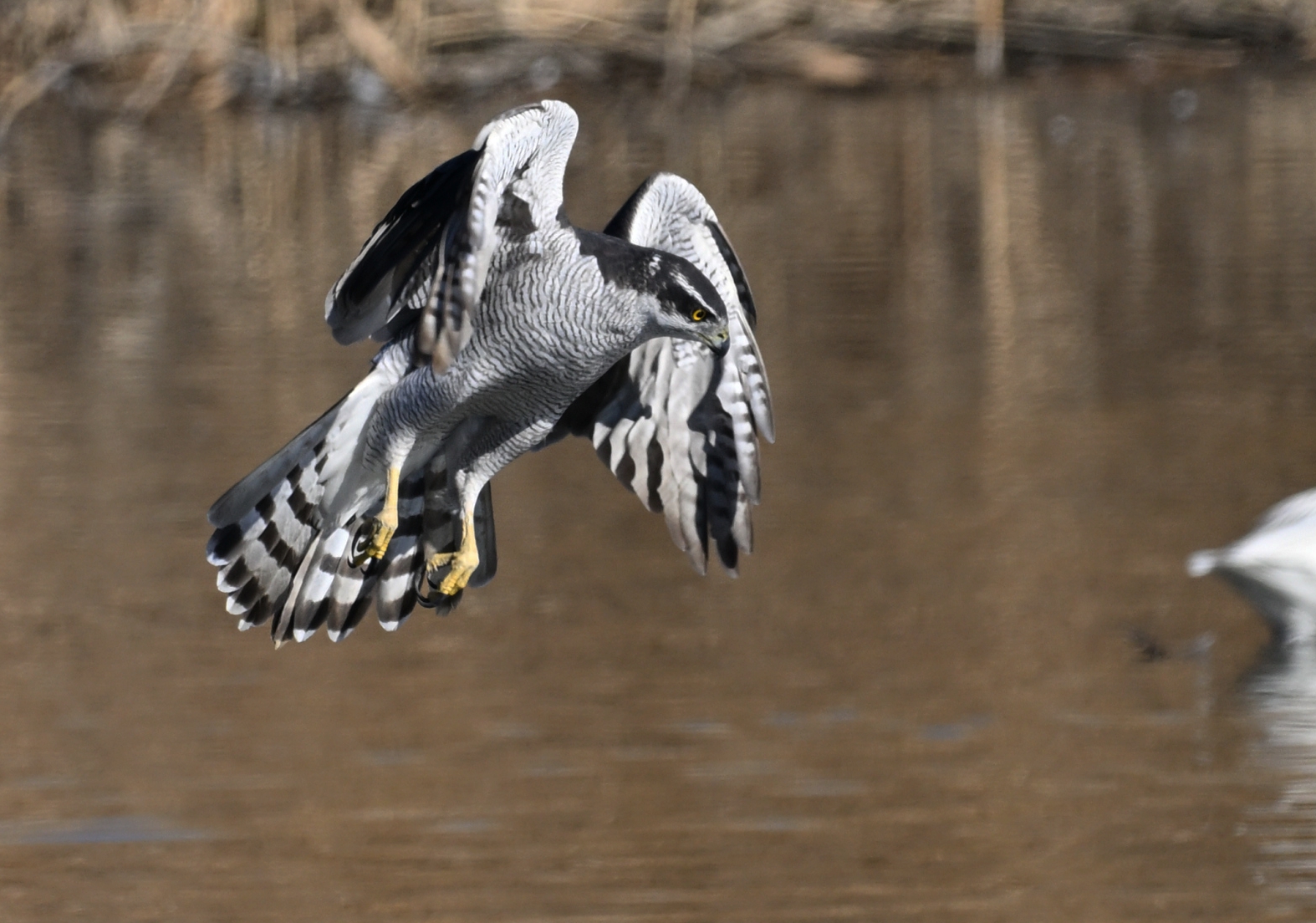 飛翔しながらの琥珀色の鋭い眼光は、オオタカの魅力だけにお見事です。