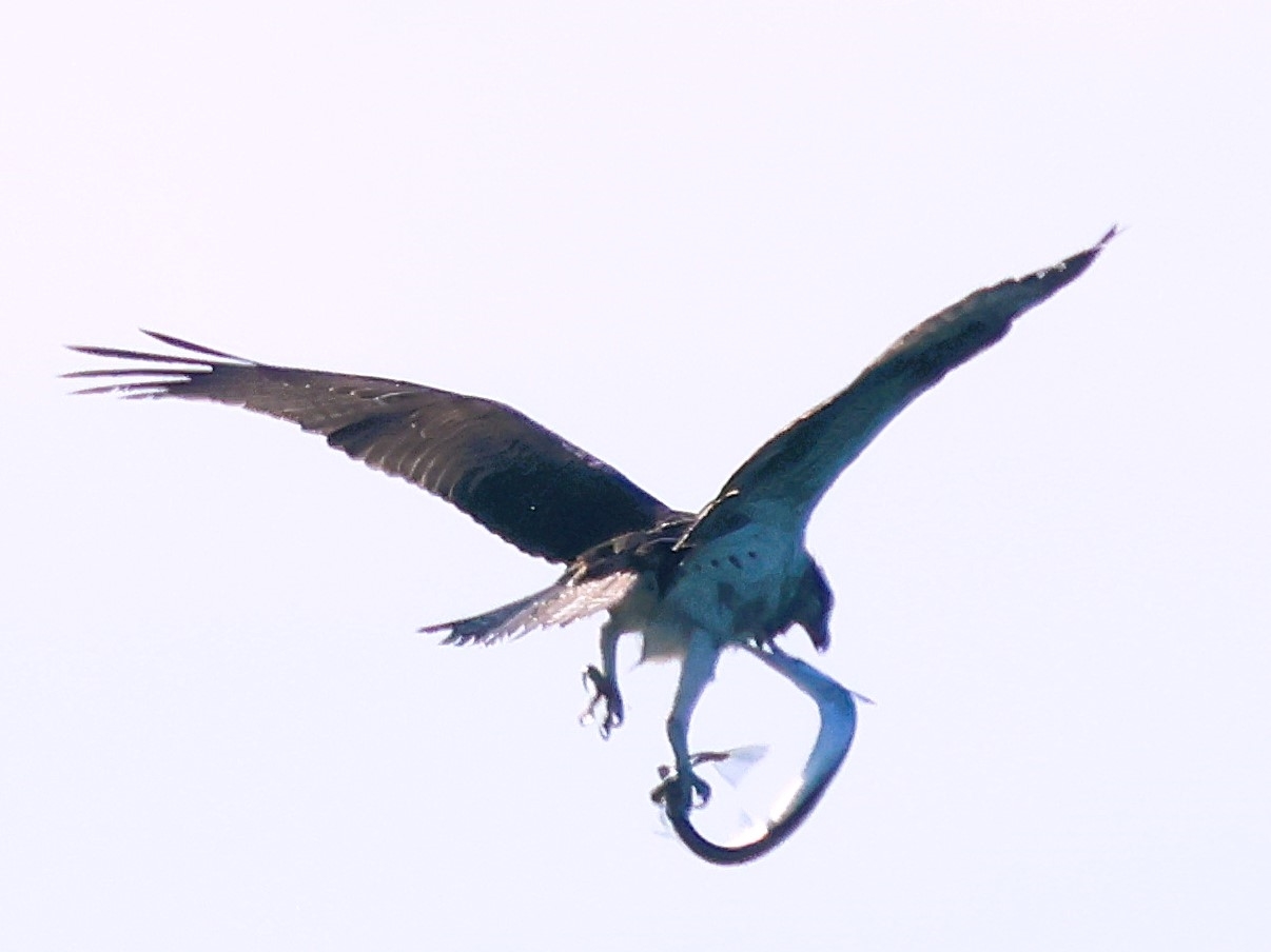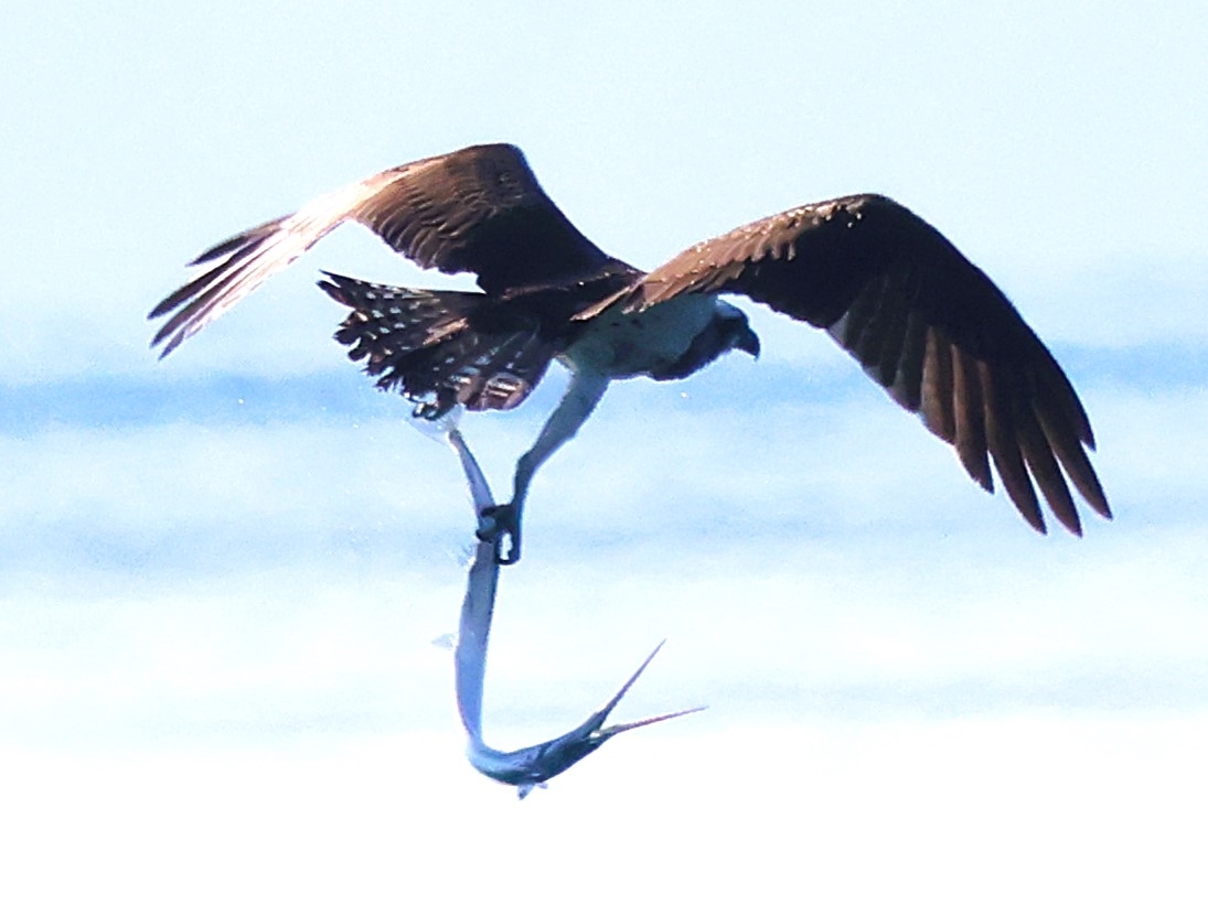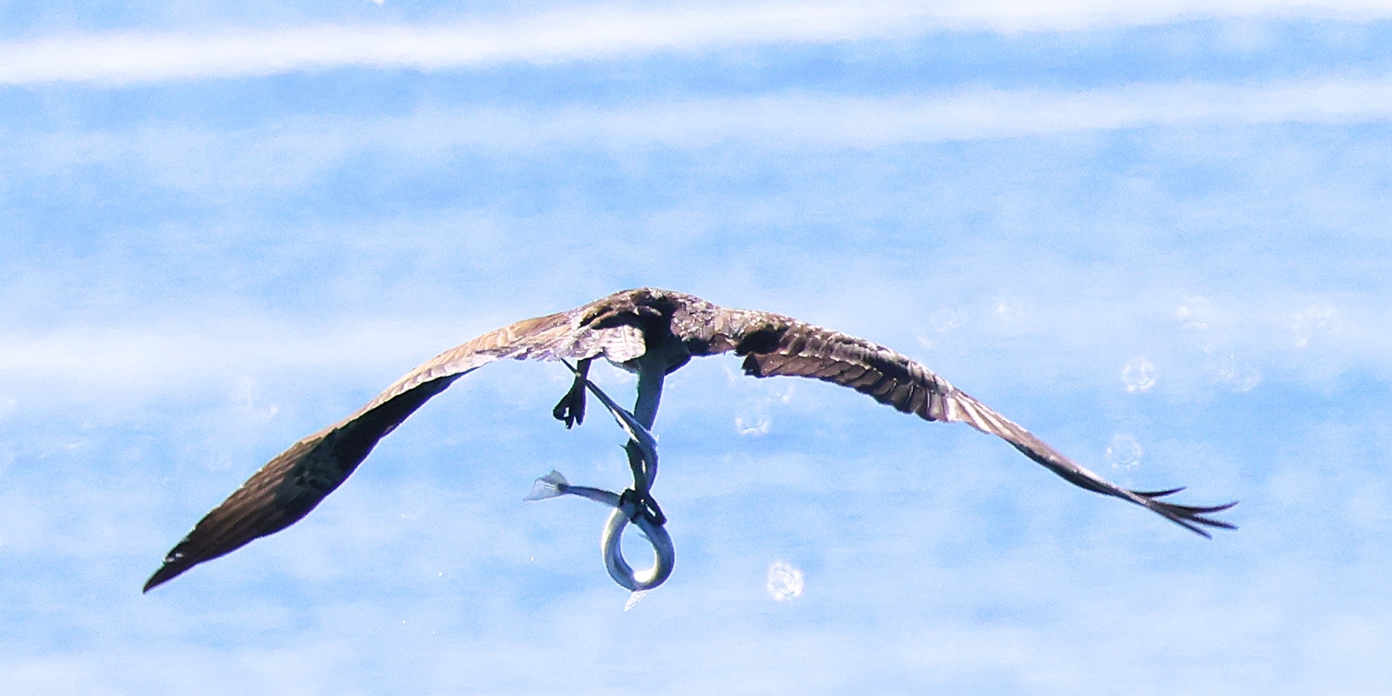ダツのあごは鋭く尖っておりダイバー等、人が刺されて大怪我をした事故例もある危険な魚です。ここでもダツの尾の方を掴んだミサゴが下からの突き上げられ痛いのかどうか分かりませんがダツを落とす事が時々見受けられます。この画像も目でも突かれたら命を失い兼ねない危険な狩をしているんだなーと感じます。