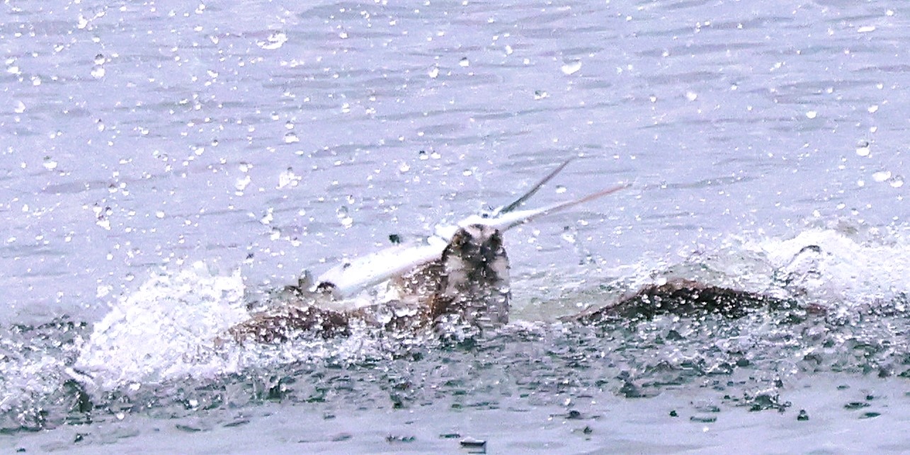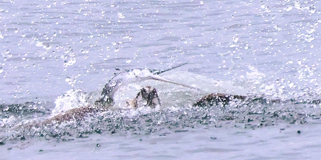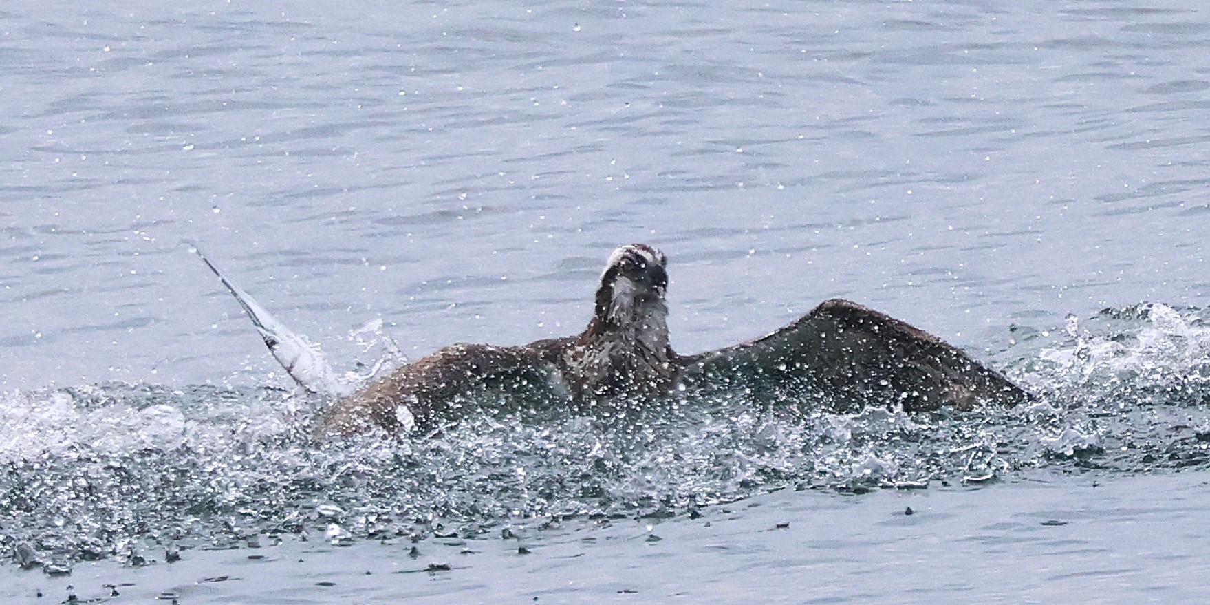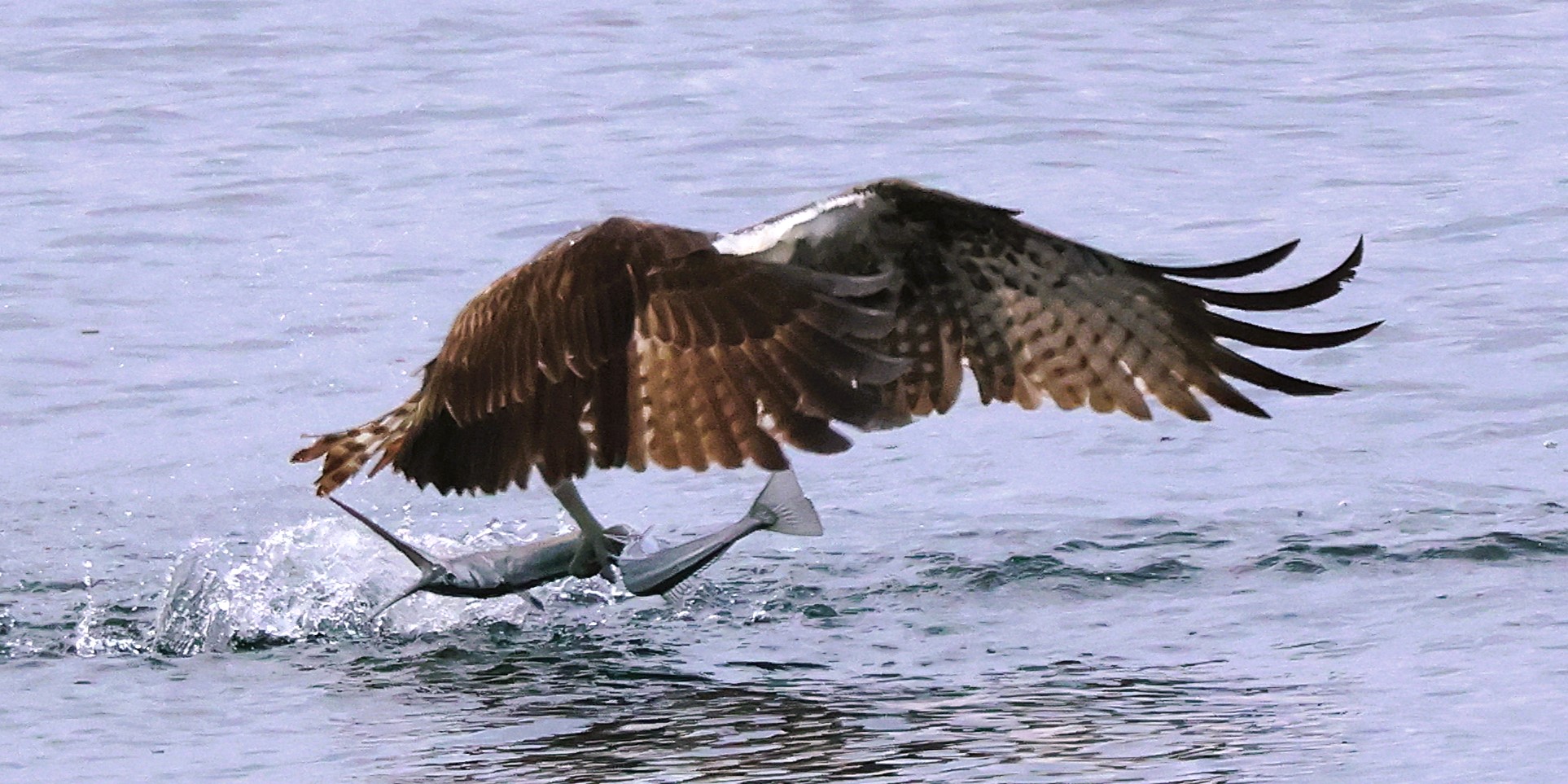 ダツのあごは鋭く尖っておりダイバー等、人が刺されて大怪我をした事故例もある危険な魚です。ここでもダツの尾の方を掴んだミサゴが下からの突き上げられ痛いのかどうか分かりませんがダツを落とす事が時々見受けられます。この画像も目でも突かれたら命を失い兼ねない危険な狩をしているんだなーと感じます。