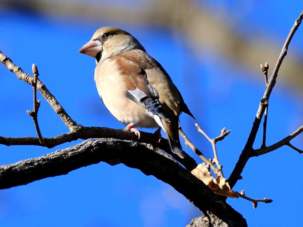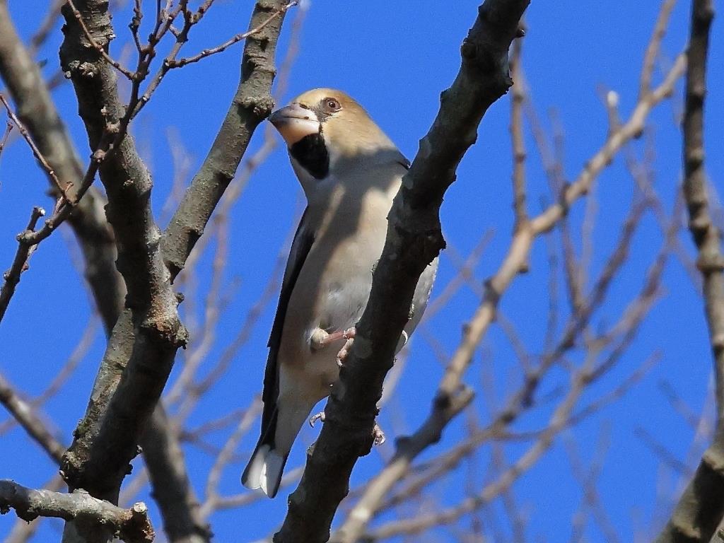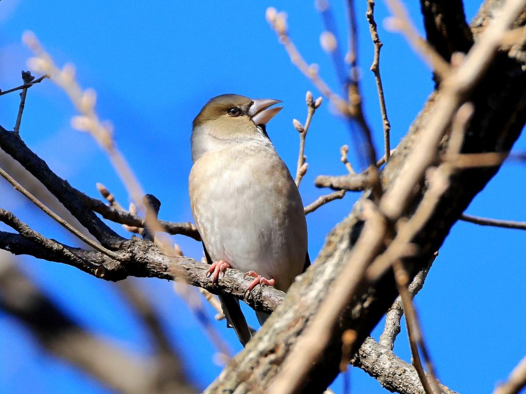 シメの留まっている木を見ると、葉っぱがなくなったばかりなのに、もう新芽が出て居るのがわかりました。