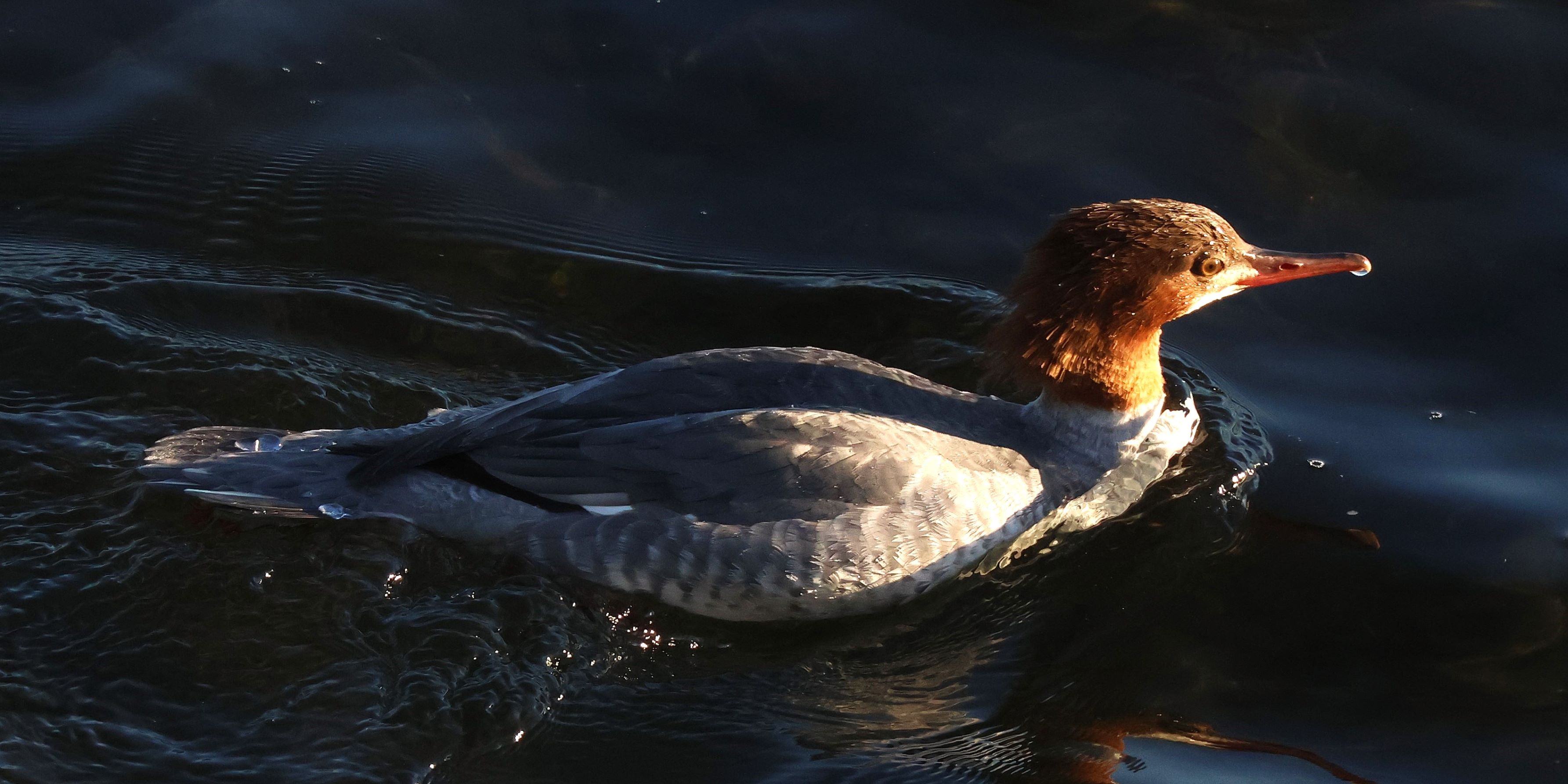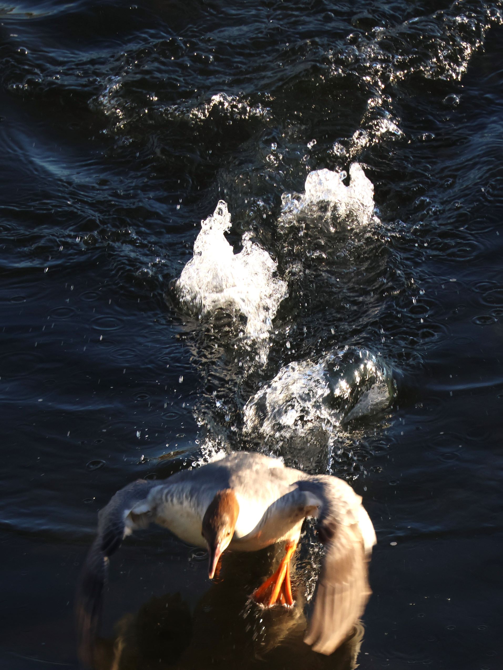 ミコアイサ雌作品は、堰の上から撮られたのでしょうか、俯瞰撮影で近くからの撮影で雌の目にしっかり光が入っています。