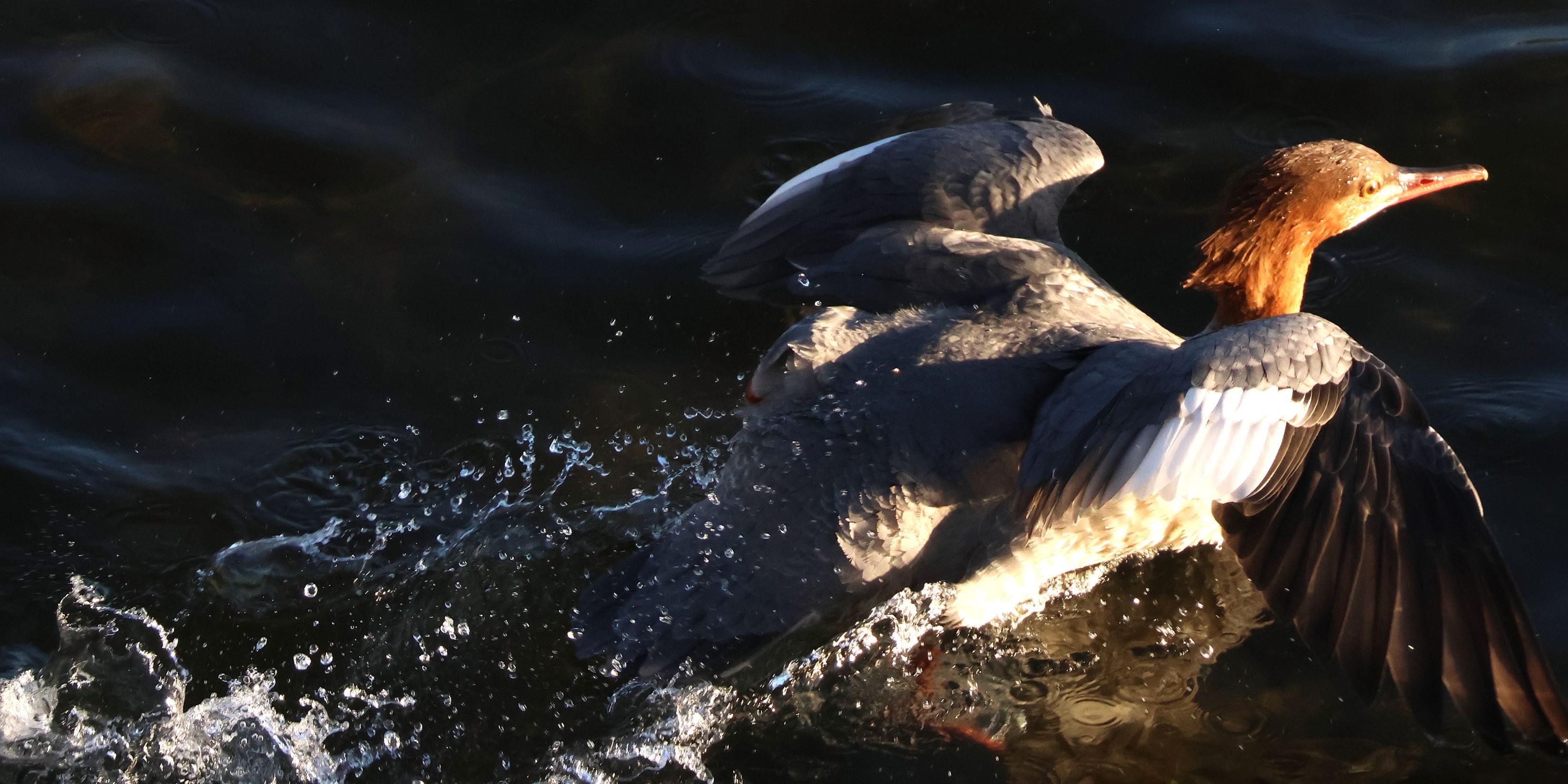 水面が濃紺と黒の中、雌が色々と動きの激しい動きをした所を捉え、水飛沫が上がって躍動感が出ています。