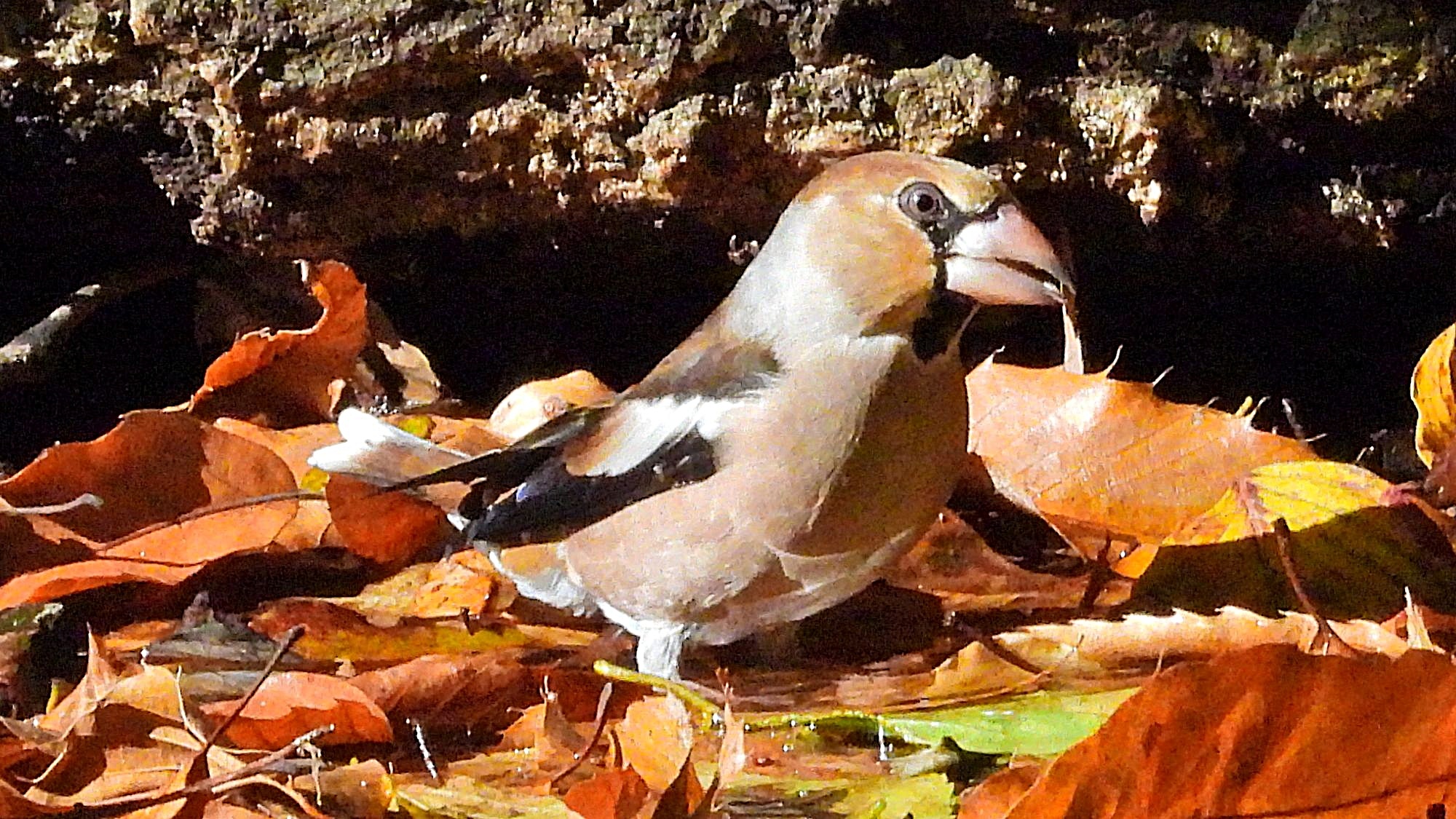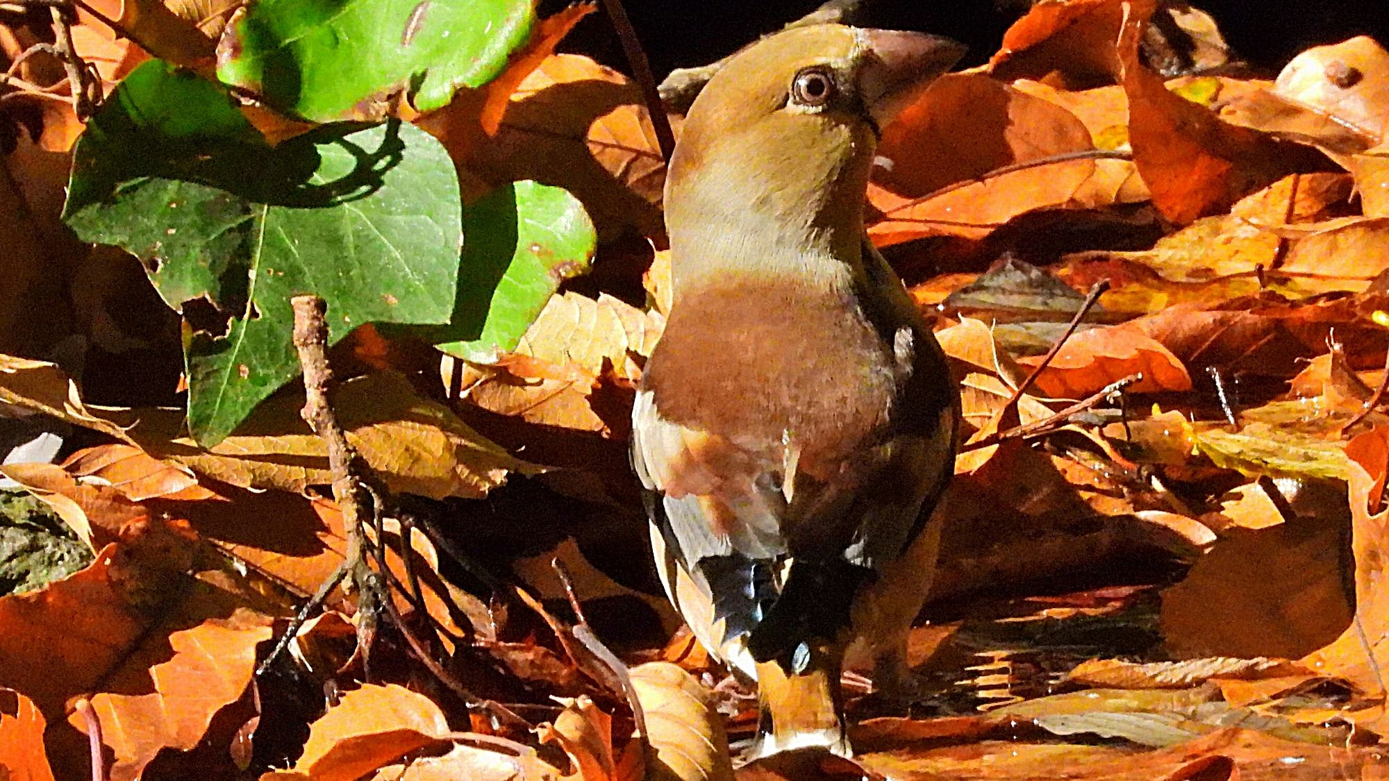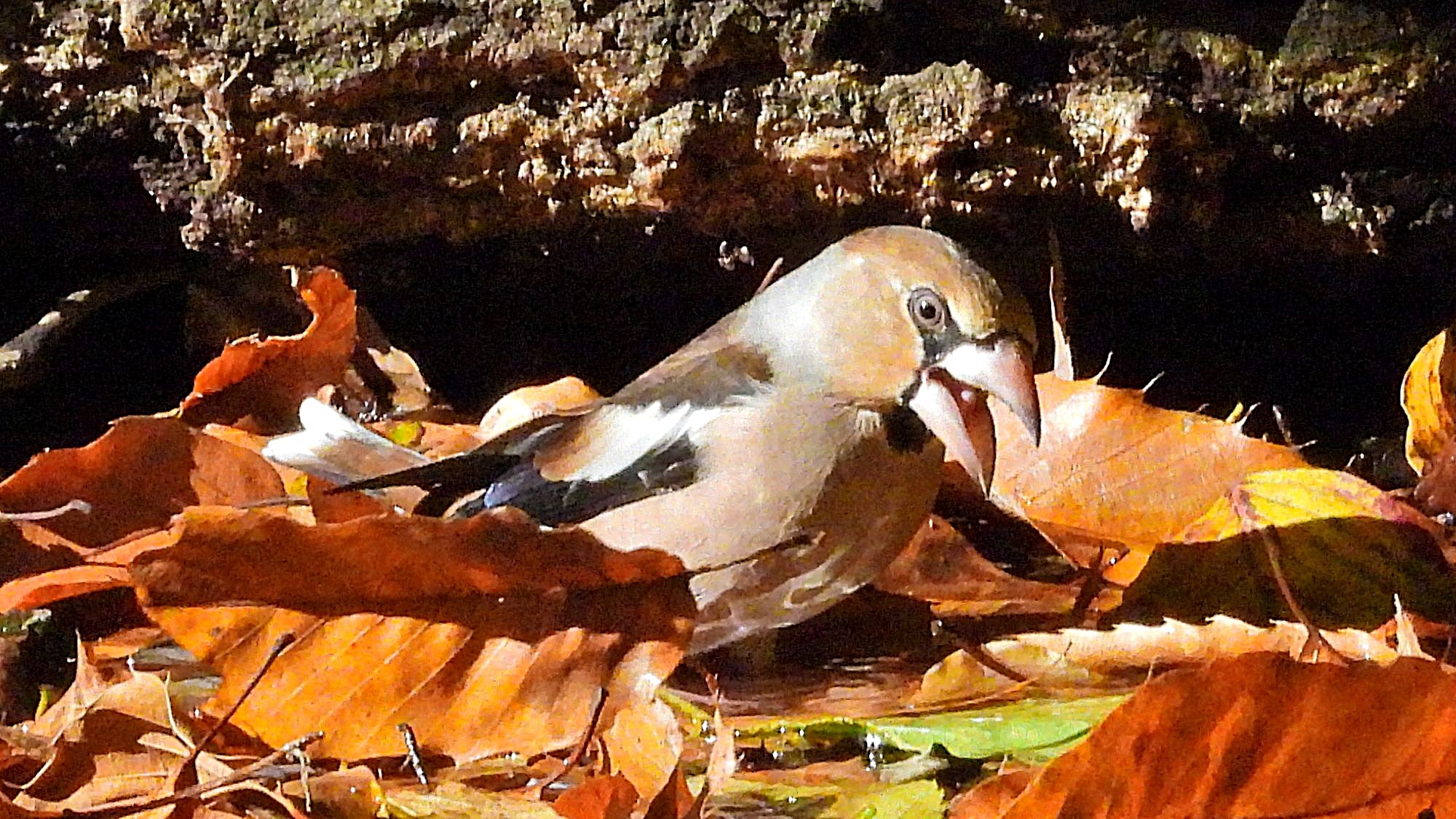 シメ3作品は、水面に浮いた落ち葉の上に飛来した所を捉え、ごっつい目に光が入って、大きな嘴が引き立っています。
