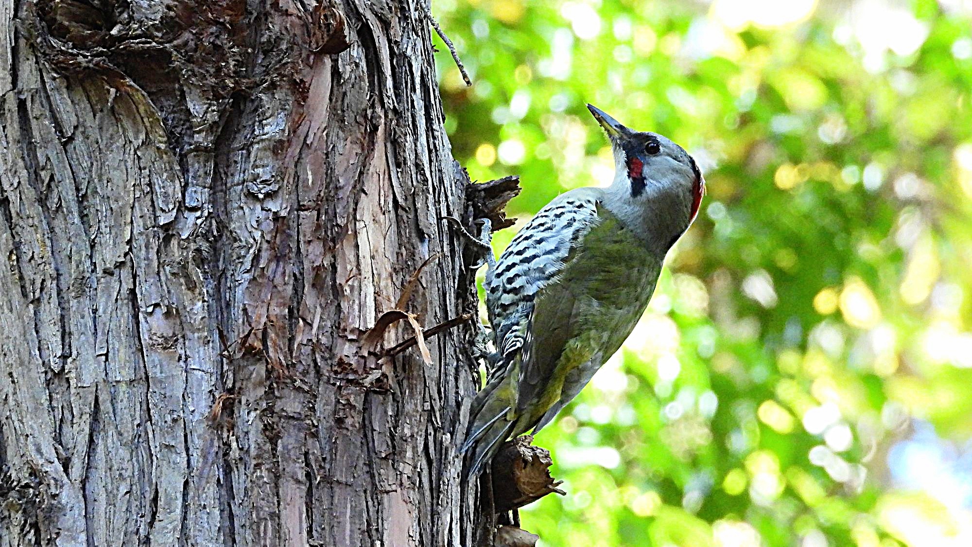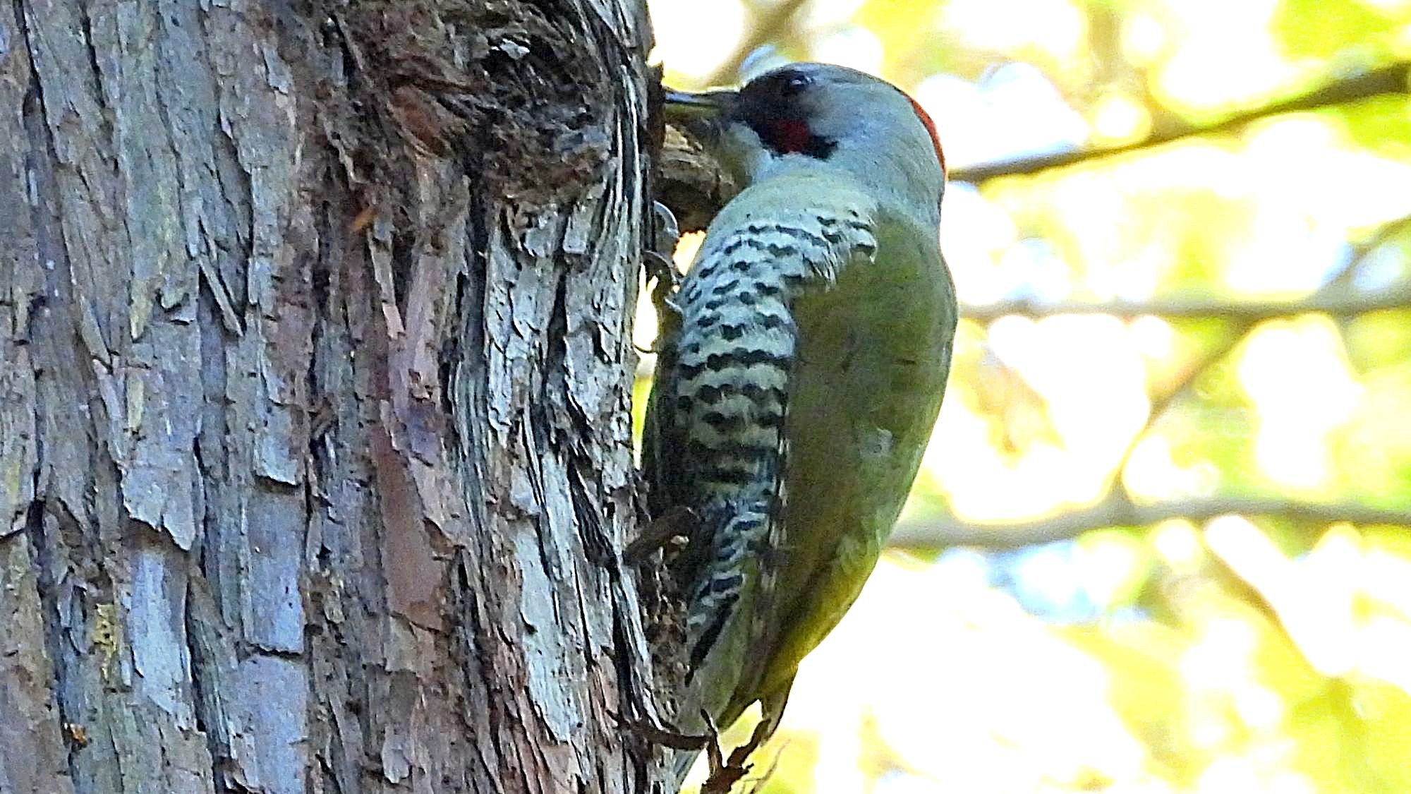 アオゲラ作品は、木の幹に止まった所を捉え、しっかり目に光が入ってバックが抜けてアオゲラが引き立っています。
