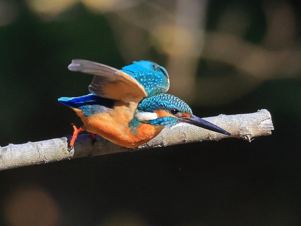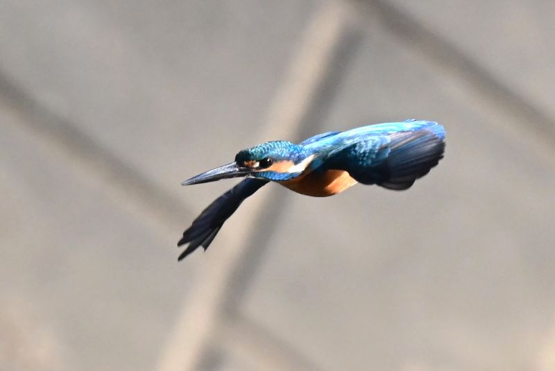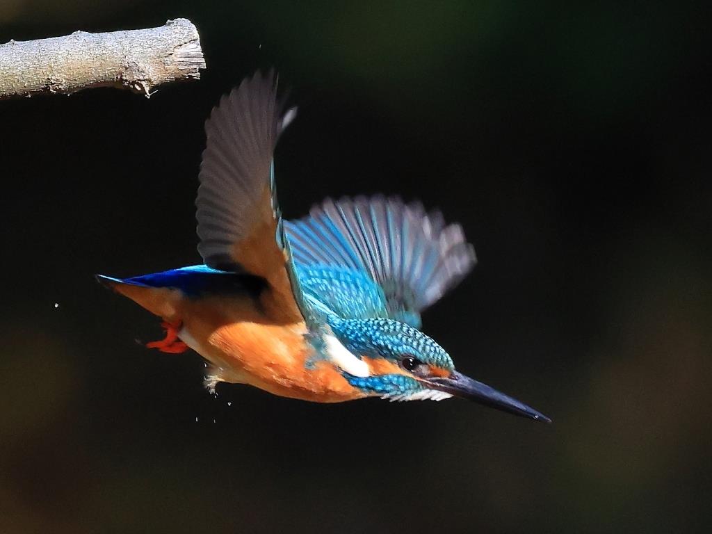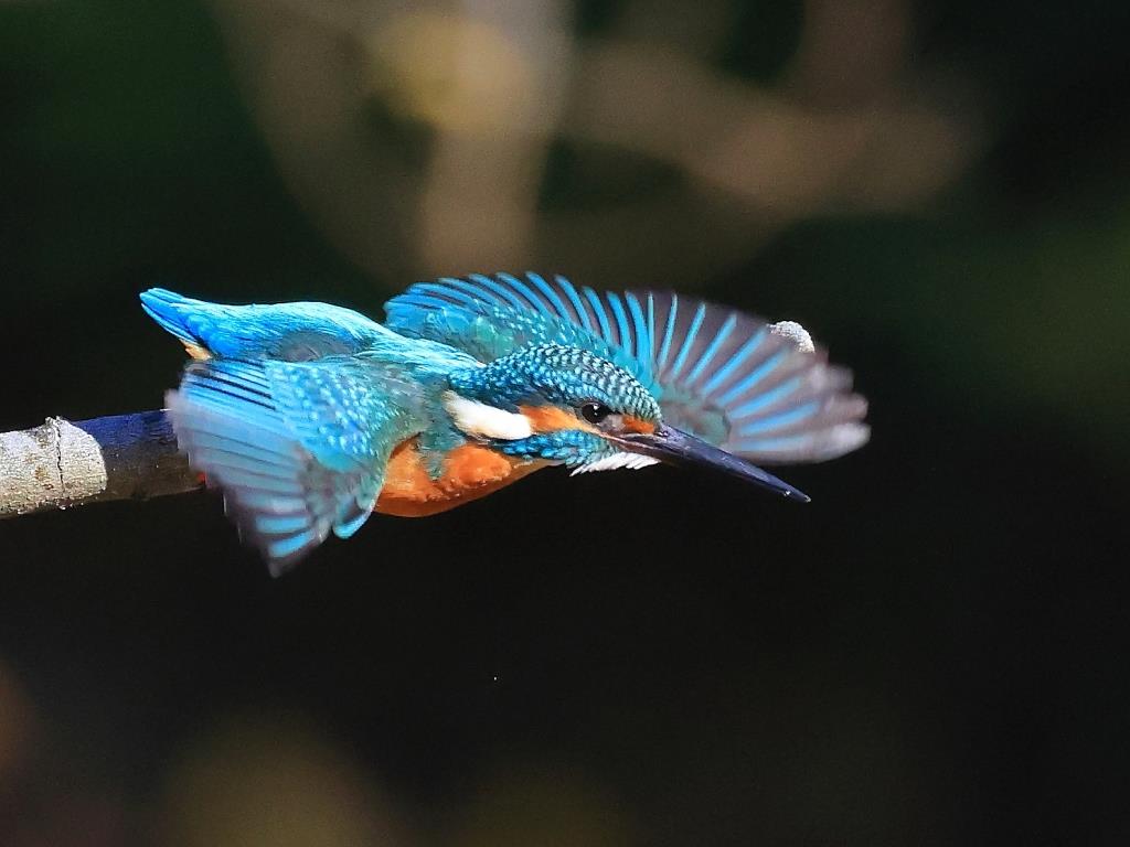 枝からのカワセミの飛び出し作品は、連射で撮られ、羽がブレて綺麗で躍動感があります。