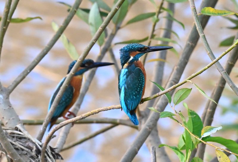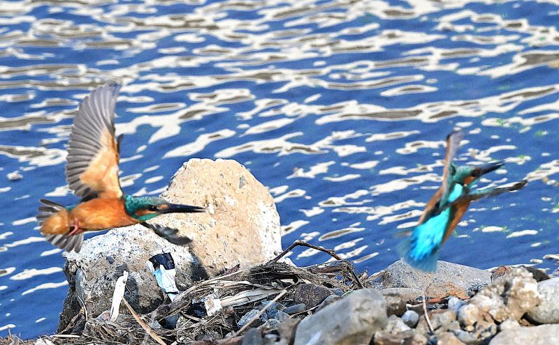 1枚目は、青空が水面に映えた川面を雄同士の追いかけっこを捉え、目にしっかり光が入って、羽がブレて躍動感があります。