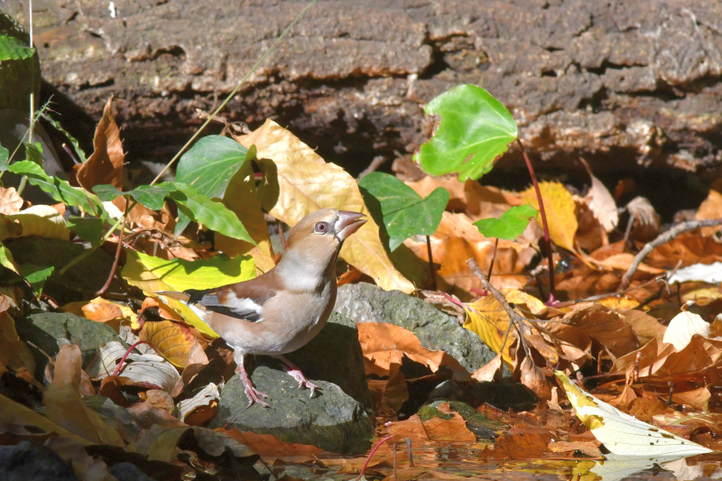 シメ作品は、小さな池に枯葉が重なっている所にシメが飛来した所を捉え、シメに陽が当たって発色がとても自然で、目にしっかり光が入ってお見事です。