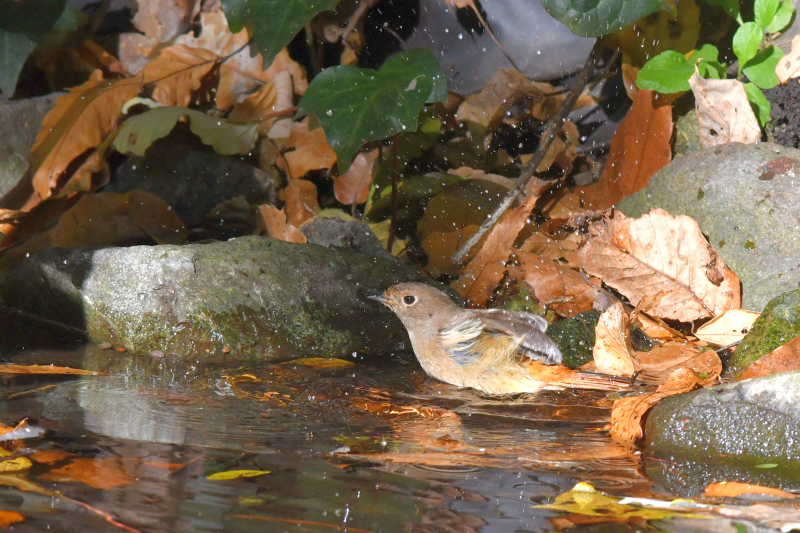 ジョウビタキ♀作品は、同じ小さな池に飛来した所を捉え、水飛沫が上がって、羽がブレて躍動感があります。
