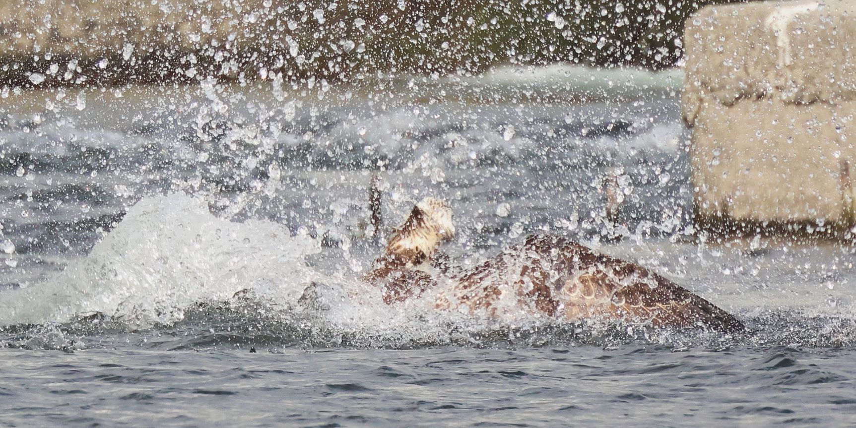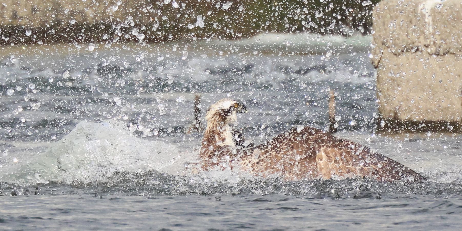 約3時間半待っても飛来しないので機材を閉まったらミサゴが飛来し、川から飛び出したところから撮りました。