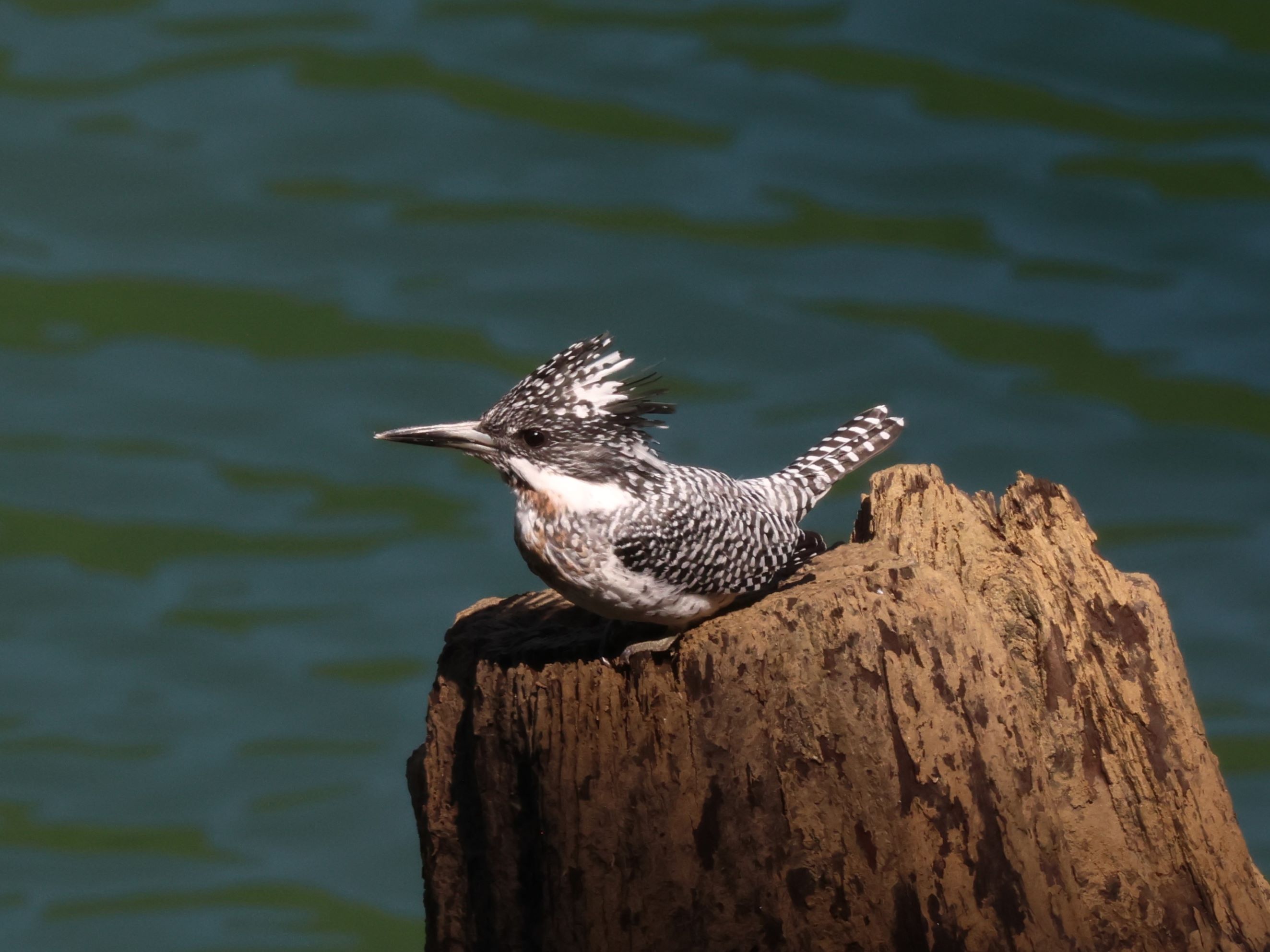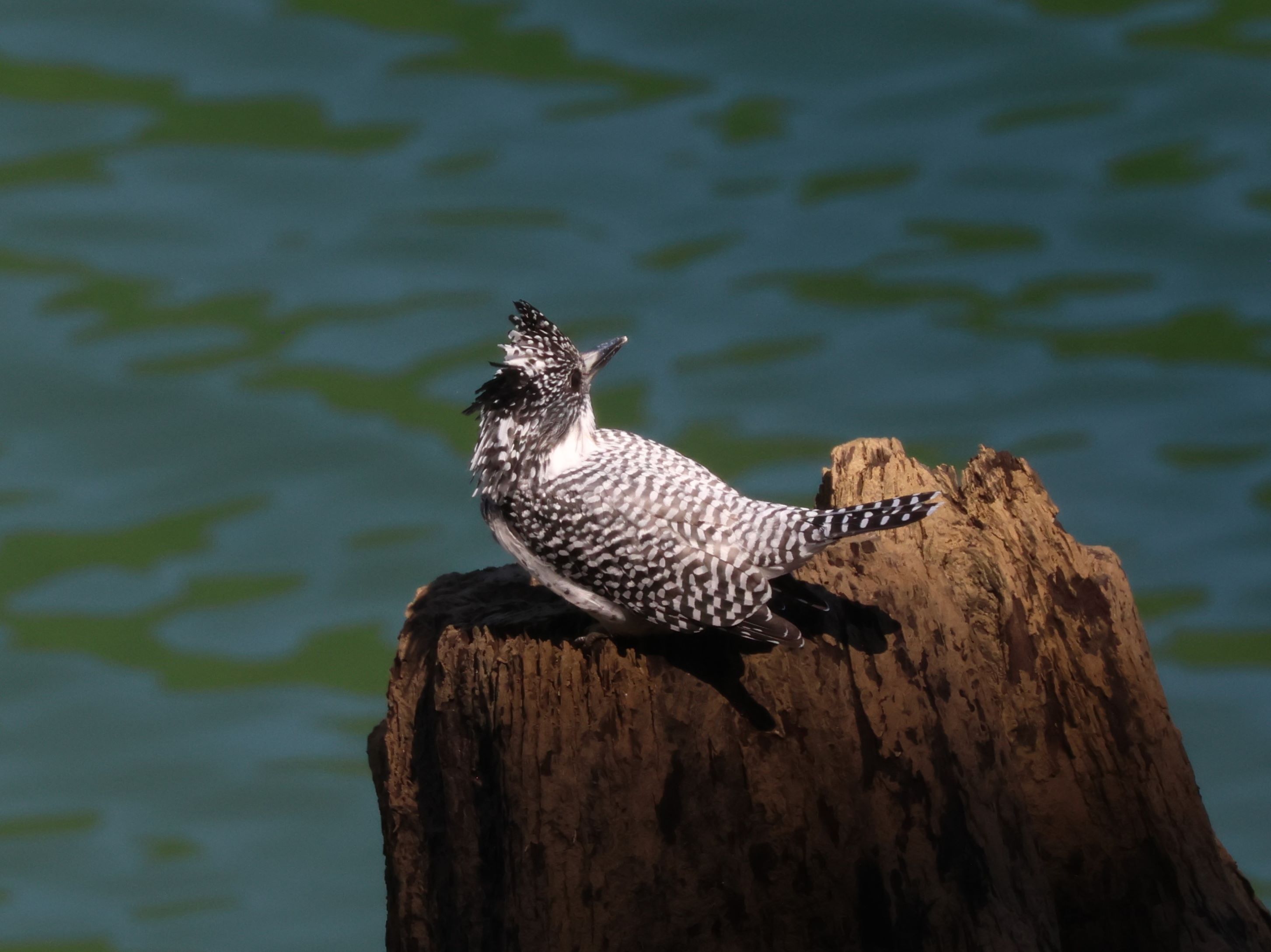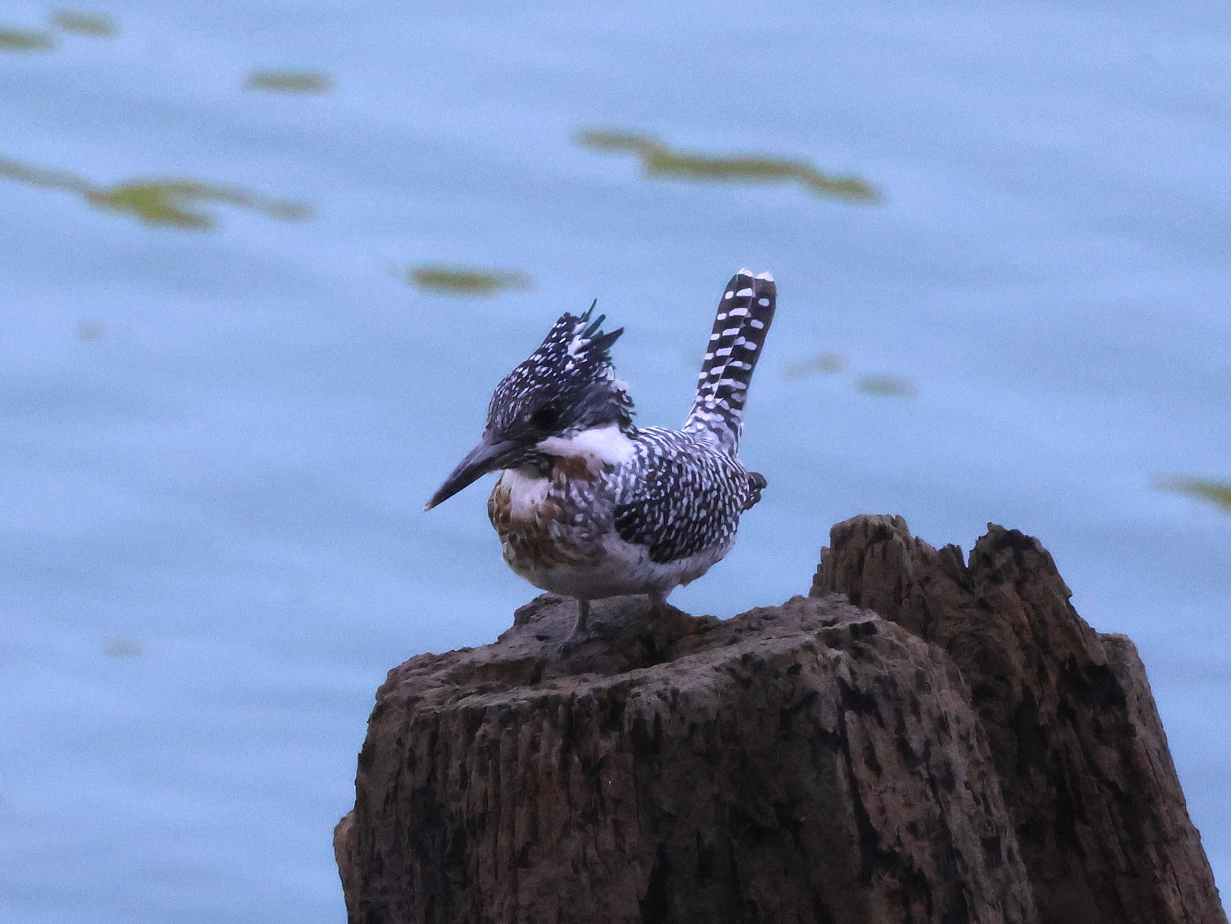 作品は枯れた幹の先端に止まった所を捉え、尾を持ち上げて可愛く、抜けた水面バックにヤマセミが引き立っています。