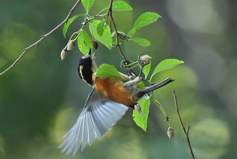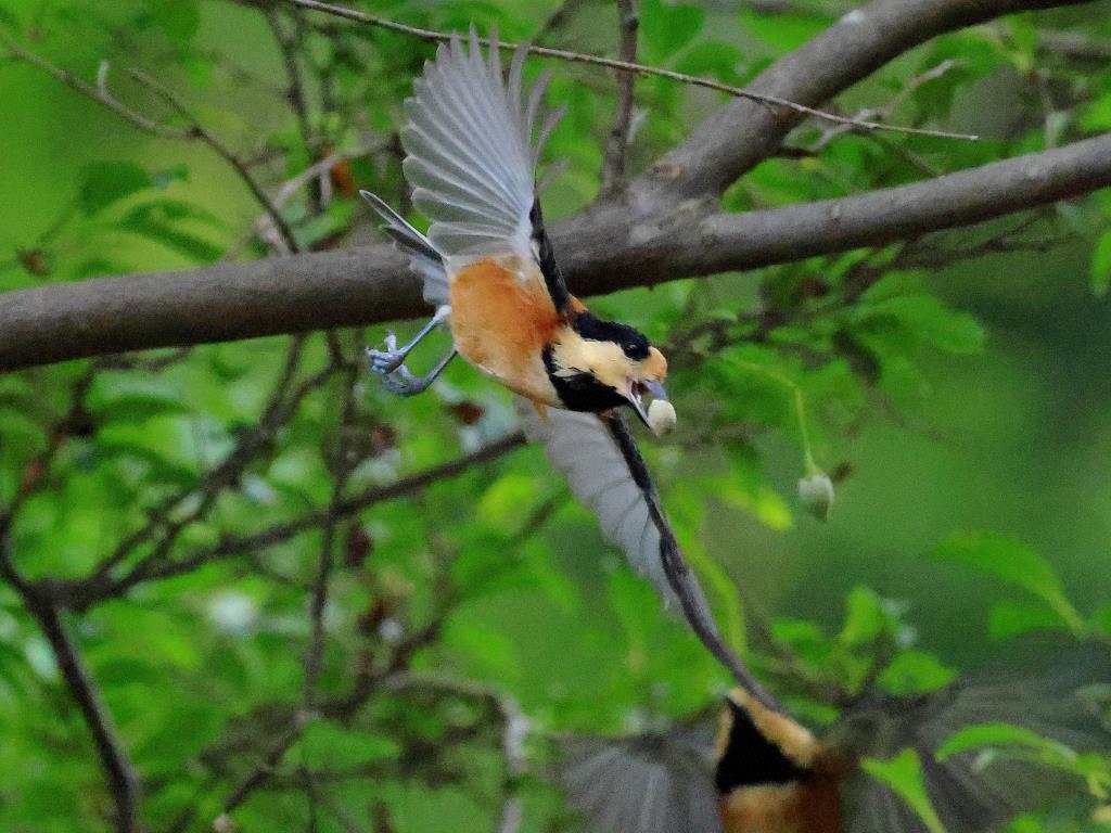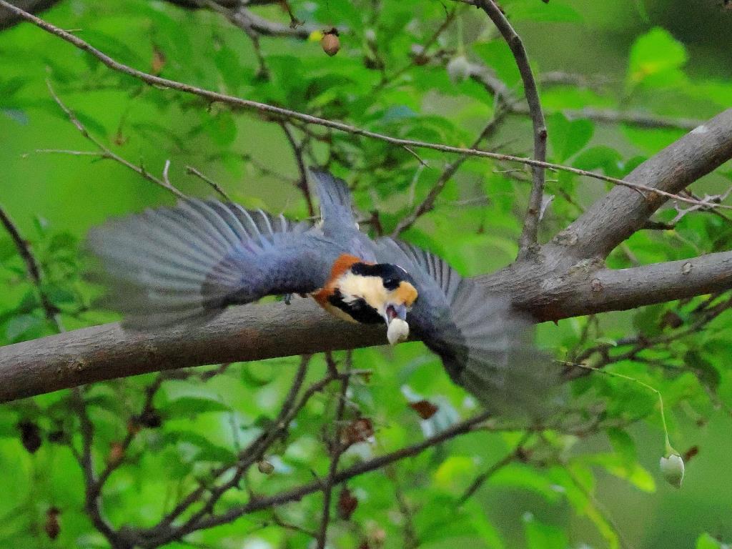 ヤマガラの2,3番目の作品は、枝から飛び出した瞬間を連射され、ヤマガラがエゴの実を咥えながらの飛翔は見応えがあります。