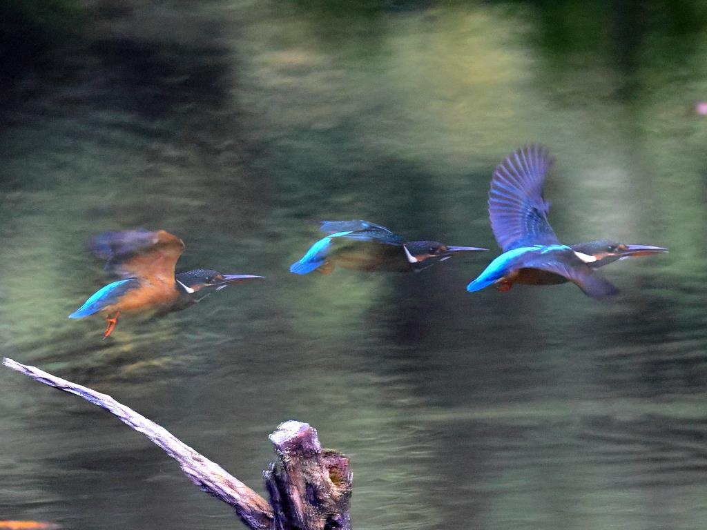 カワセミの連続撮影作品は、飛翔中の羽がブレて躍動感があって、とても鮮明に撮られお見事です。