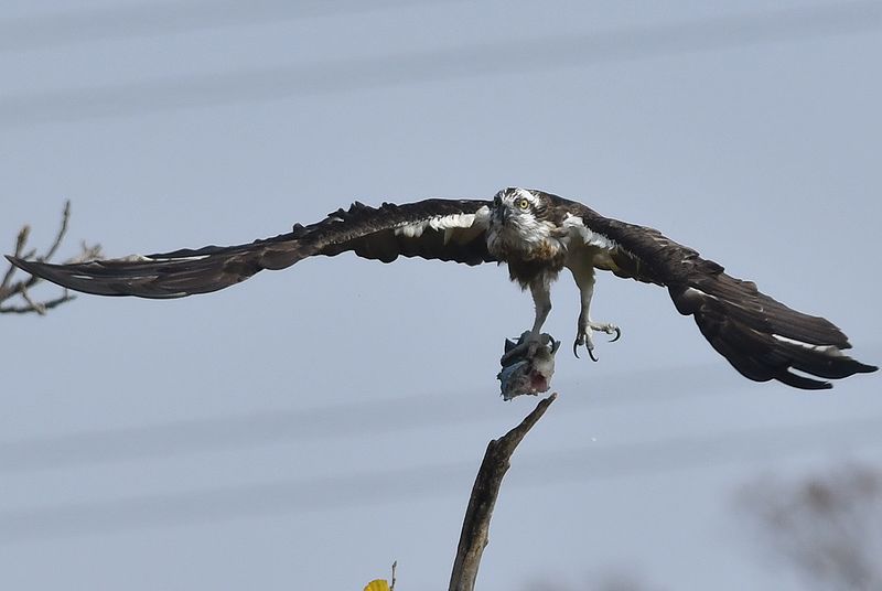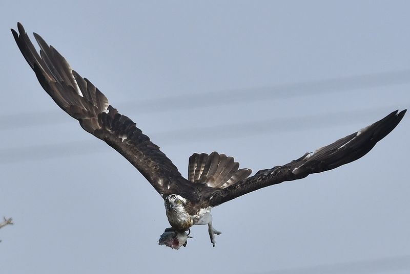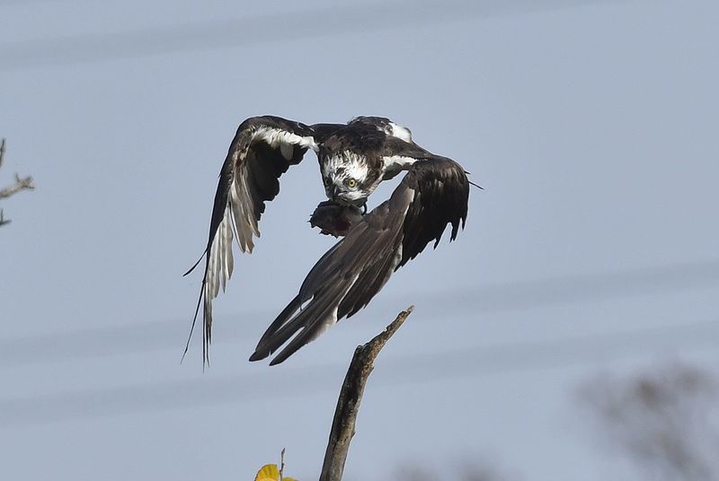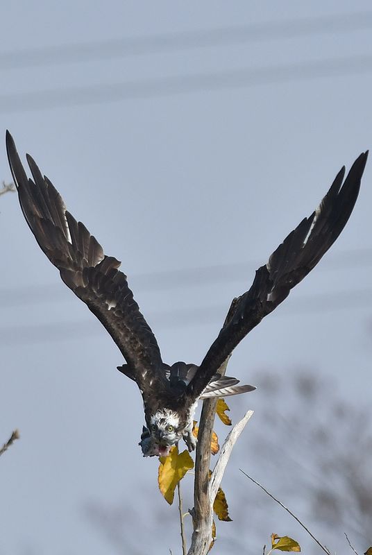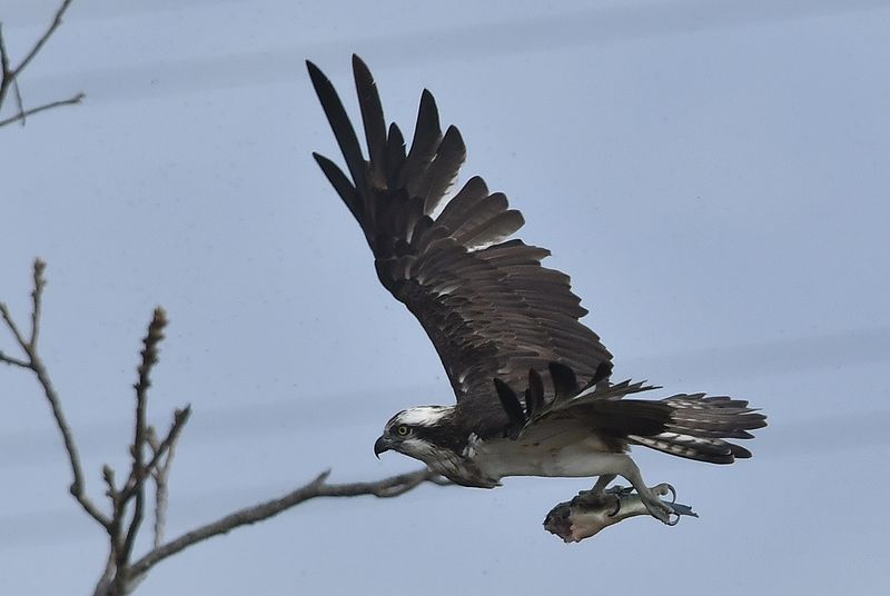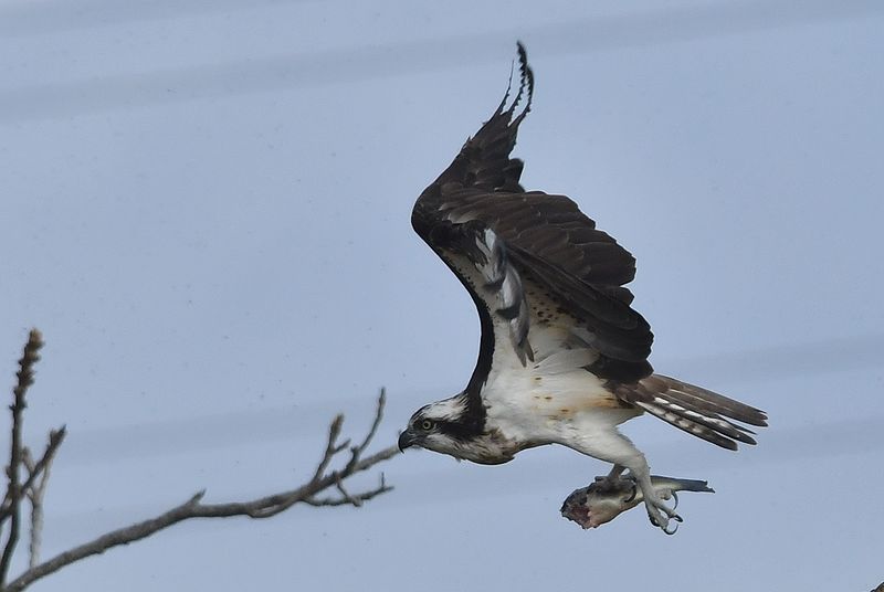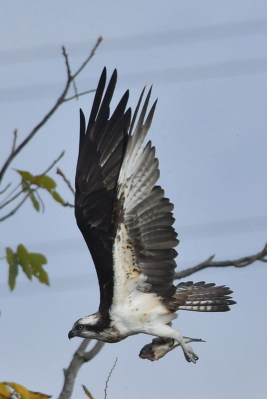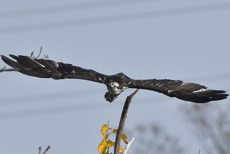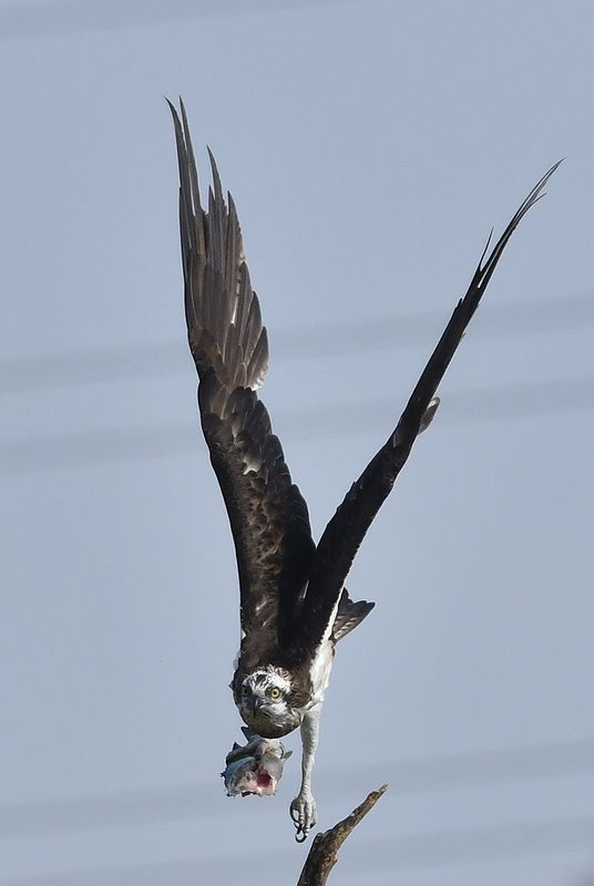 昨日のミサゴは大きな鯉を捕まえて枯れ木で半分食べた所で、カラスが2回も横取りに飛来し、慌てて食べかけの鯉を持って飛び去りました。