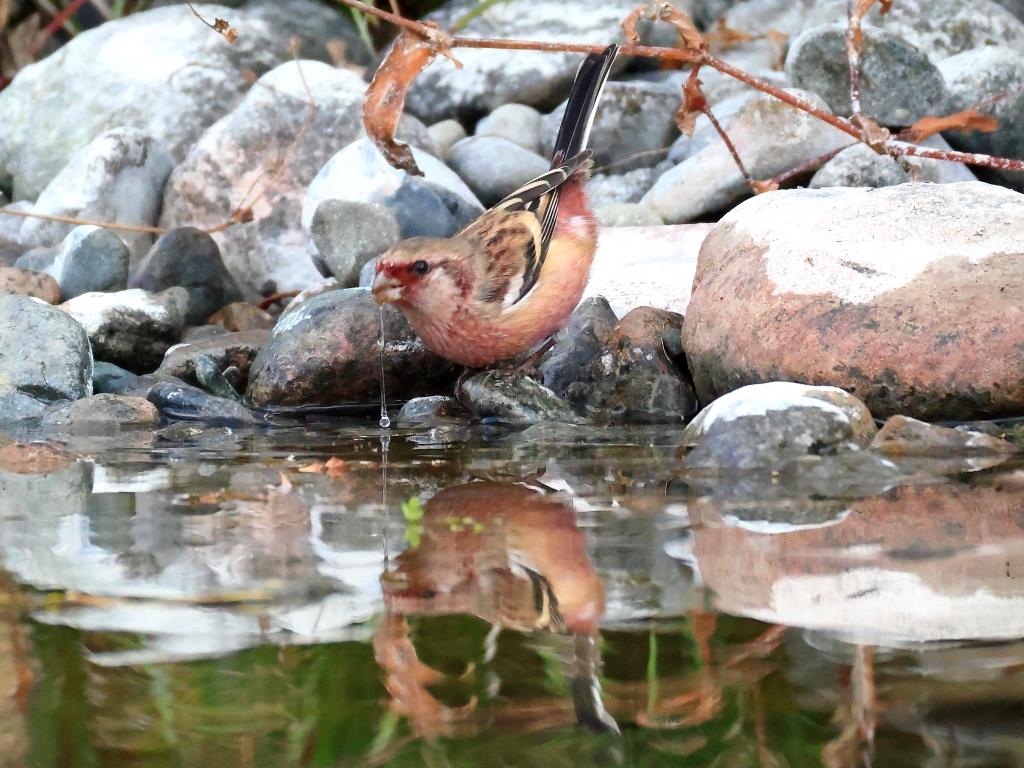 水場で水を飲んでいる各作品は、水面にベニマシコが映って水を飲んでいる所を瞬時に撮られ、こちらも目に光が入って可愛いです。