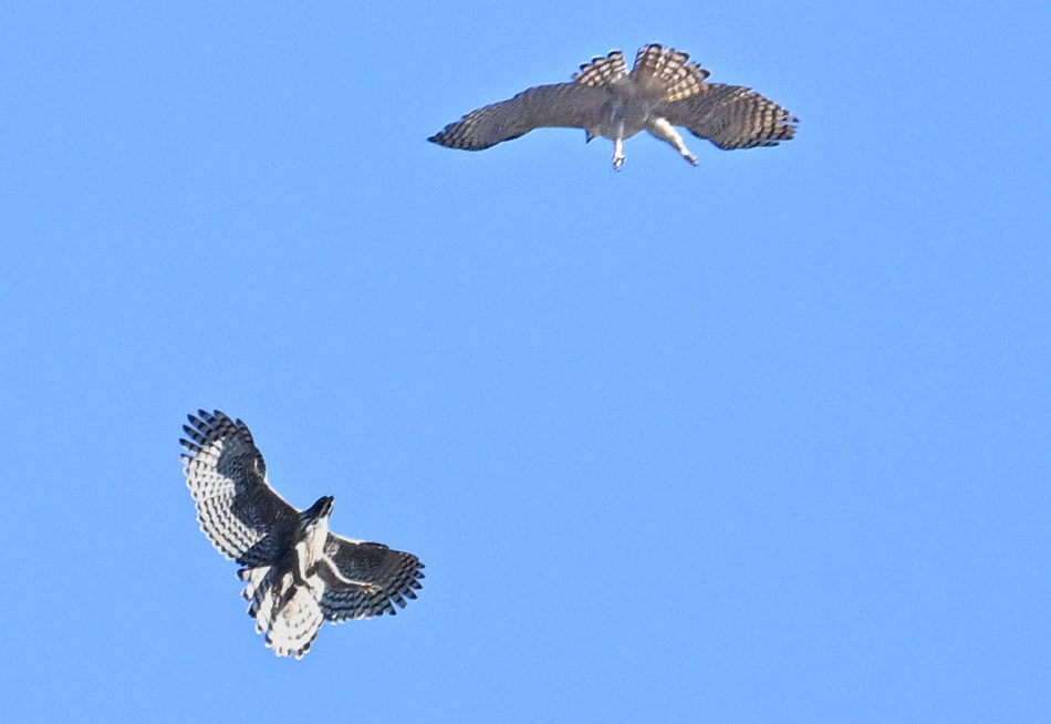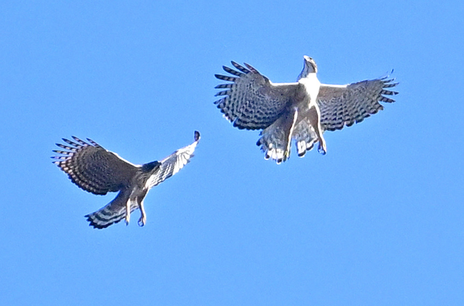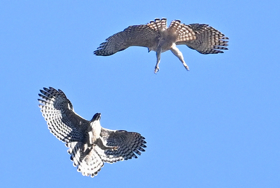 クマタカ作品は、青空バックに2羽の絡みを撮られ、いろいろな動きの場面の大きく開いた羽の紋様が綺麗で躍動感があります。