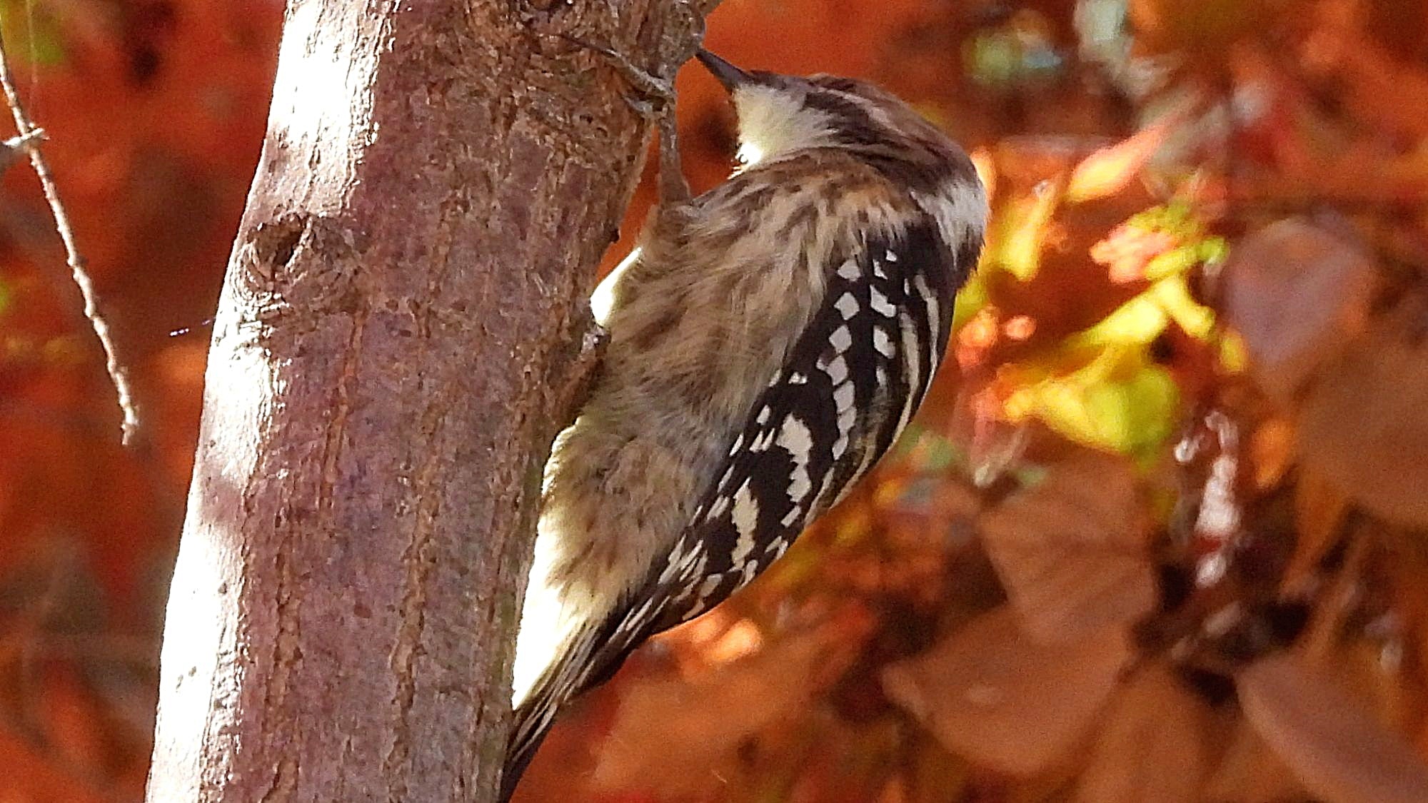 コゲラ作品は、真っ赤な紅葉バックの木に止まった所を捉え、晩秋の雰囲気が出ています。