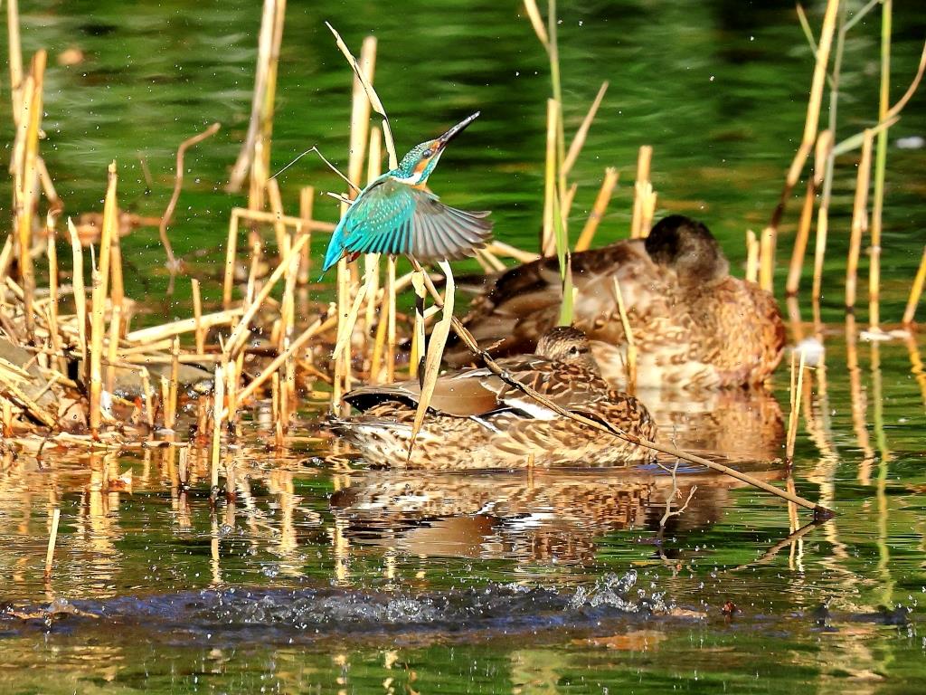 水面からの飛び出しの作品は、水面に水飛沫を残して、飛び上がる場面を撮られ、目にしっかり光が入って、開いた羽が鮮やかでお見事です。