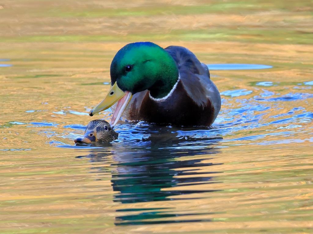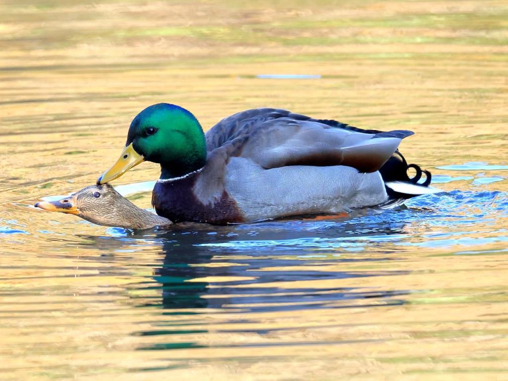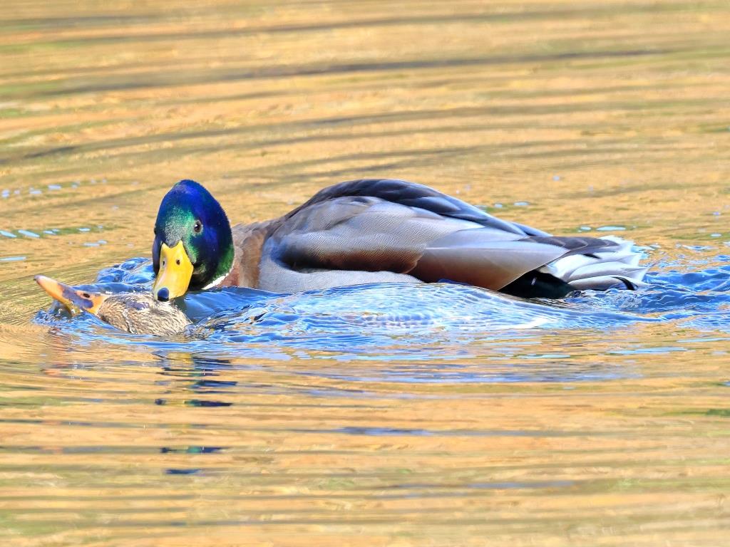 マガモ番作品は、黄金色に輝く水面でマガモの疑似交尾を連続で撮られ、雄雌の目にしっかり光が入って、雄の頭部が鮮やかな緑に光って、微笑ましい交尾場面です。
