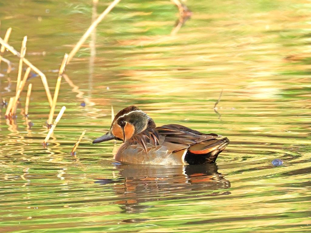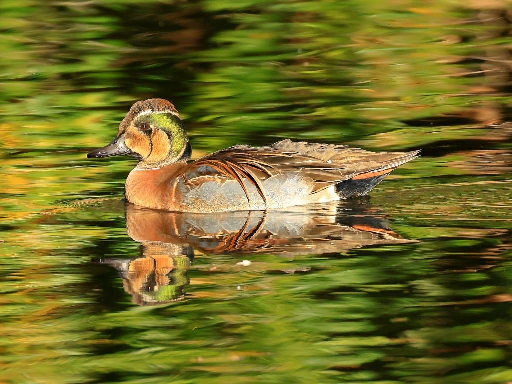 トモエガモ作品は、マガモたちが昼寝をしているのに、トモエガモだけ水面を泳いでくれラッキーで、目に光がしっかり入って頭部の緑が鮮やかです。