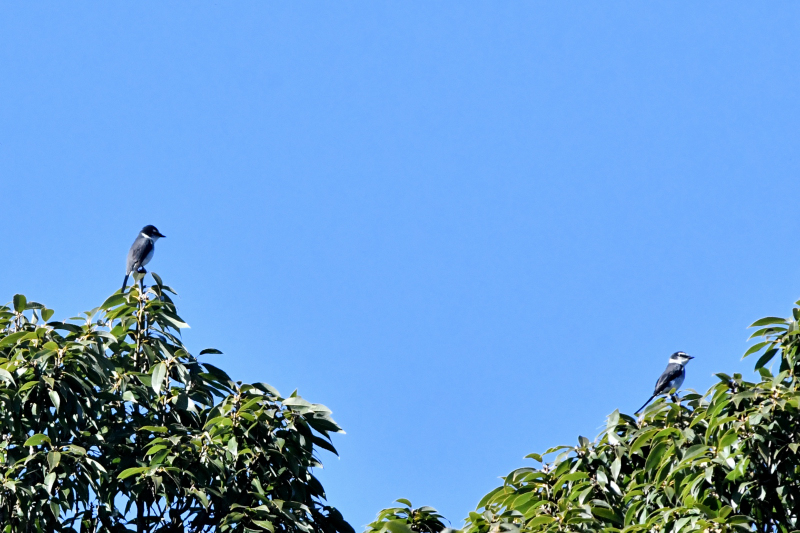 木の天辺に止まった2羽を青空バックに捉え、ナイスショット。