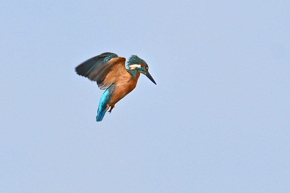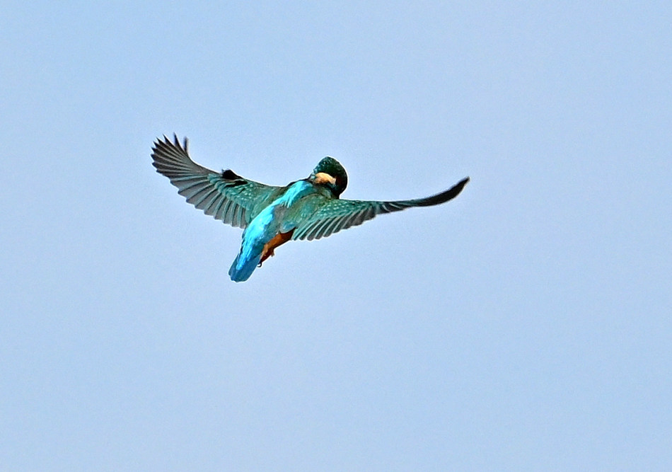 青空バックに小さなカワセミをしっかり捉え、コバルトブルーの発色が綺麗で躍動感があります。