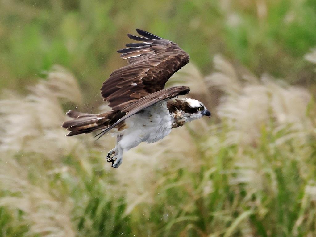 秋色の草バックに、2匹の鮎を捕まえて飛翔している作品は、後方に飛び去ったために鮎2匹を強調出来たのに、顔の表情が出見えないのが残念でしたね。