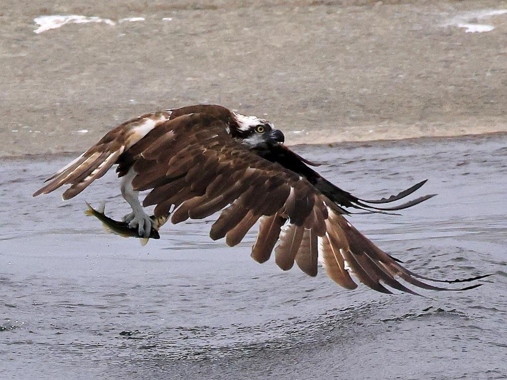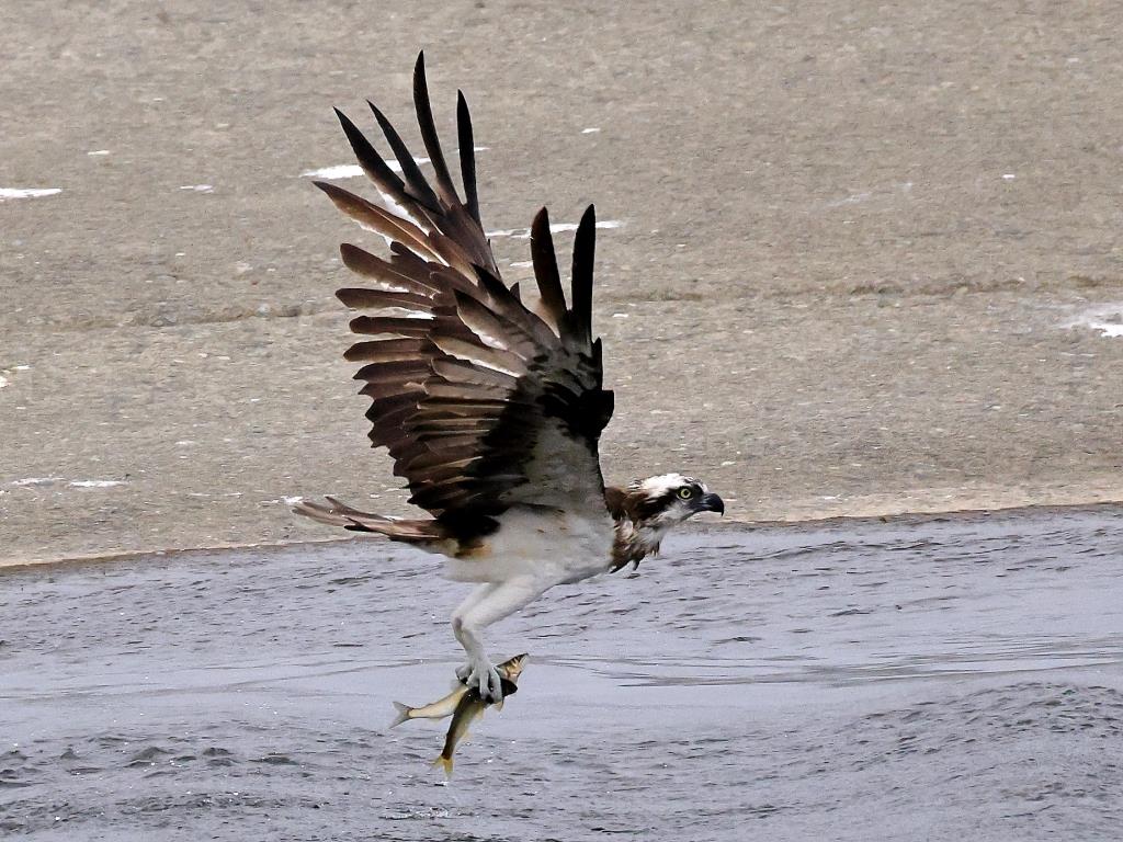 最後の2作品は、旋回して近くに飛翔した時はしっかり鮎2匹を掴んで、精悍な黄色い目が引き立ち、スケールの大きな作品です。