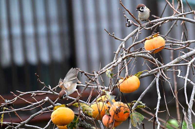 秋らしく 柿とスズメ スズメはあまり撮って貰えないので