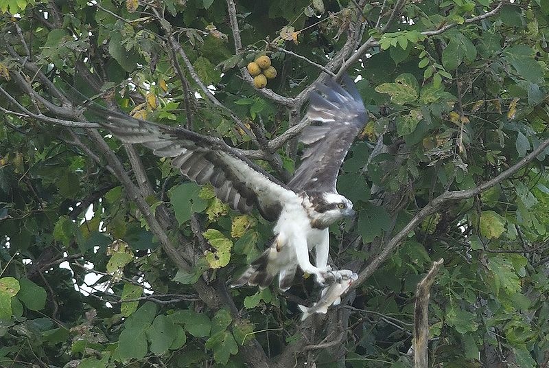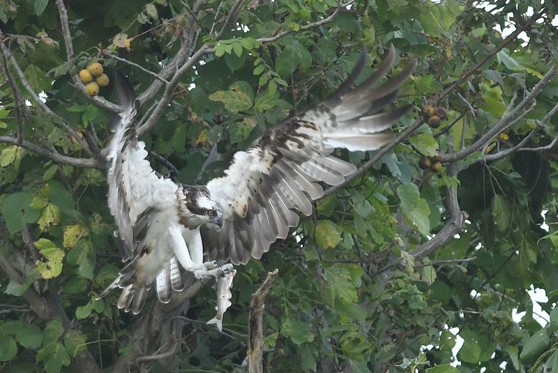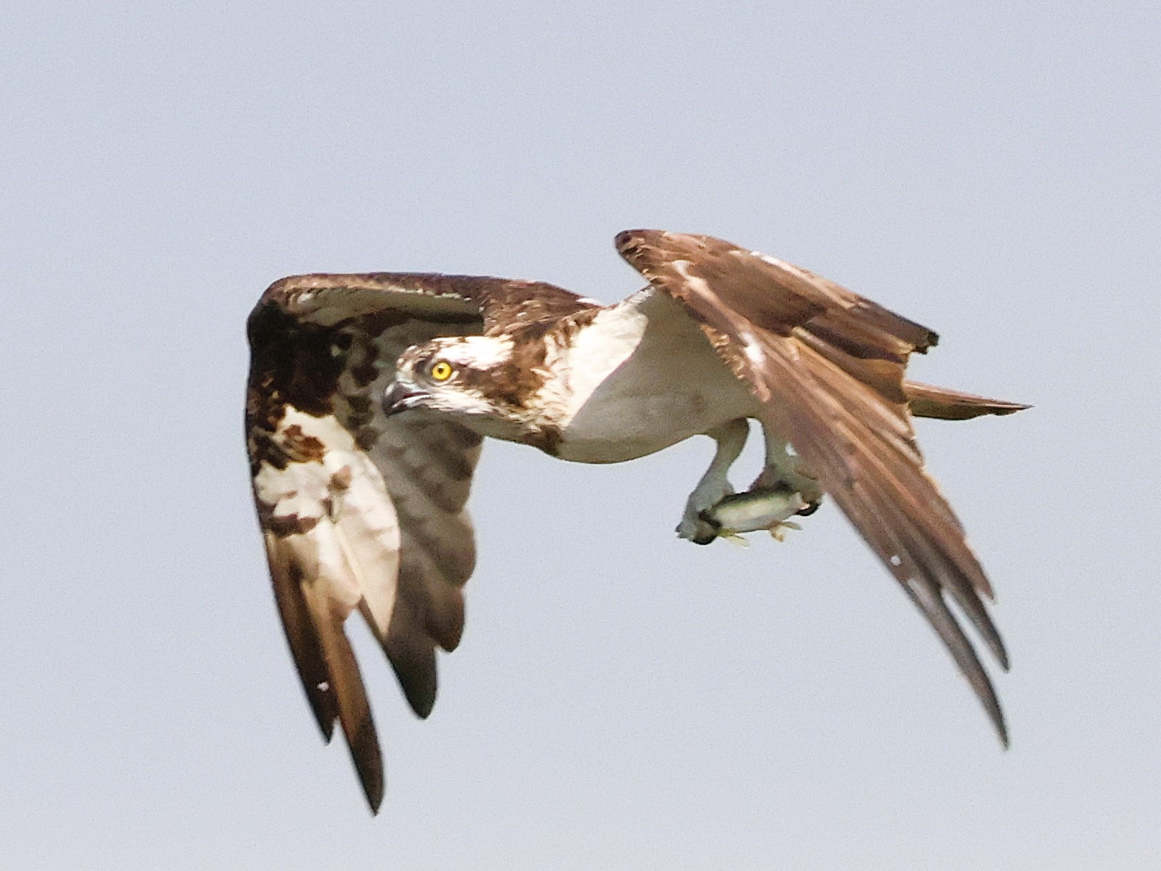 画像は、雌親のミサゴが鮎を掴めて枝に止まってくれました。