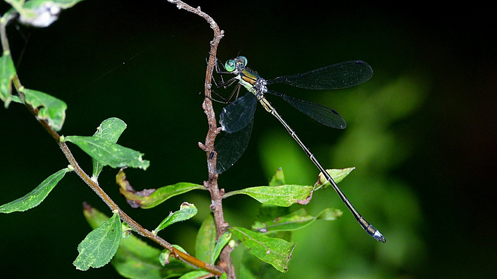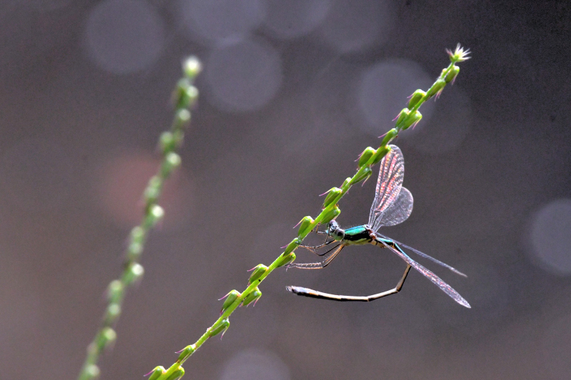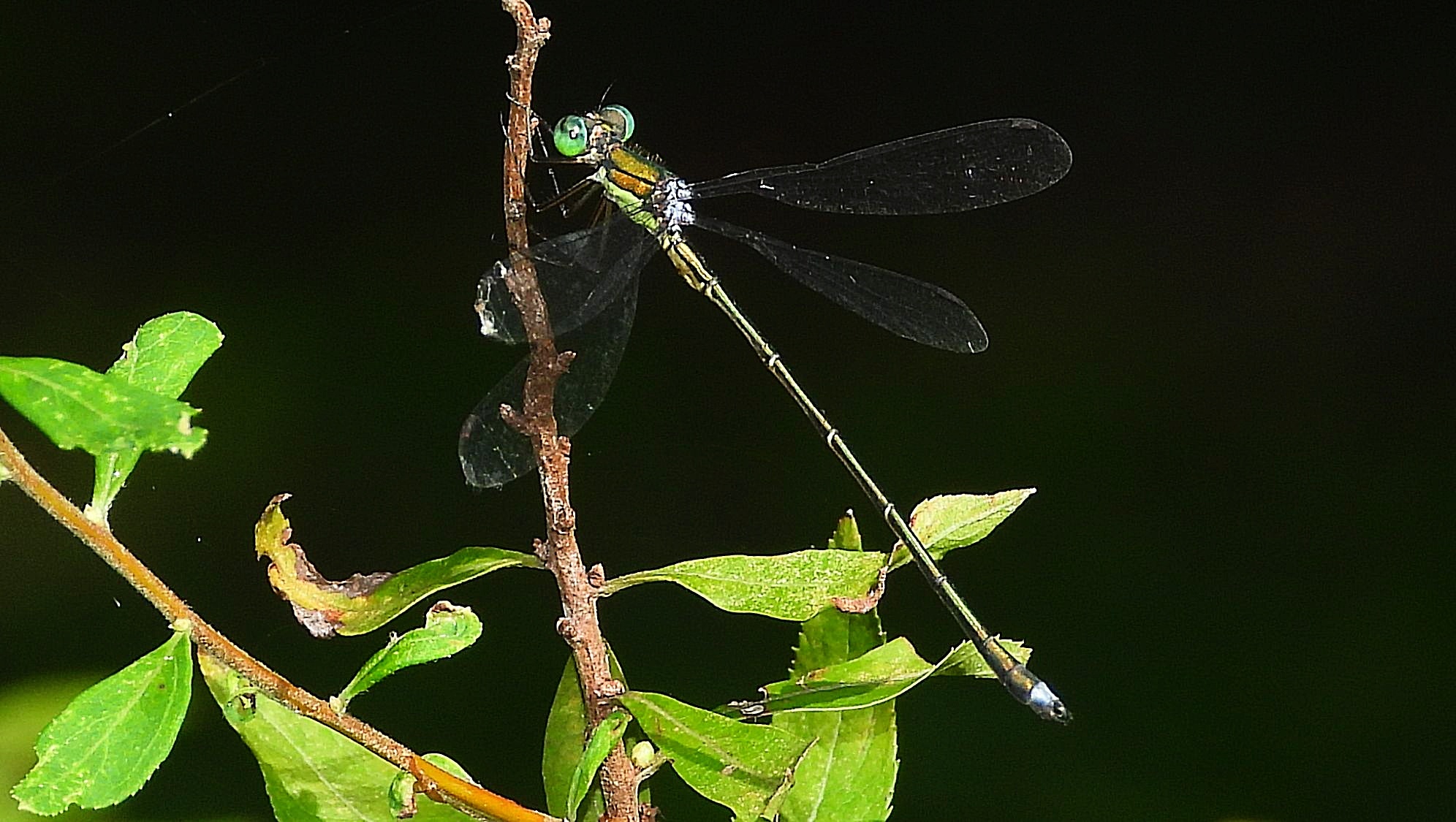 オオアオイトトンボ作品は、細い枝に止まった所を捉え、羽が光って綺麗で、身体全体の描写が鮮明でバックが抜けてトンボが引き立っています。