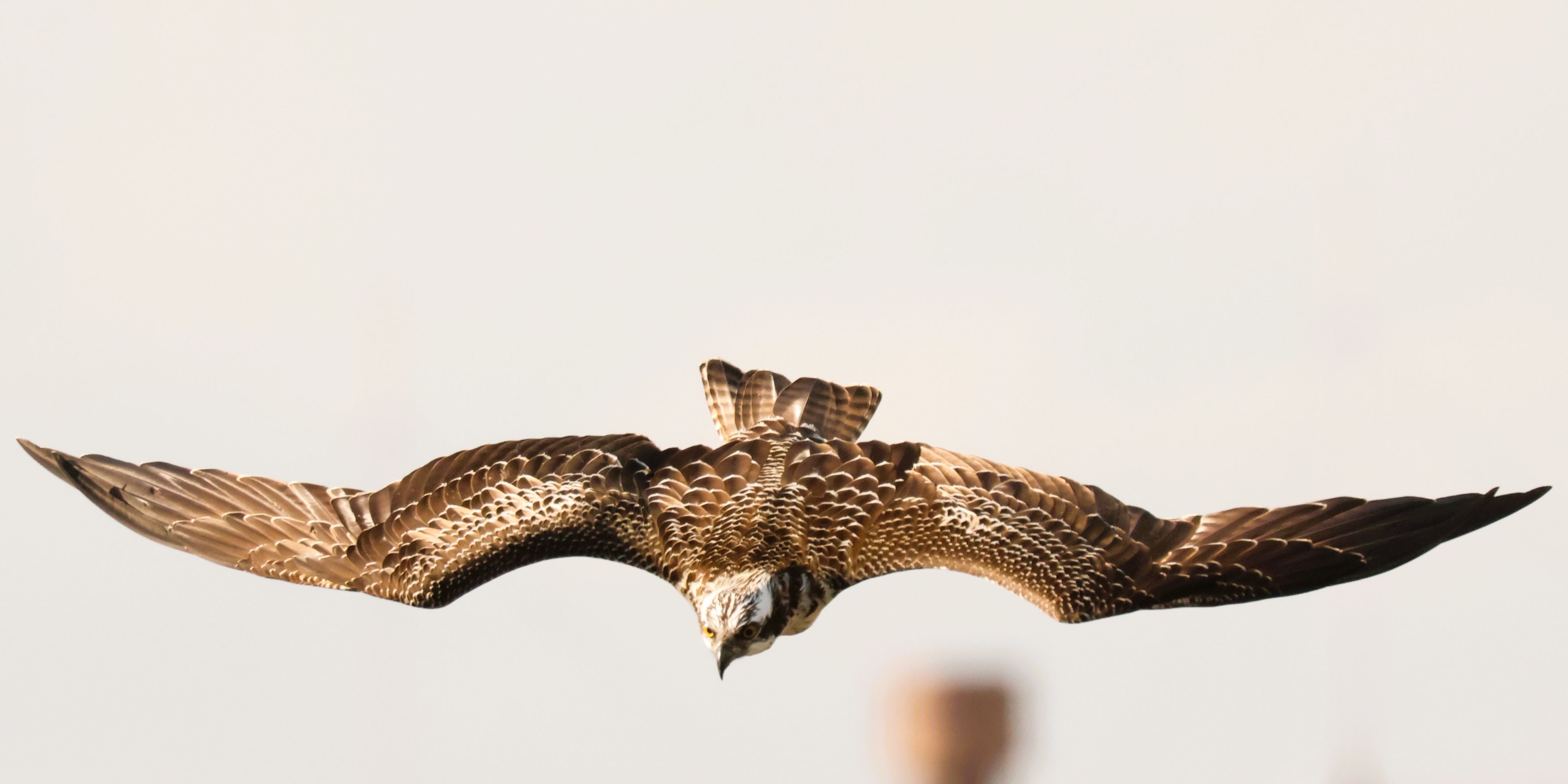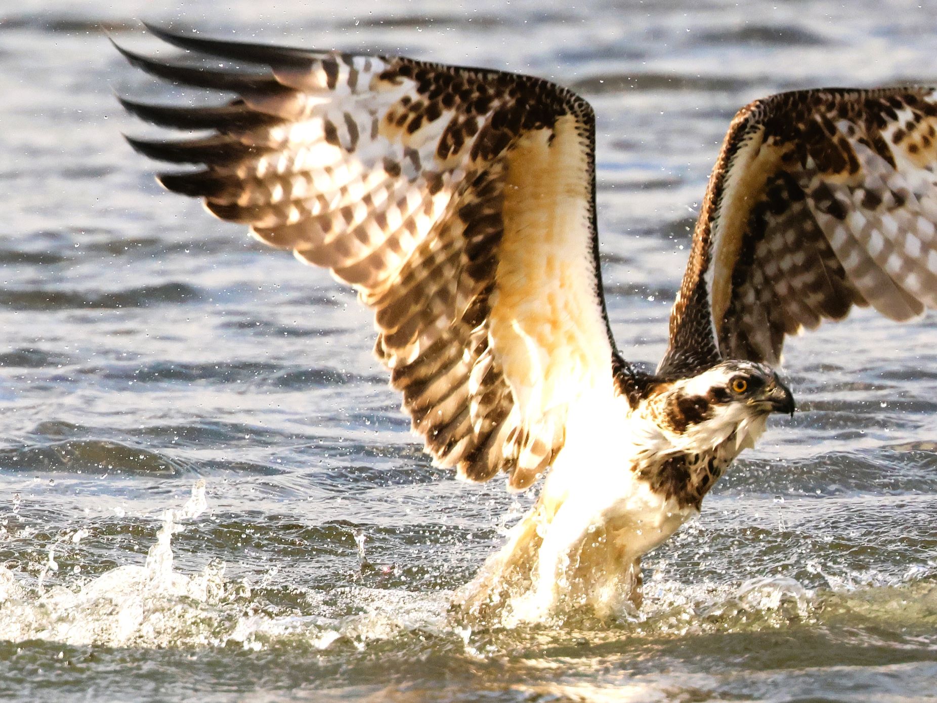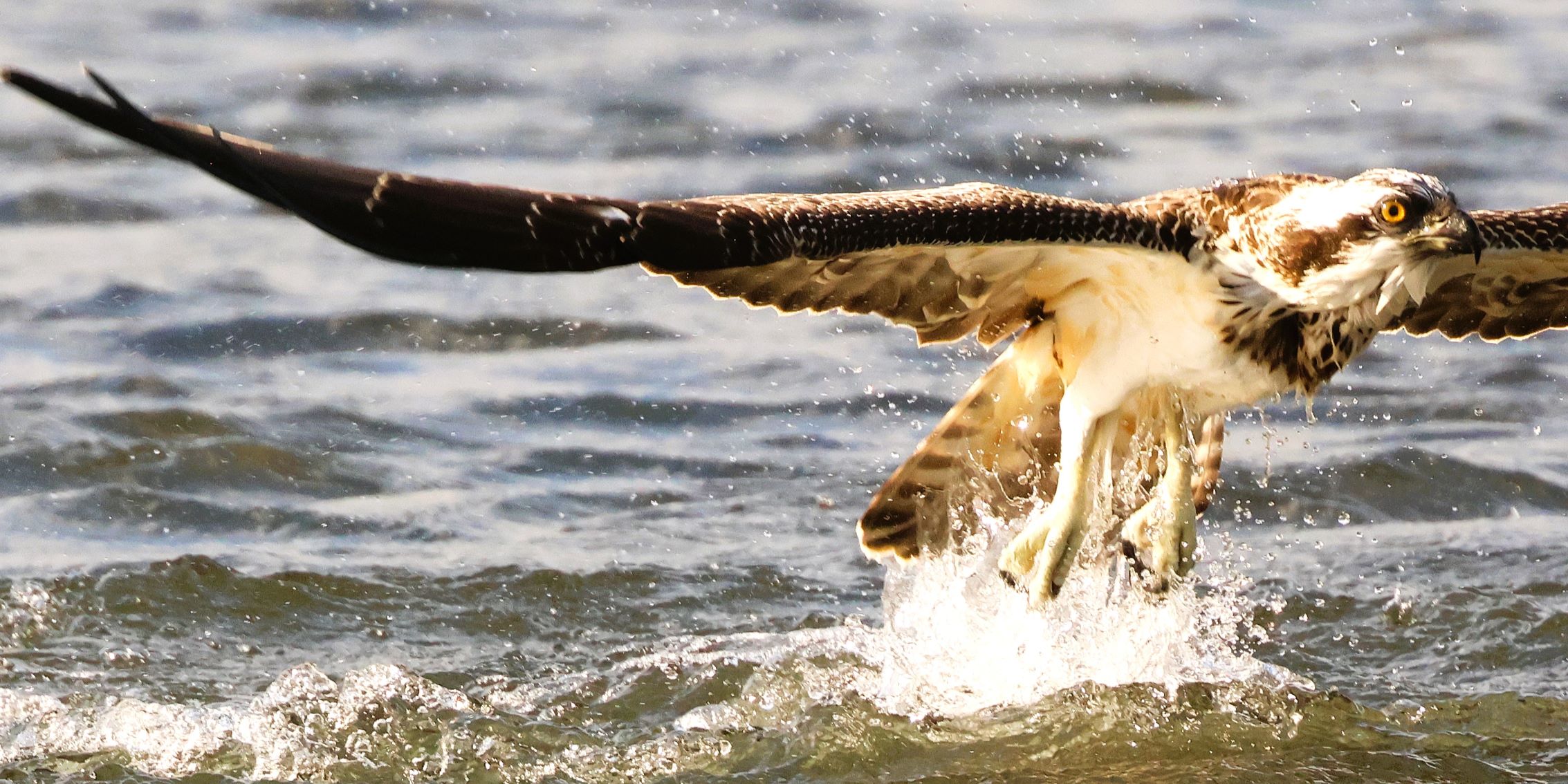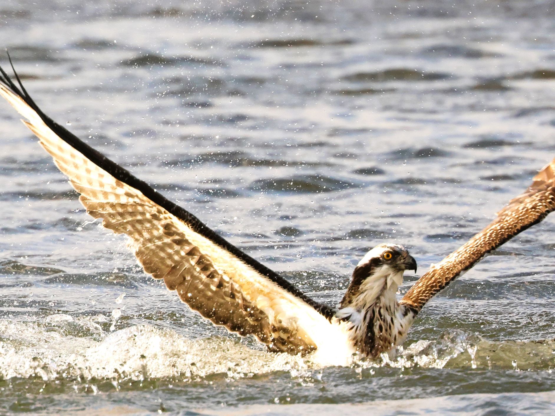 ミサゴのホバーリングから川から飛び出し場面まで連続撮影された作品は、飛び込み態勢の精悍な目と広げた羽がミサゴらしいです。