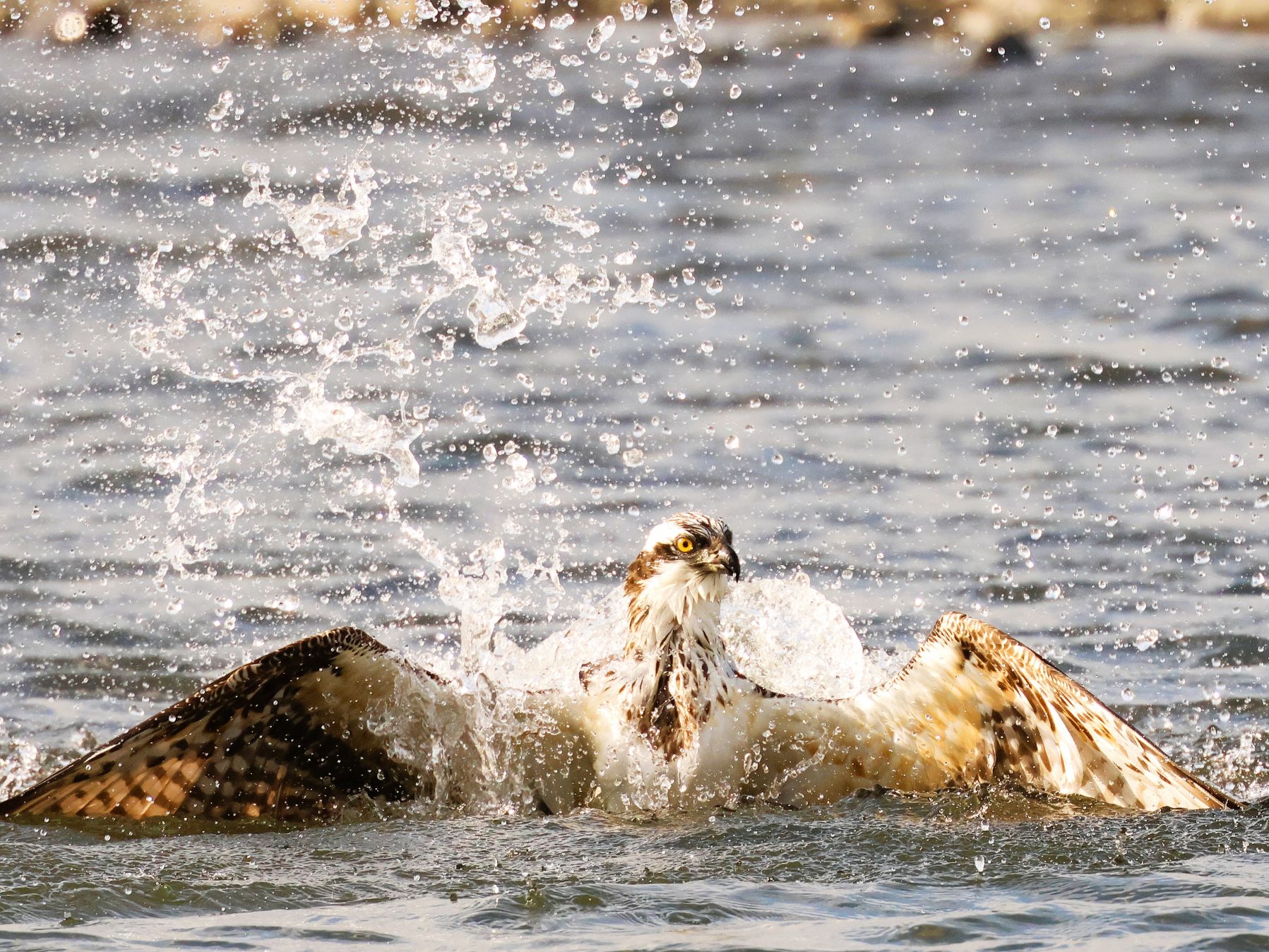 川に飛び込んだ瞬間の3作品は、豪快な水しぶきが上がって3枚目の作品のミサゴの精悍な黄色い目が印象的です。