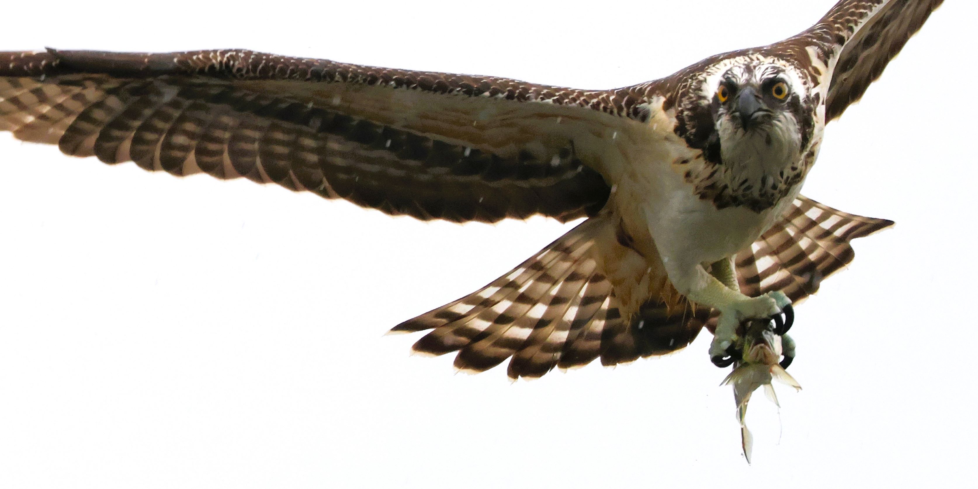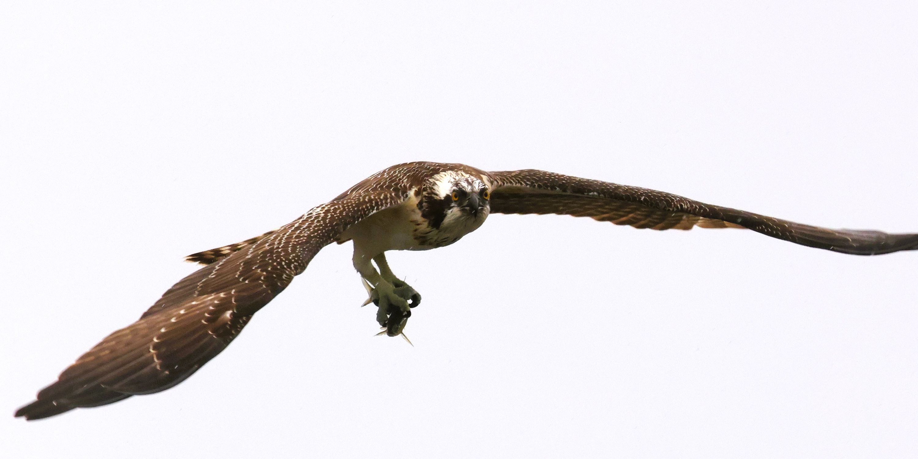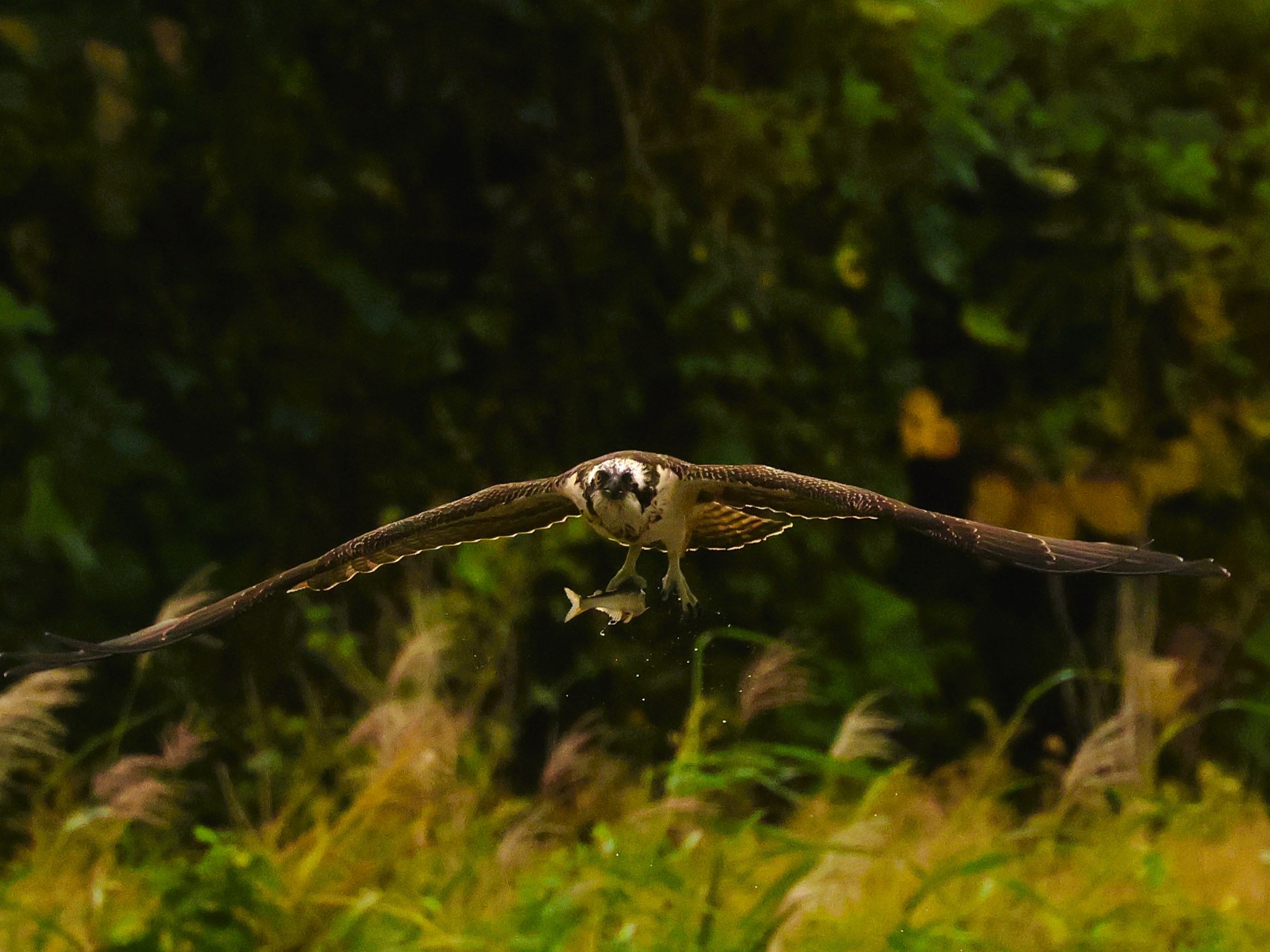 鮎を捕まえての飛翔各作品は、曇天の空抜けの厳しい撮影条件でしたが、連続撮影でミサゴの精悍な黄色い目にしっかり光が入って、しっかり鮎を掴んでいる姿は、迫力があってとても描写が鮮明で躍動感があります。