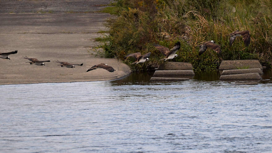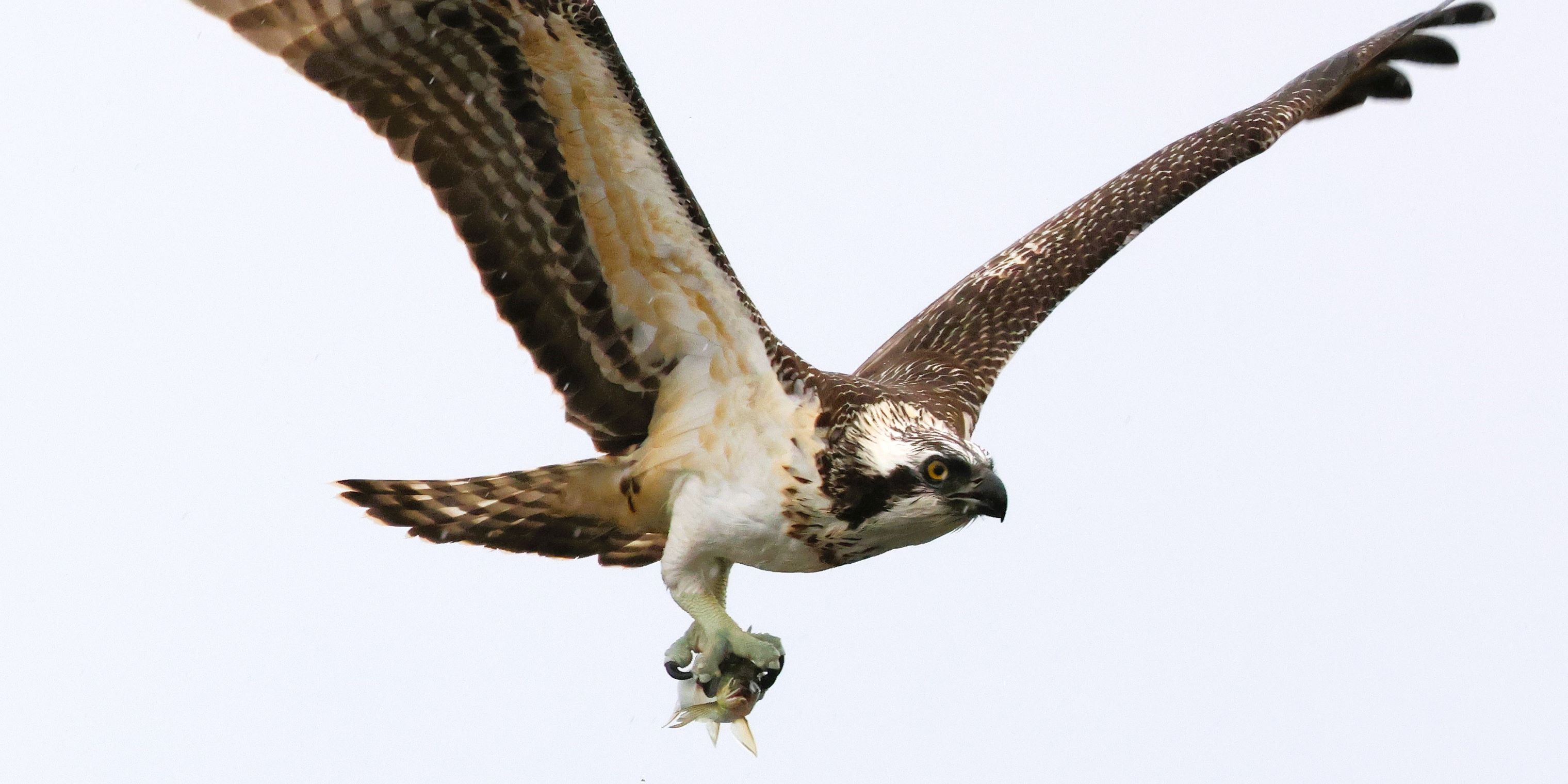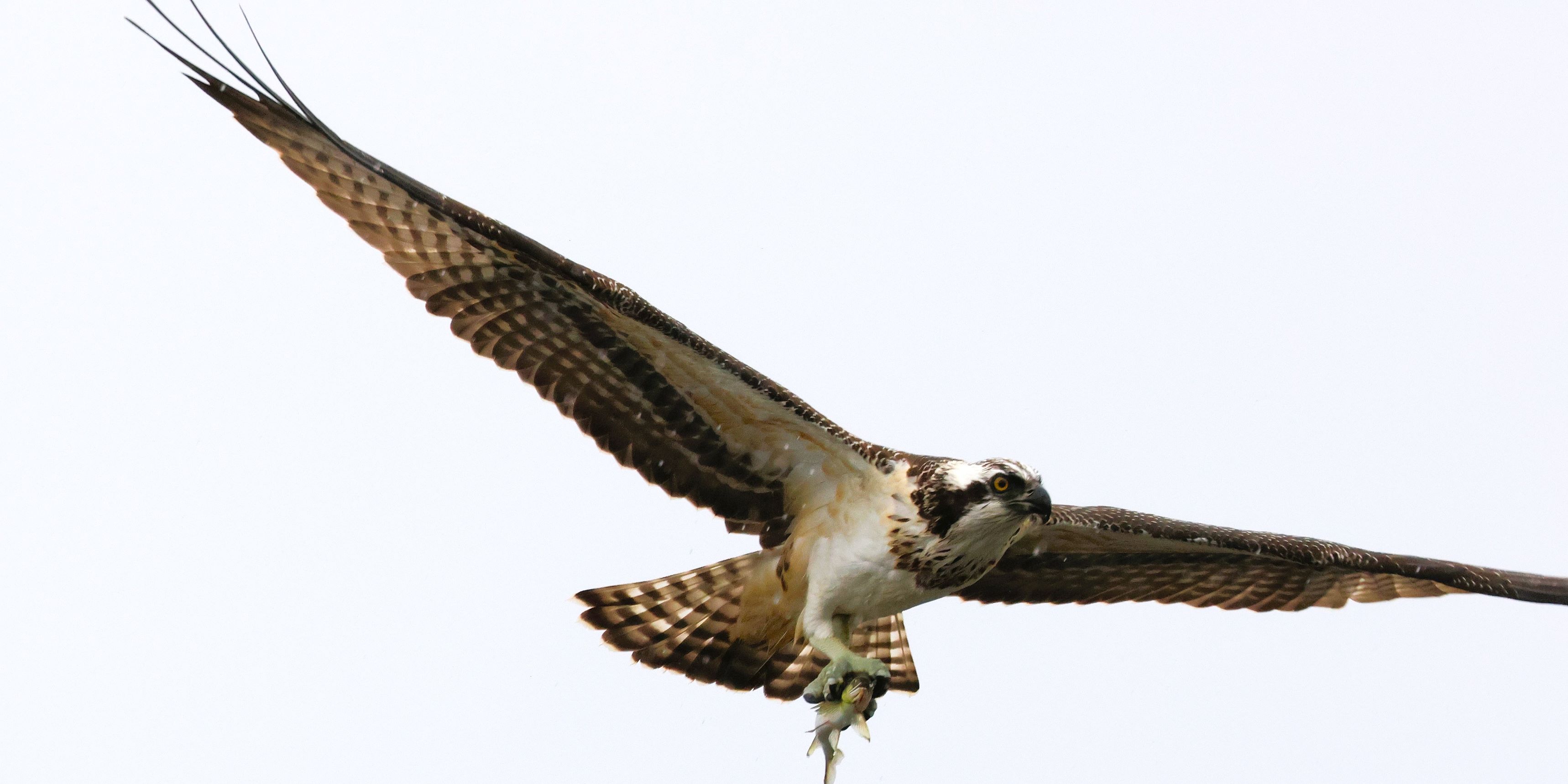 鮎を捕まえての飛翔各作品は、曇天の空抜けの厳しい撮影条件でしたが、連続撮影でミサゴの精悍な黄色い目にしっかり光が入って、しっかり鮎を掴んでいる姿は、迫力があってとても描写が鮮明で躍動感があります。