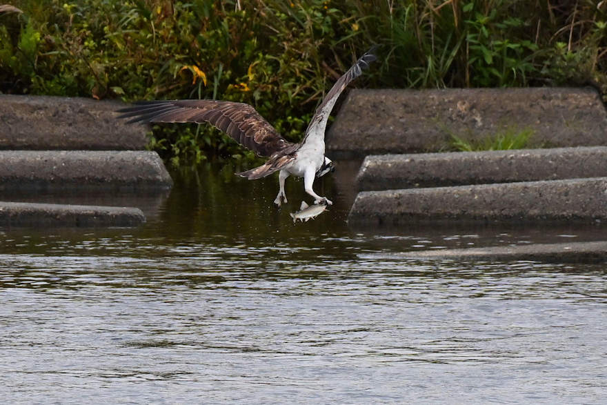 相模川中流域のミサゴが川に飛び込んで落ち鮎を捕まえる場面を撮り始めて1ケ月以上が過ぎ、当初のように1日6〜8回の飛び込み場面は殆どなく、1日1回飛び込み場面が撮れれば良い状態が続いています。