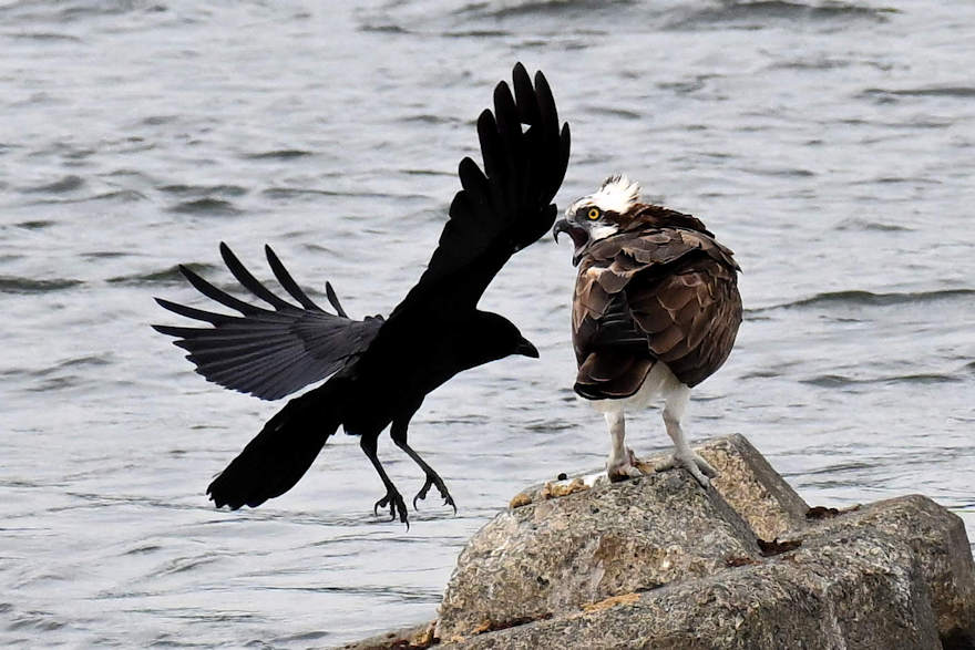 カラスとミサゴのバトル作品は、カラスがミサゴの餌を奪おうと飛来した所を、ミサゴが大きな口を開けて威嚇している場面は見応えがあります。