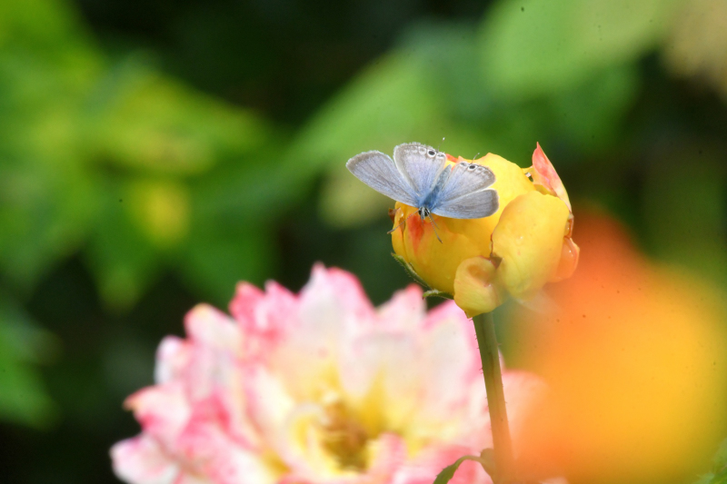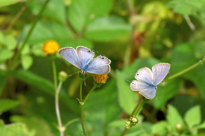 ウラナミシジミ2作品は、花の蜜を吸いに飛来した所を捉え、最初の作品は明るい作品でシジミの目が可愛いです。