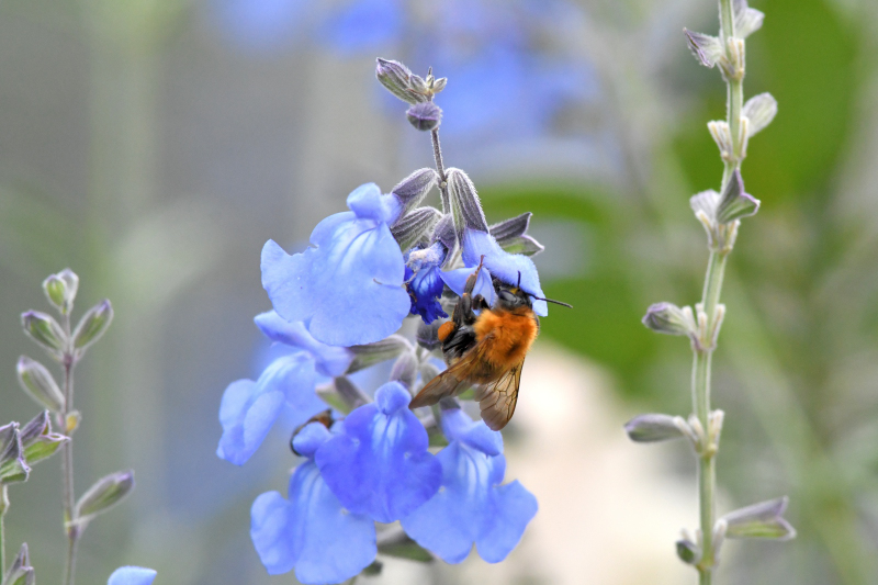 トラマルハナバチ作品は、鮮やかな青い花の蜜を吸いに飛来した所を捉え、顔の表情が出て、こちらも明るい作品です。