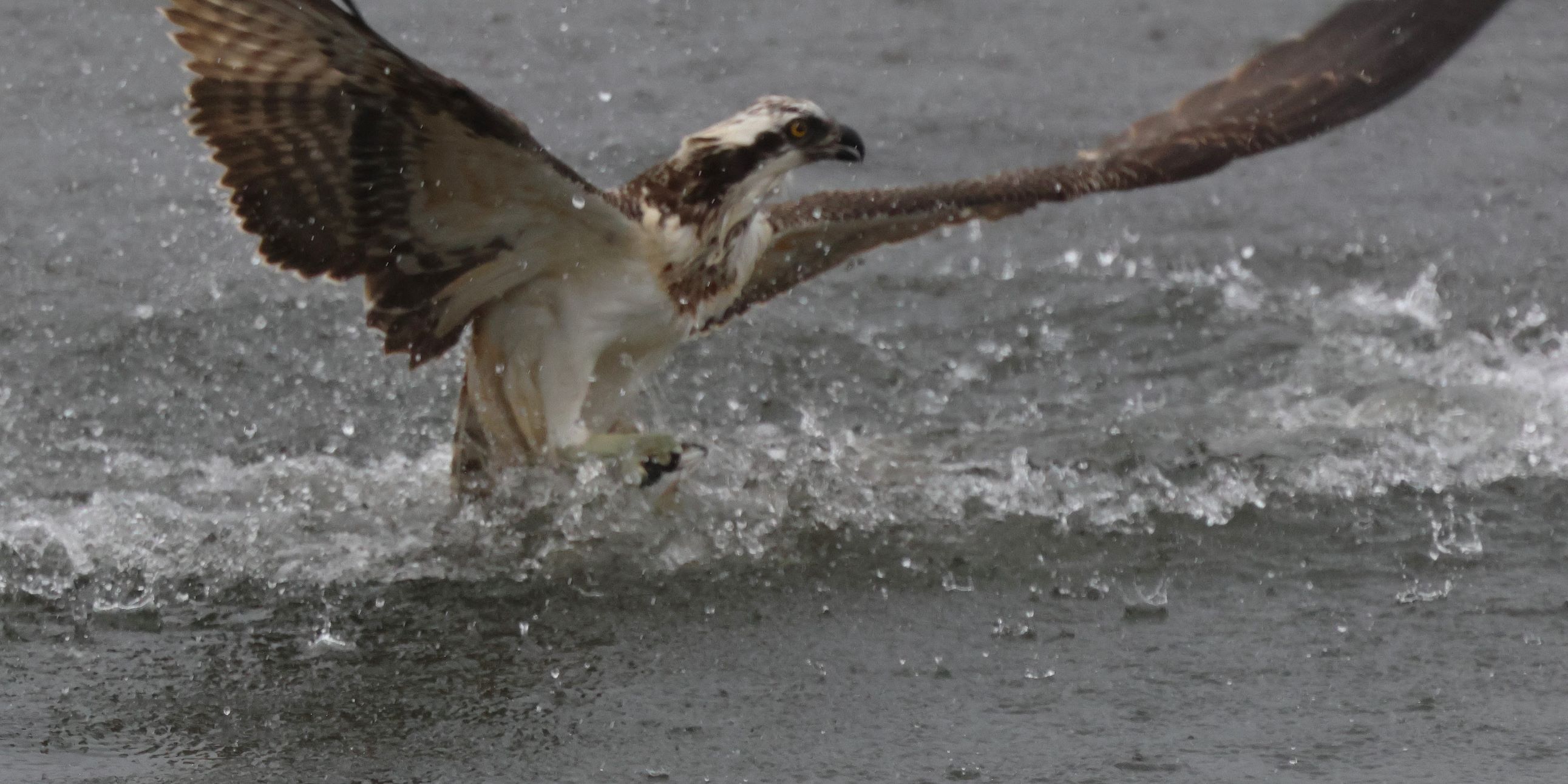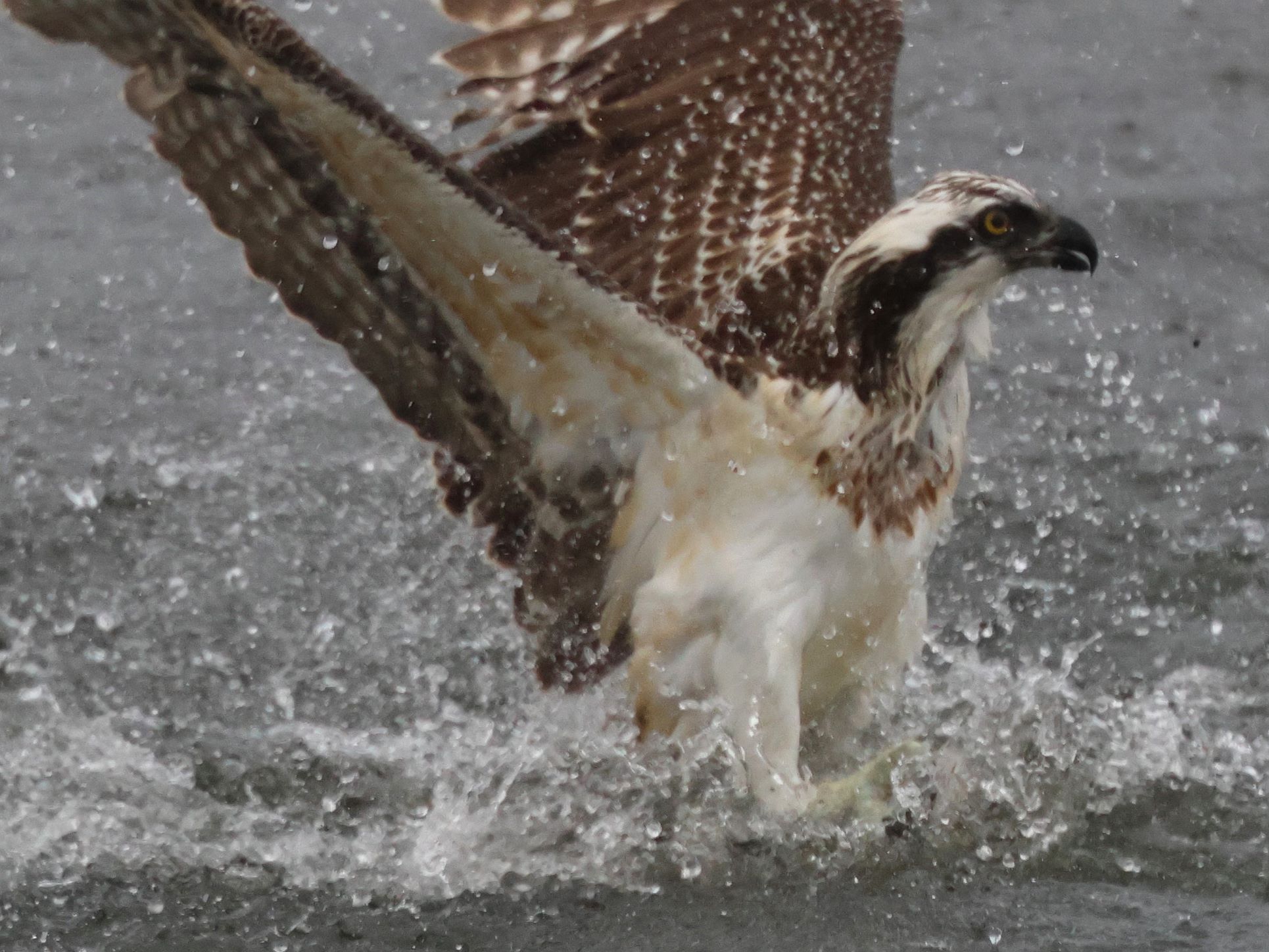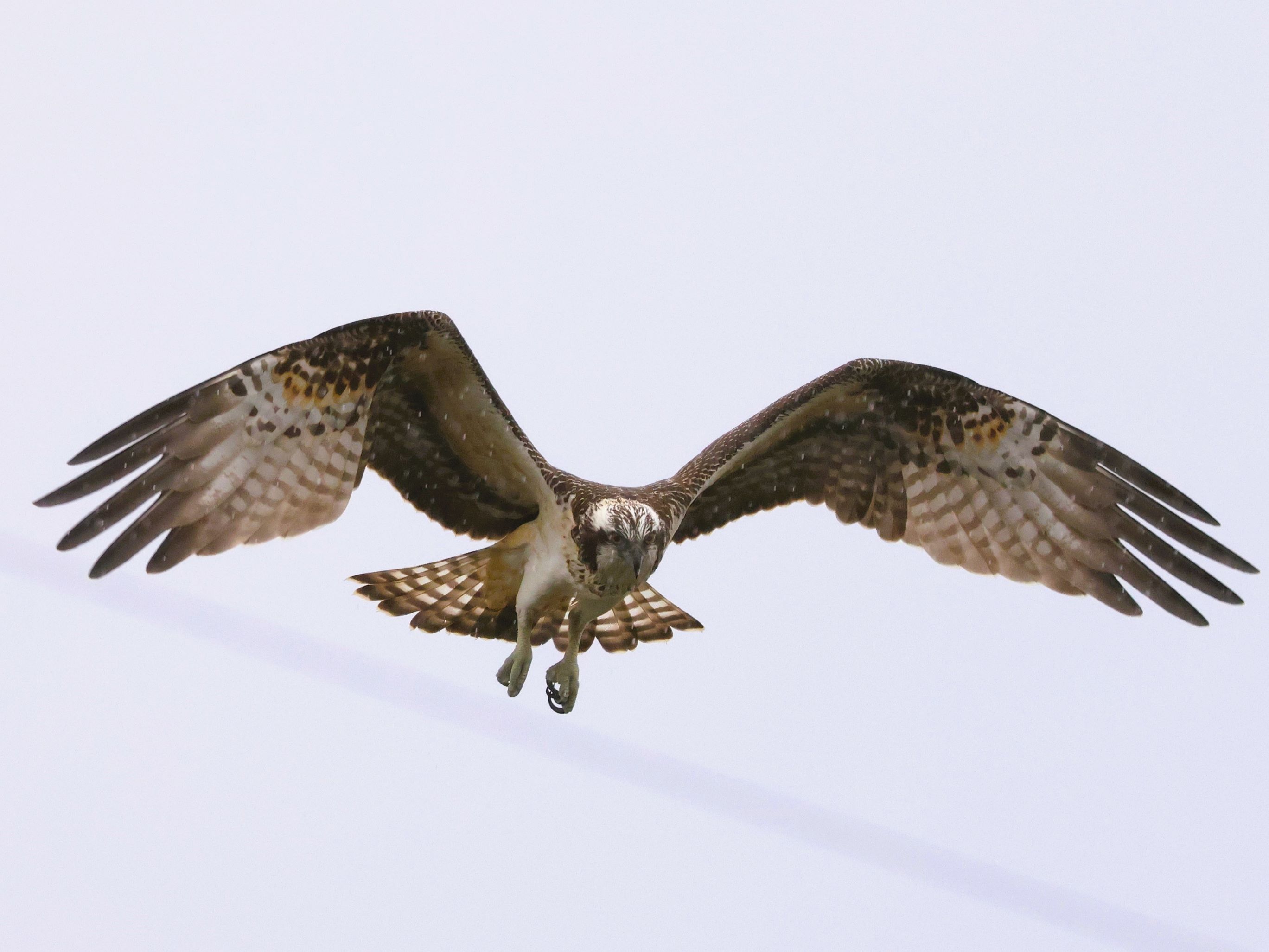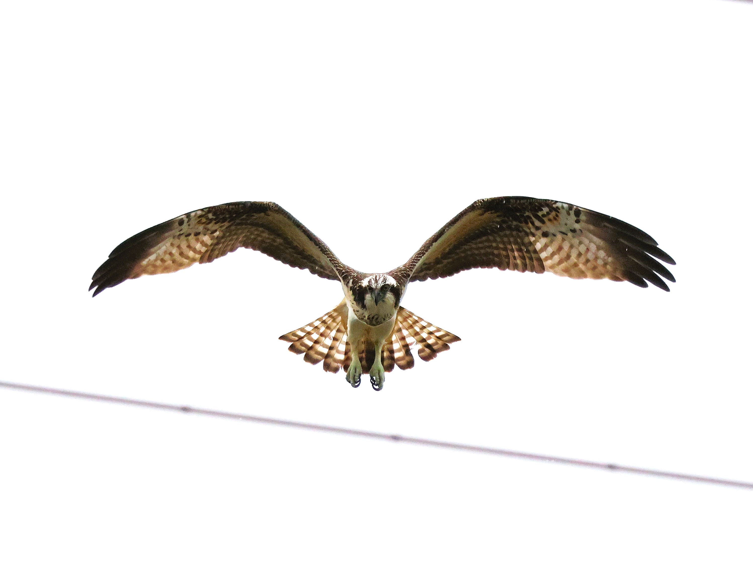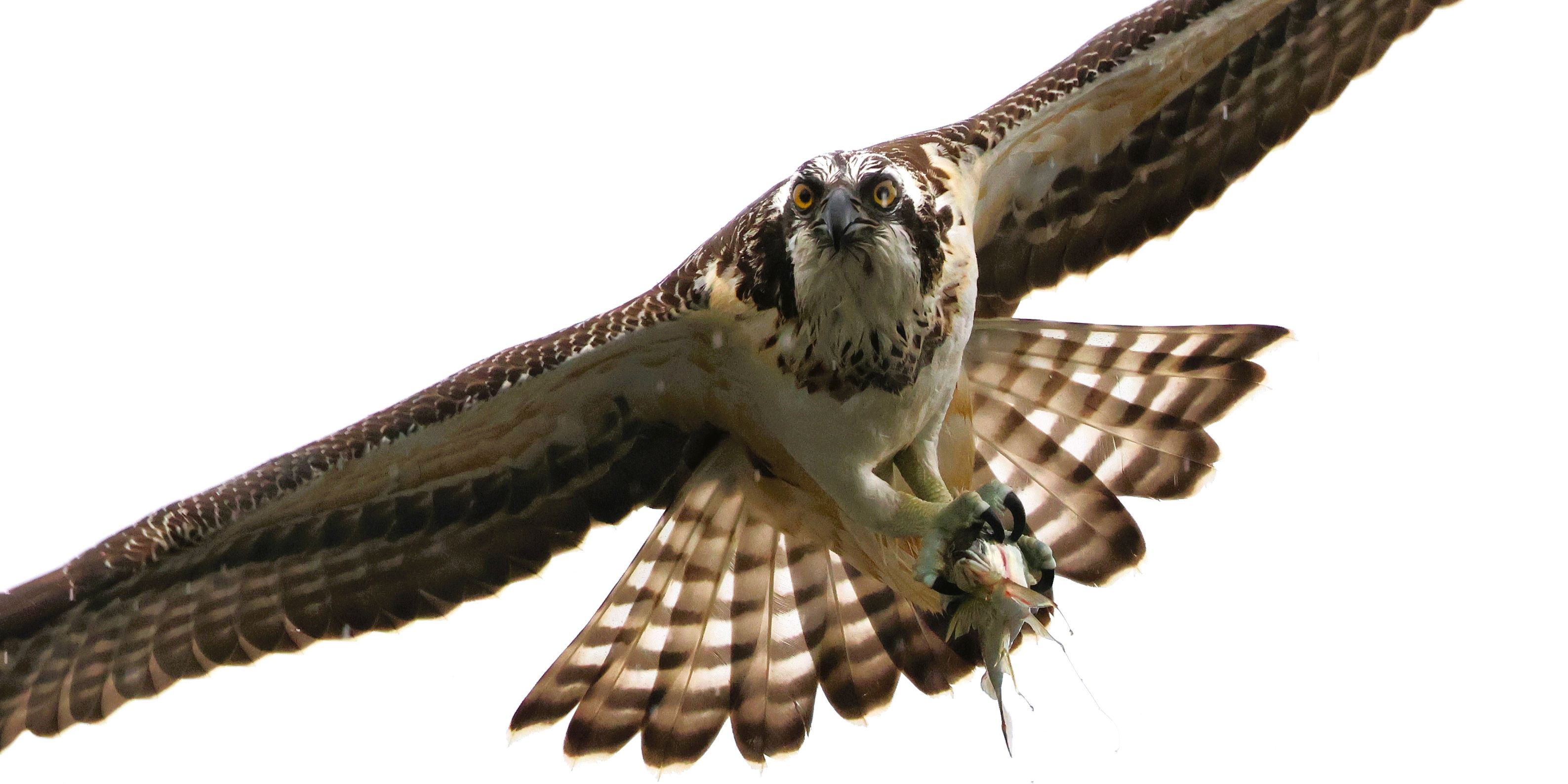 飛び込み態勢のミサゴは、スピード感があって、開いた羽の模様がとても綺麗です。