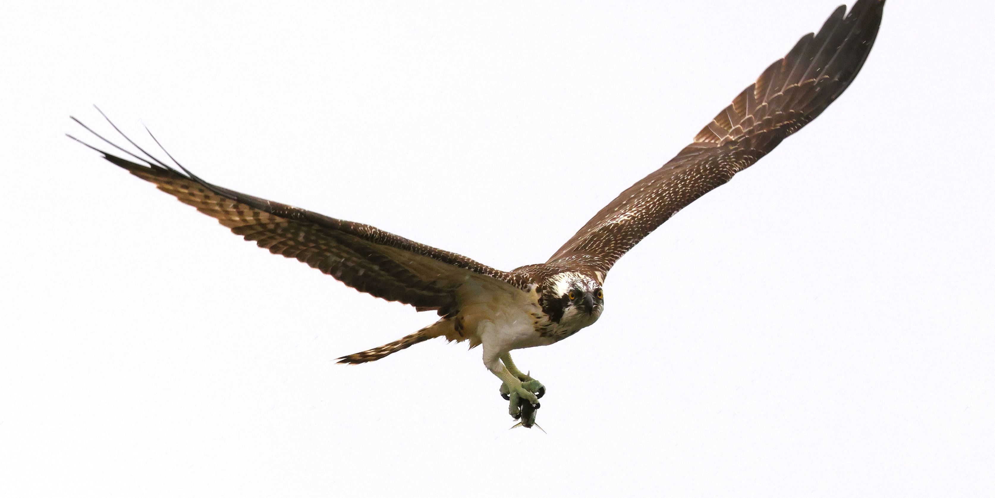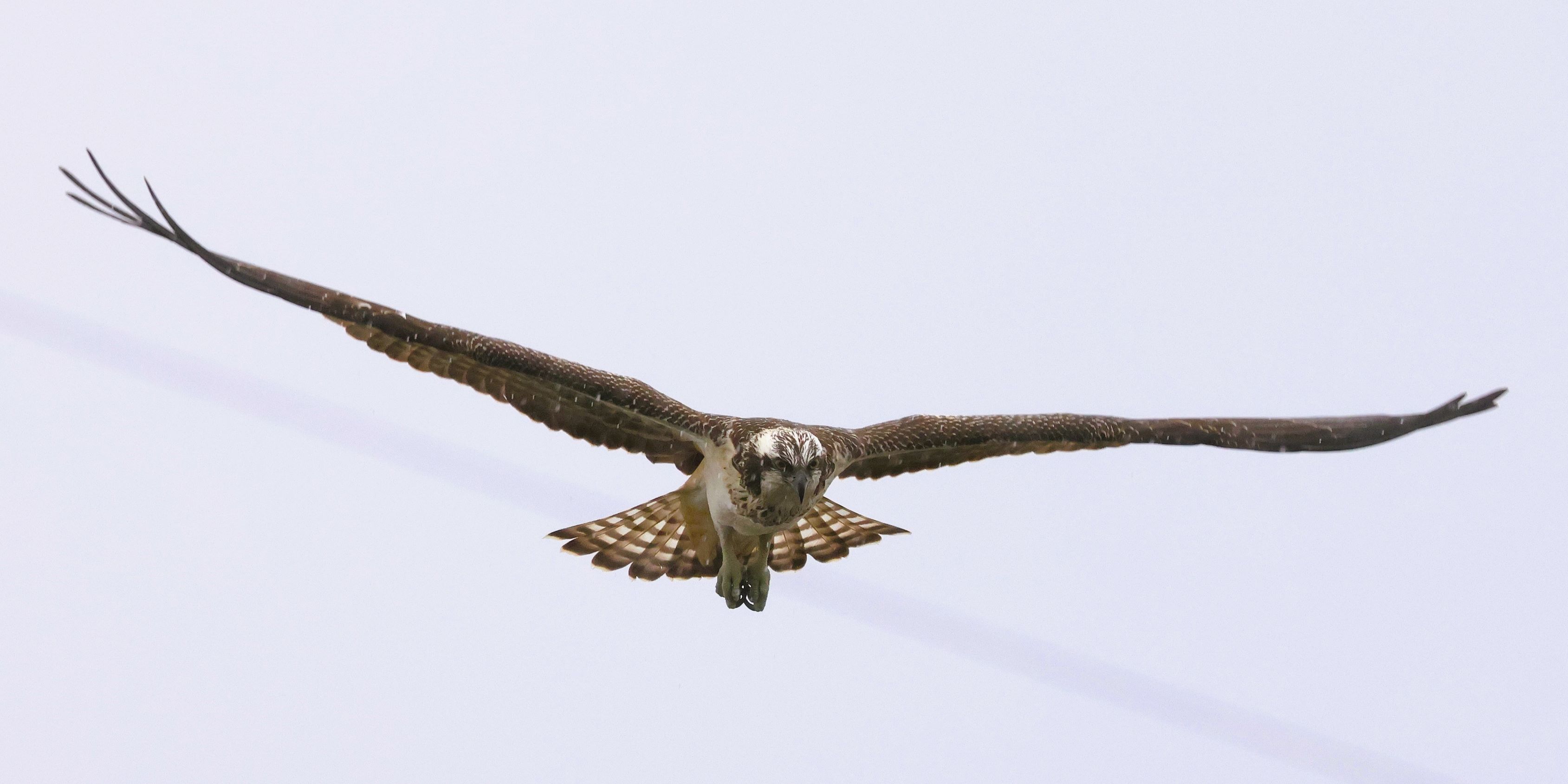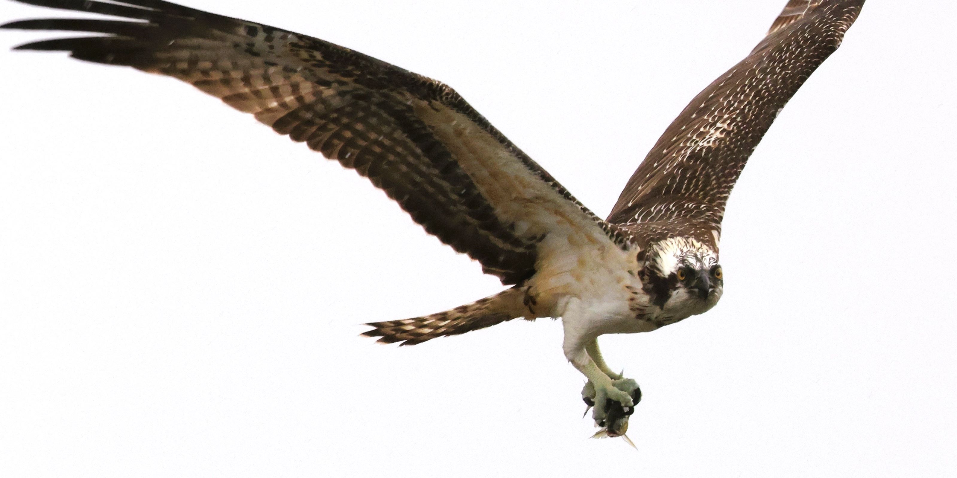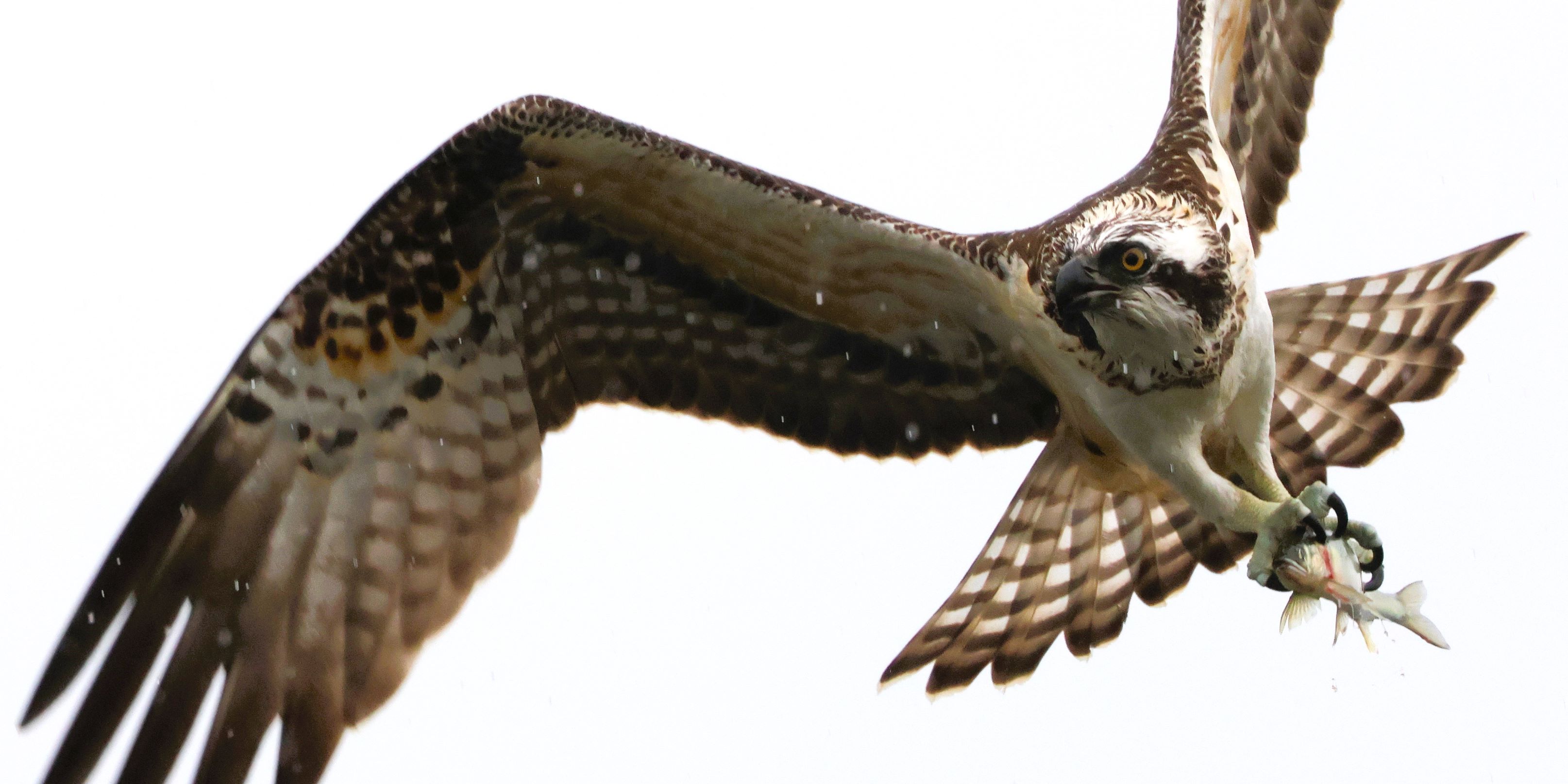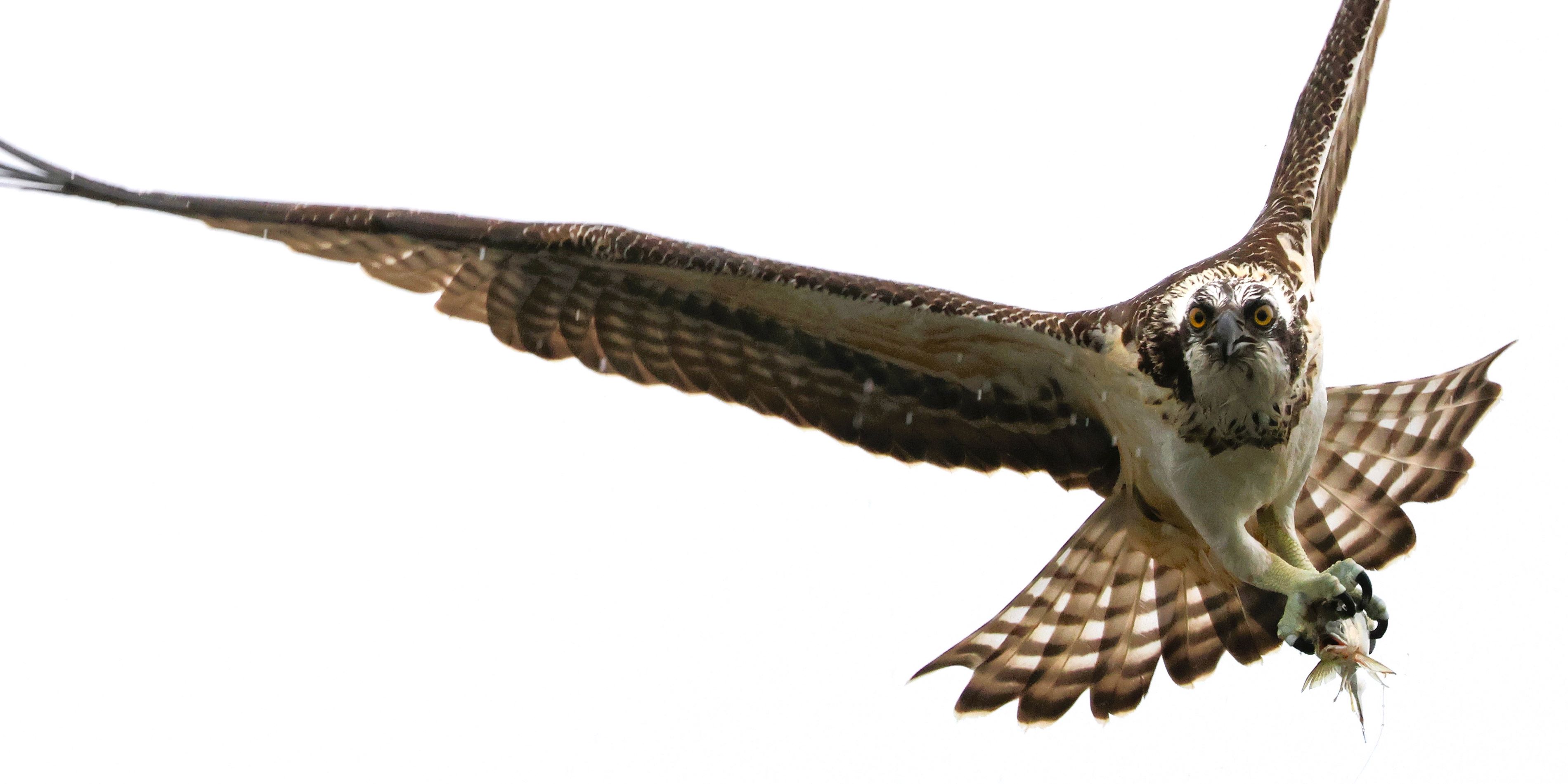 飛び込み態勢のミサゴは、スピード感があって、開いた羽の模様がとても綺麗です。