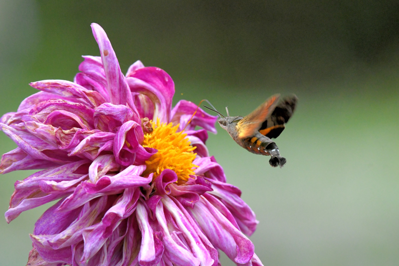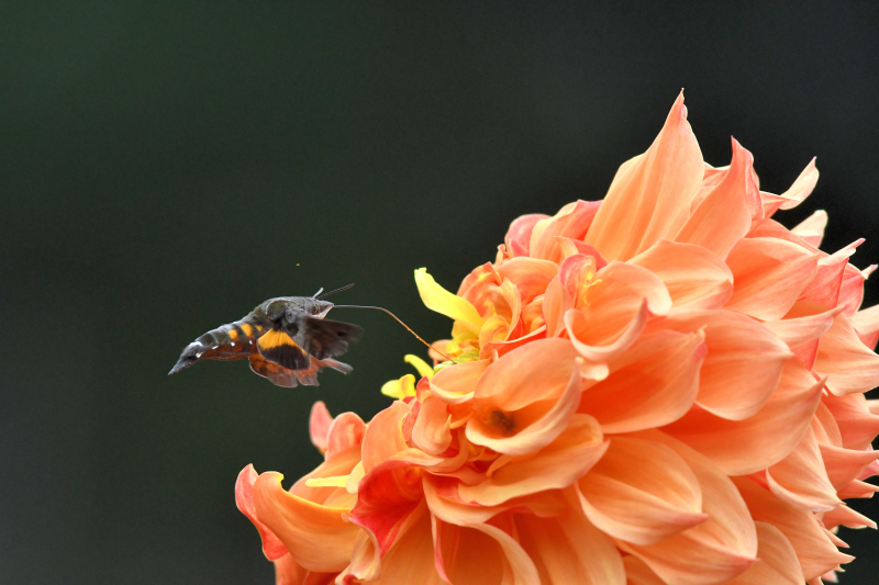 ホシホウジャク2作品は、バックが抜けて2色の鮮やかなダリアの花の蜜を吸いに飛来した所を捉え、ホバーリング中で目に光が入って、羽がブレてとても描写が鮮やかで躍動感があります。